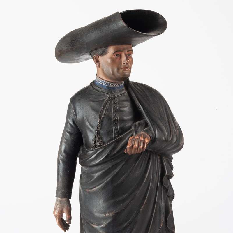 The tradition of the esculturas en barro was a speciality of Málaga begun early in the eighteenth century, gaining wider recognition only after the English antiquarian Francis Carter praised the art in a book published on his return from a tour in 1772. Later, during the Romantic period, returning bourgeoisie tourists would bring back sculptures such as these as souvenirs of the place and its common and sometimes dangerous people. More often encountered subjects could include the contrabandista (smuggler), the bailaor (dancer), the campesino (peasant), the torero (bullfighter), and the muletero (muleteer).
