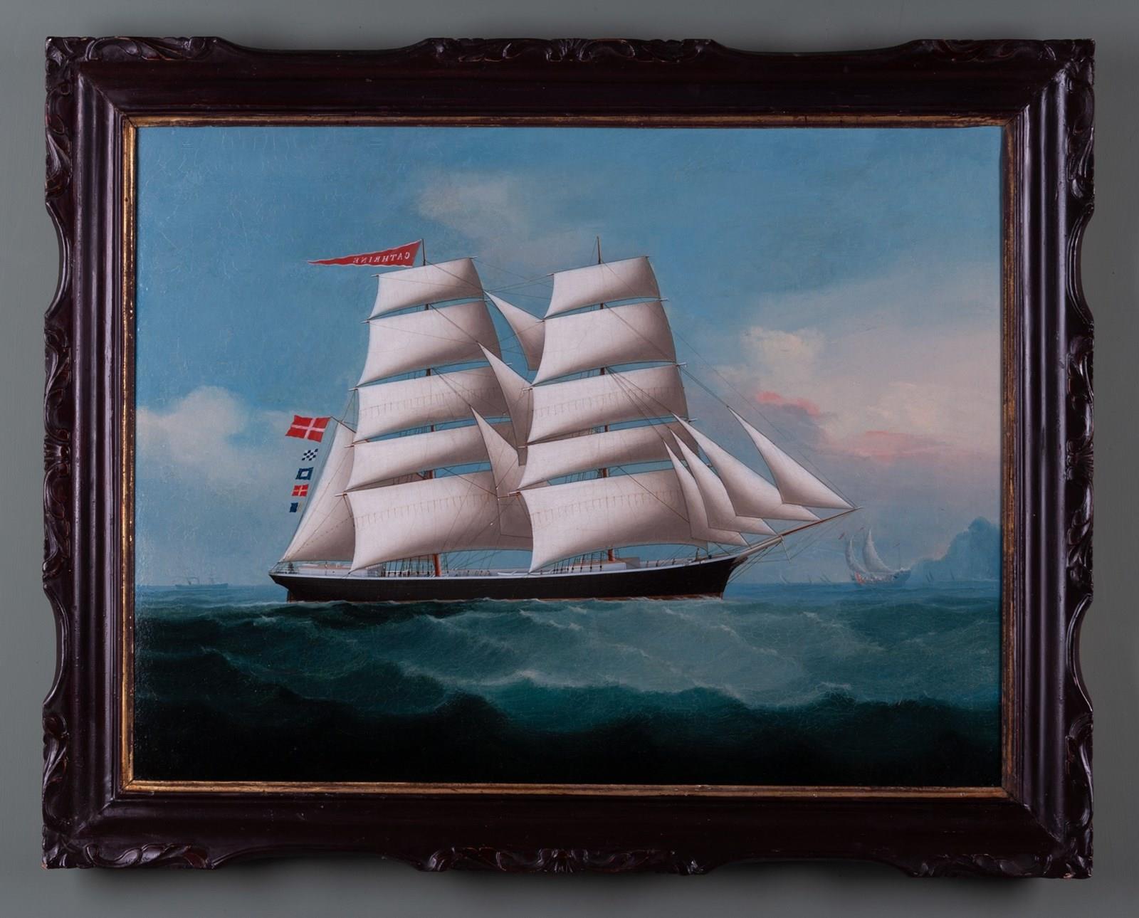 The Brig Cathrine was built by J. R. Schrøder of Fredericia in 1876. Although there were a number of ships named Cathrine in the Danish merchant navy this Chinese artist has faithfully recorded Cathrine's identification flags by the letters NPRK. The vessel was badly damaged in 1895 off the Brazilian coast at Parahyba do Norte resulting in her being written off. She was, however, successfully rebuilt by a local ship builder, C. Moul, and named Camillinho but then not heard of again after 1896.