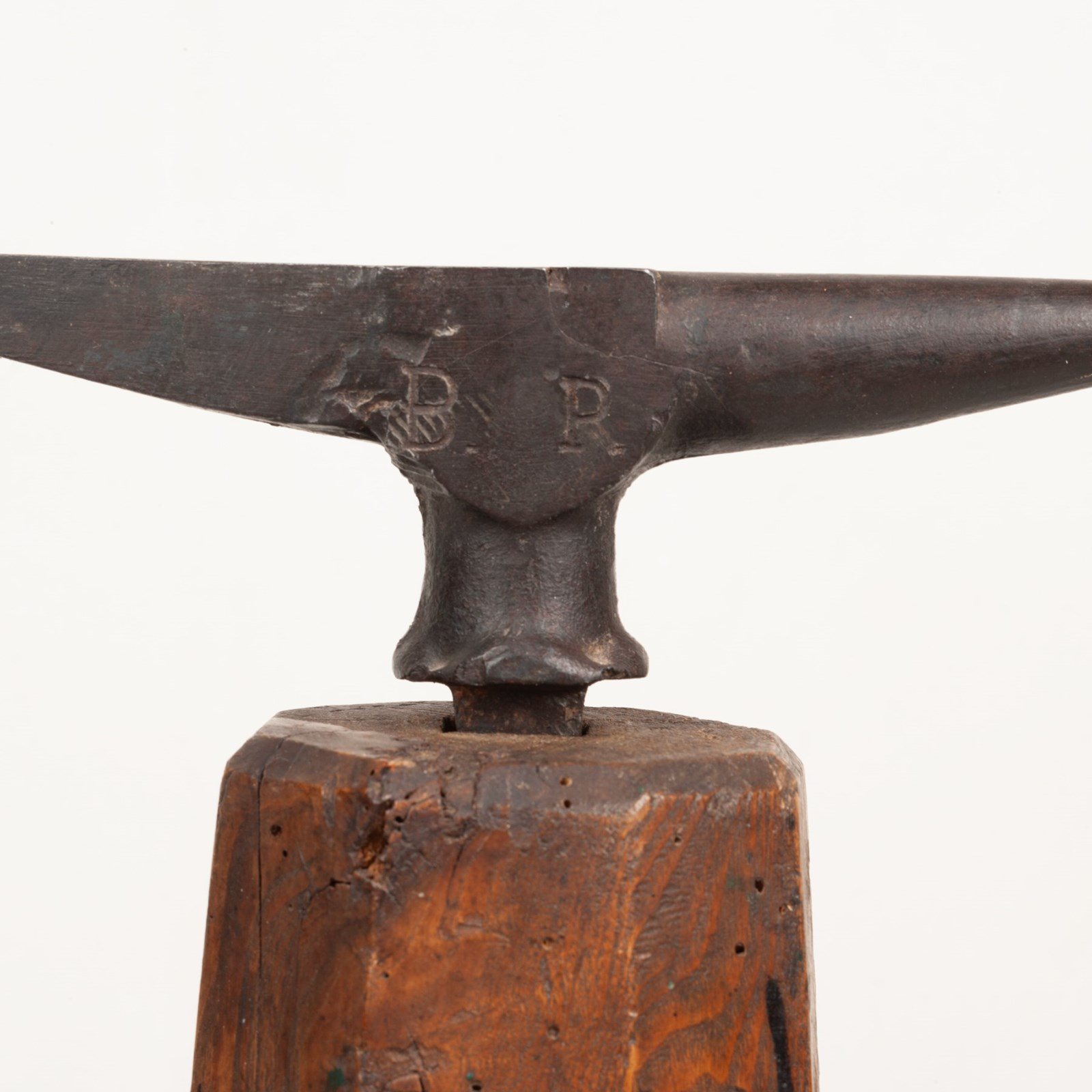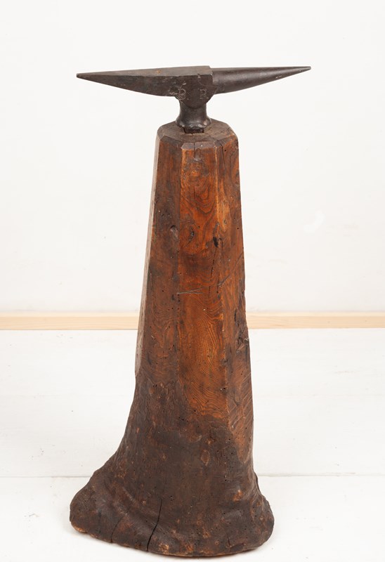 A great looking, sculptural, Tinsmiths' Anvil, the iron stamped with the owner's initials, B.R. and set in a burr elm stump.