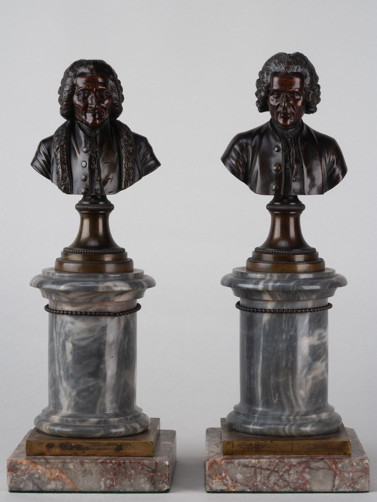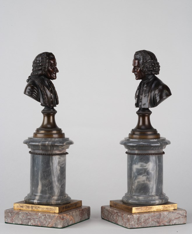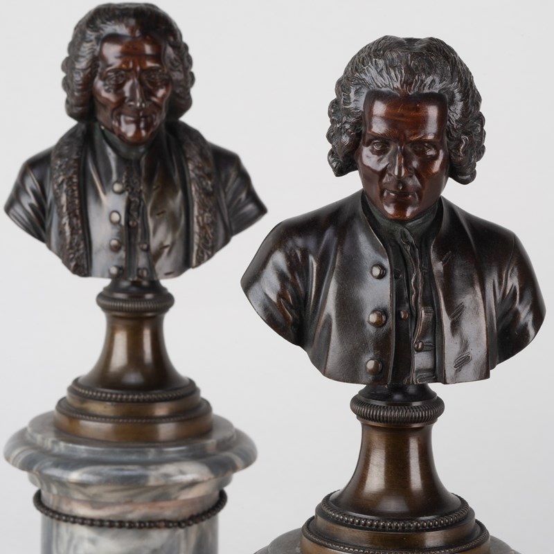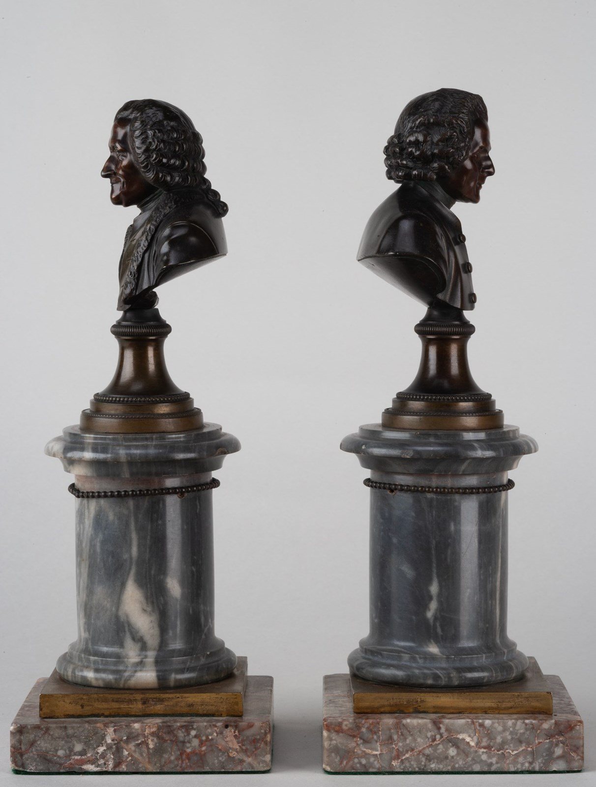When these two heros of the enlightenment died within a few weeks of each other, Houdon seized upon the commercial opportunity to produce his much praised portrait busts as a pair, although their enmity towards each other was well known and to be in each others company was never as cordial as suggested here.