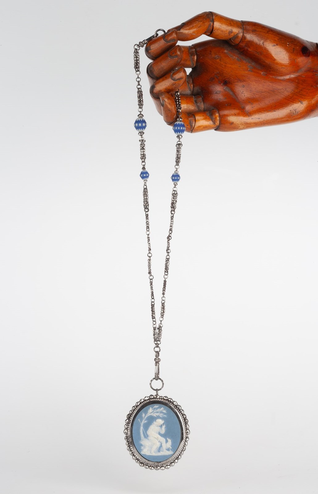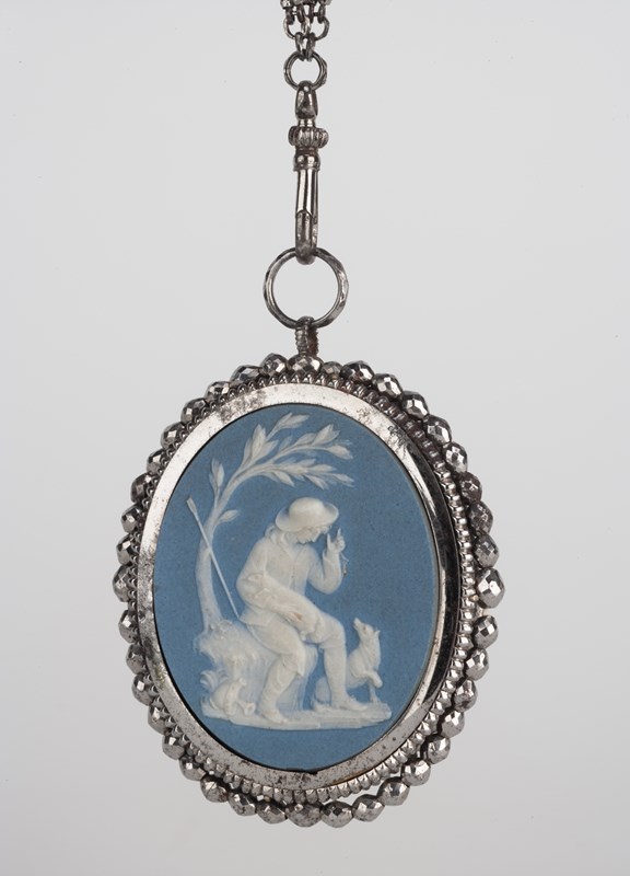 A wonderful Georgian pendant, the front set with a Wedgwood plaque of blue jasper-dip with a white cameo depicting the Bourbonnais Shepherd; a shepherd boy cradling a lamb; his dog beside him.
