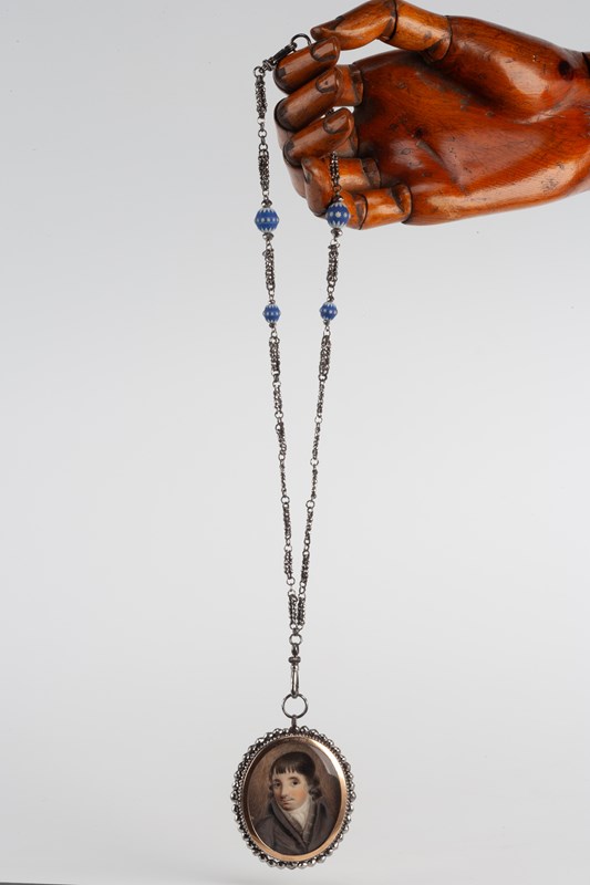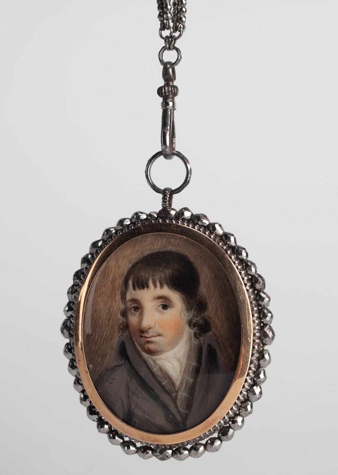 To the reverse is a gold metal bezel framing a portrait miniature of a young man, the whole set within a cut steel frame, likely Birmingham, probably Matthew Boulton, suspended from a conforming chain of cut steel with two pairs of jasper-dip beads.