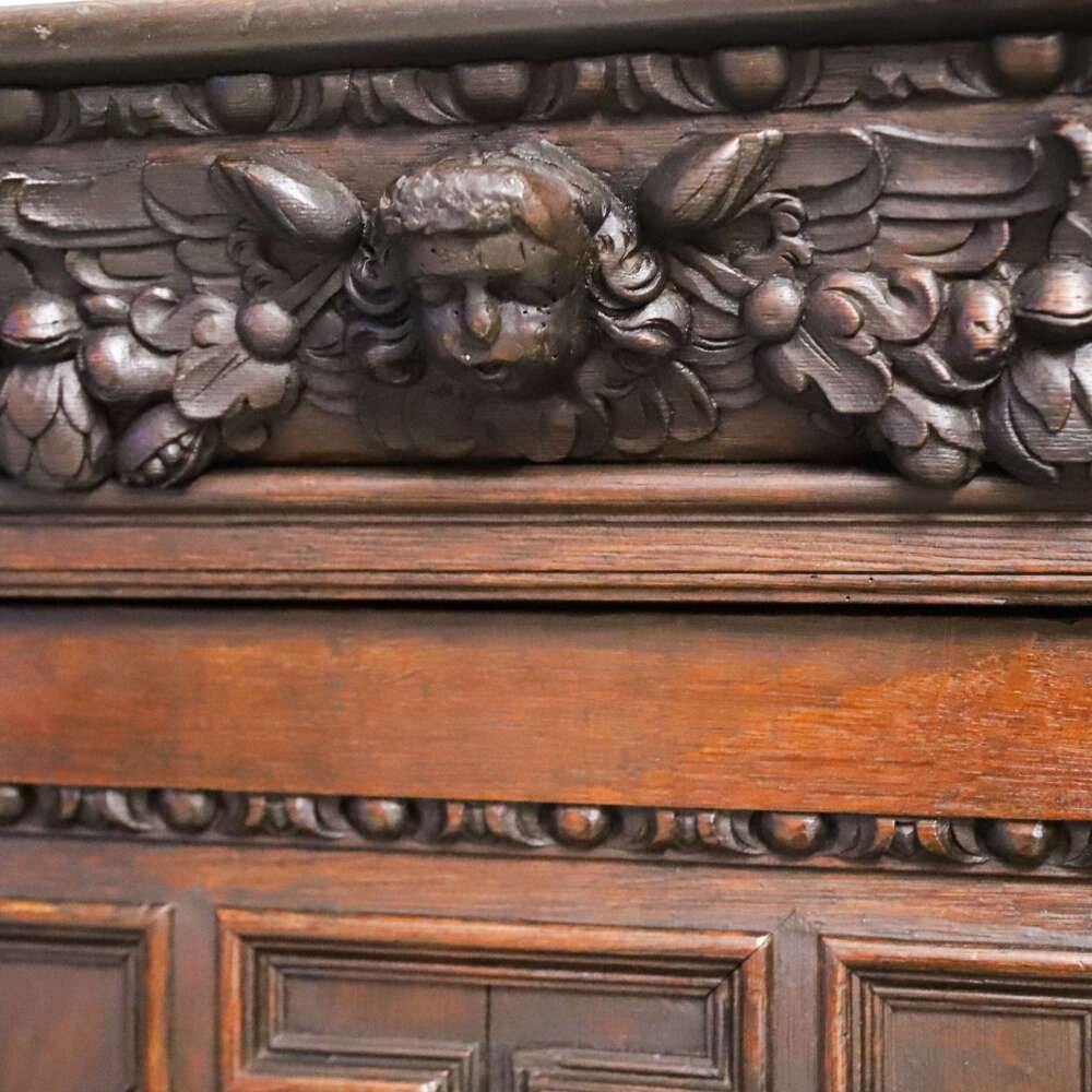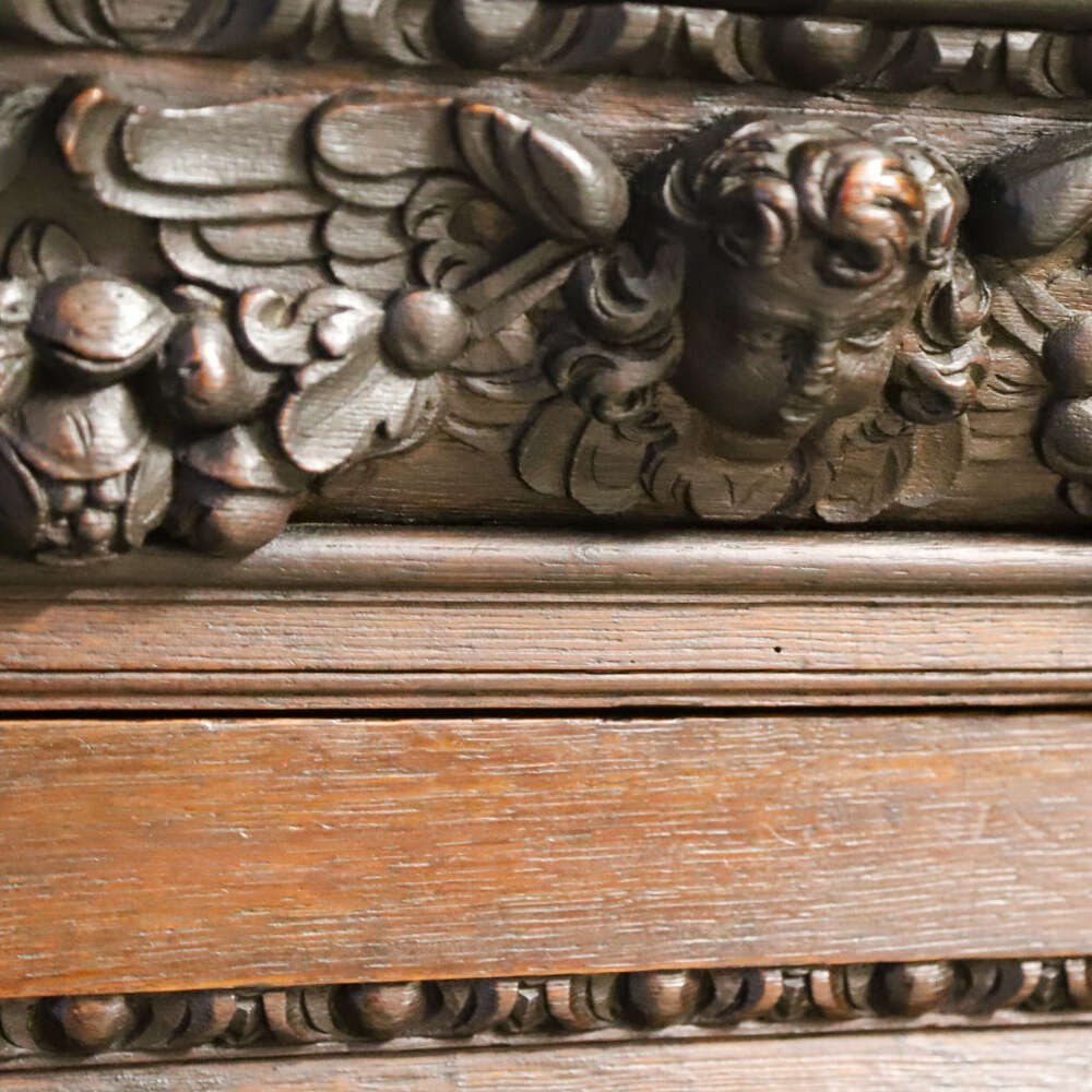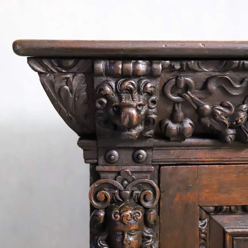 This impressive carved oak cabinet dates from the mid-19th century and is best attributed to the Flemish or Northern European tradition, where deeply worked oak furniture continued to celebrate Renaissance forms, symbolism and architectural strength long after they had faded elsewhere.