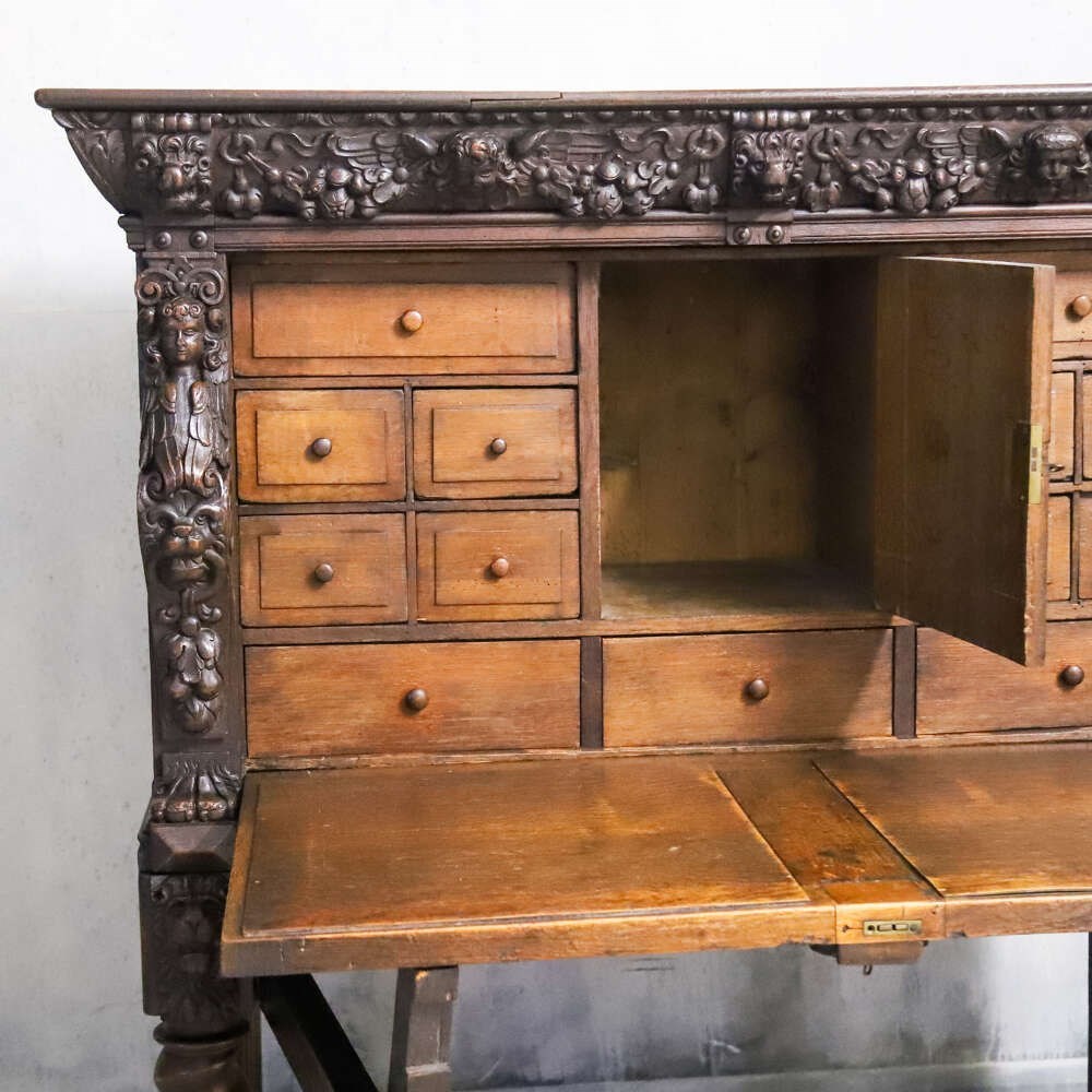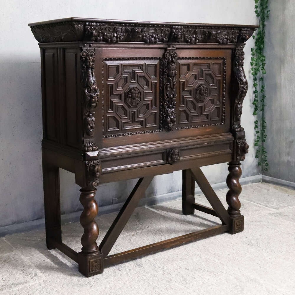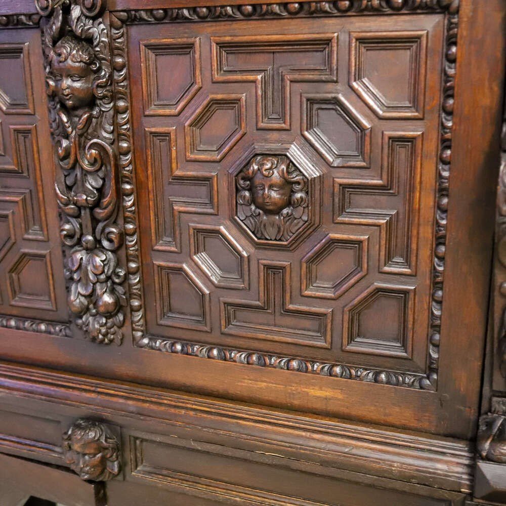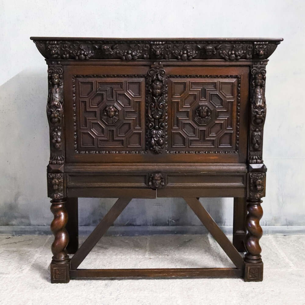 This impressive carved oak cabinet dates from the mid-19th century and is best attributed to the Flemish or Northern European tradition, where deeply worked oak furniture continued to celebrate Renaissance forms, symbolism and architectural strength long after they had faded elsewhere.