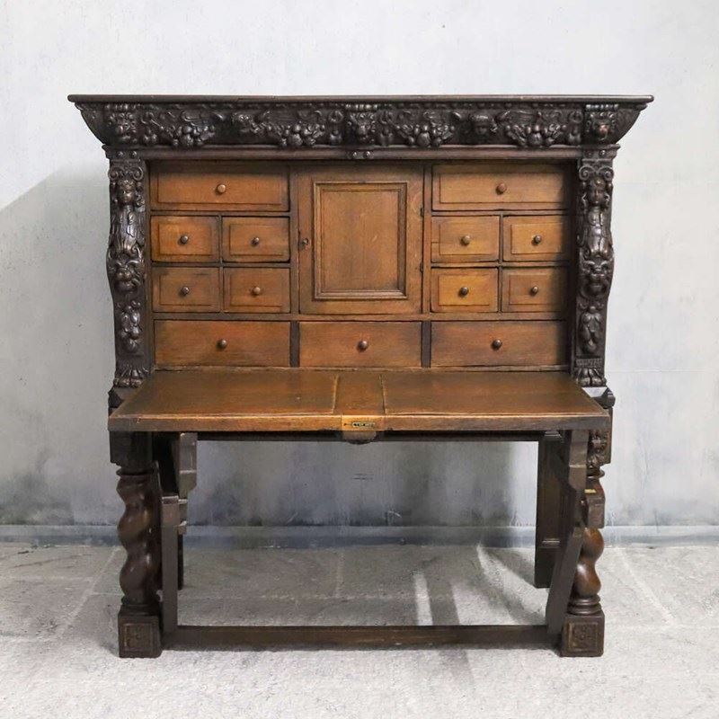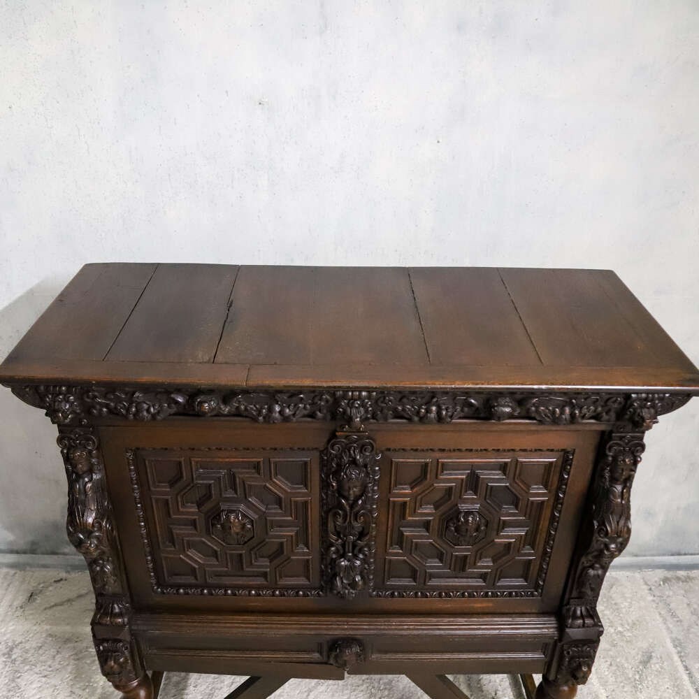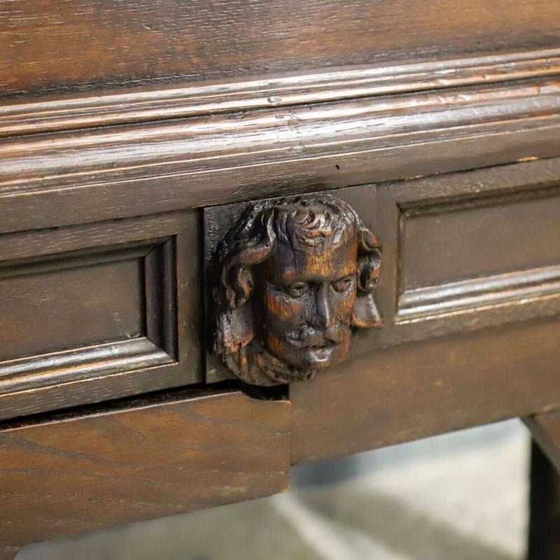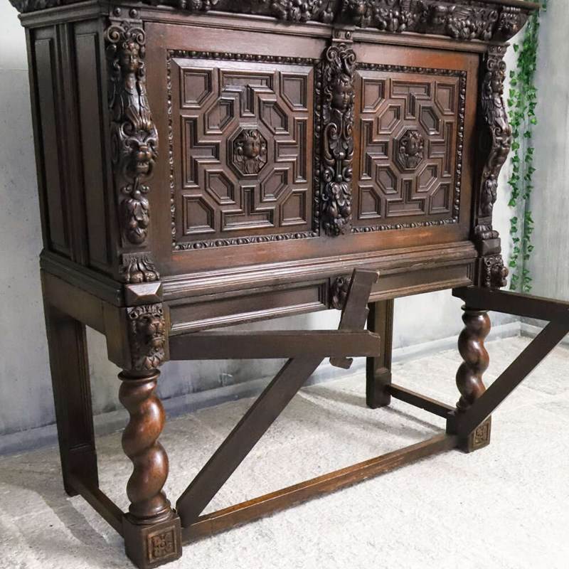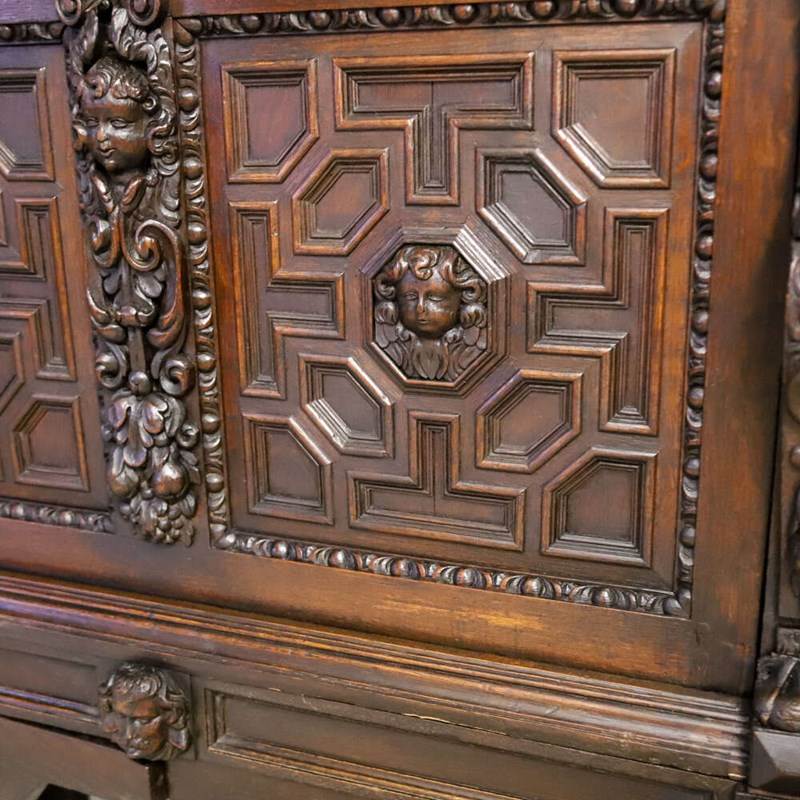 During the mid-19th century, Flemish and Northern European workshops experienced a renewed interest in Renaissance and early Baroque furniture forms, often referred to as Renaissance Revival; at this time in England the Victorian Gothic revival was also prominent and this is very fitting within this era too. Oak remained the material of choice, prized for its durability, richness and suitability for deep carving.