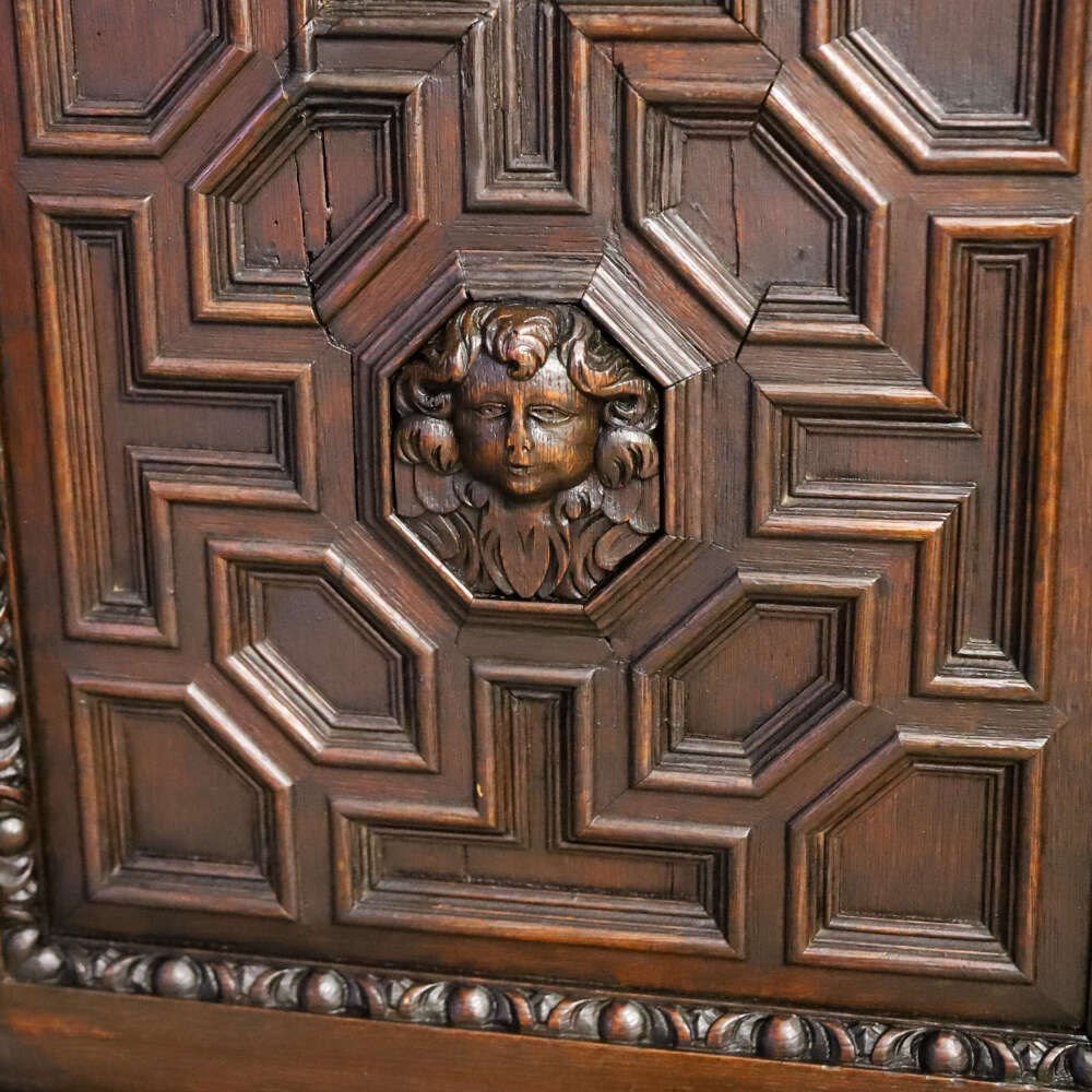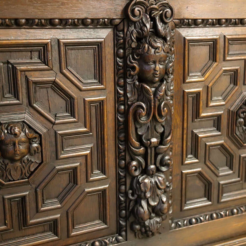 The façade is richly carved with bold geometric panels centred by expressive masks, flanked by vertical carved pilasters and crowned by a frieze of scrolling foliage populated with lion heads and grotesque faces. These elements are not merely decorative: they speak to a long tradition of symbolic carving, where lions represented strength, guardianship and authority, while grotesque and cherubic masks added both visual drama and protective connotations.