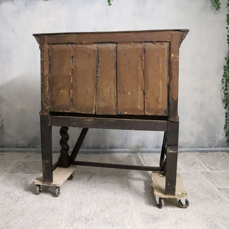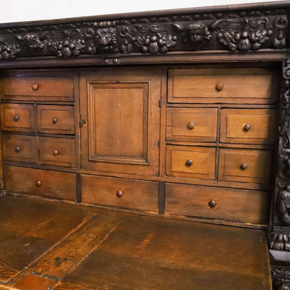 The cabinet opens to reveal a thoughtfully arranged interior of small drawers over a central cupboard space, originally intended for the organised storage of documents, valuables or household accounts. Raised on a decorative and robust oak stand, the piece gains presence and practicality while maintaining stylistic sympathy with the upper cabinet.