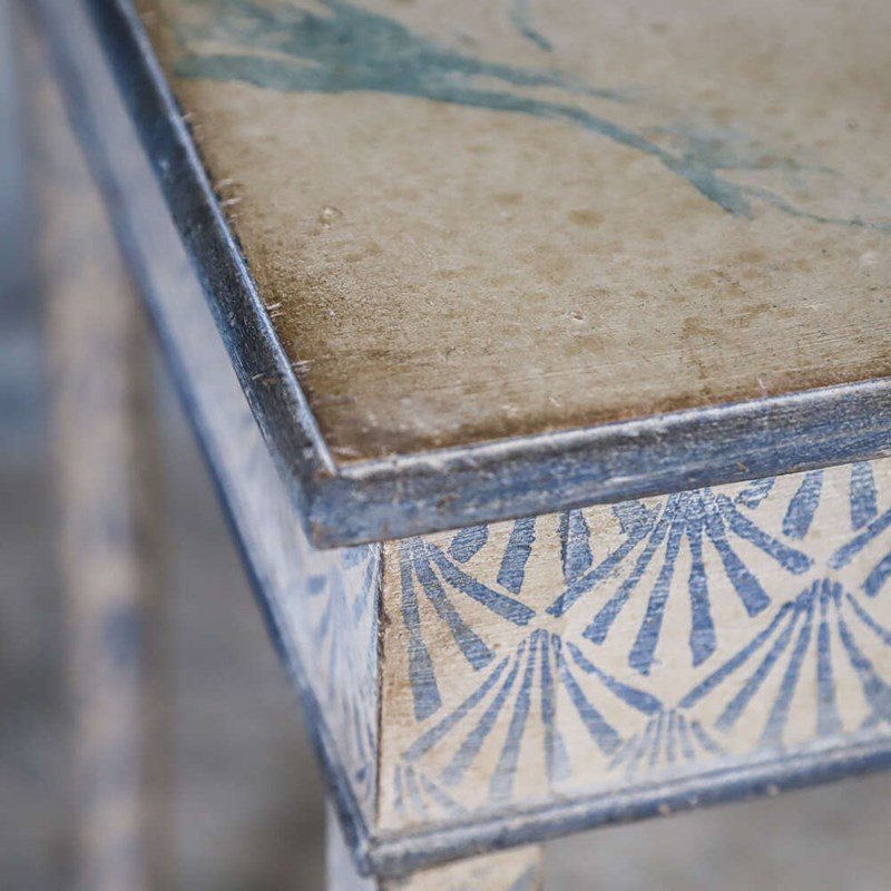 The later finish of a Specialist Distressed Mottled Paint with a powdery effect is applied using a skilled technique entirely by hand. The individually mixed Antique White paint is applied by hand to the table and legs as a background colour and then the top has a hand painted faux marble design where the heavily distressed and powdery Antique Rich Blue veining is applied. The additional hand painted, intricate repeating decorative design to the apron and legs is applied using the same Antique Rich Blue. The top is particularly stunning and a lovely contrast to the more decorative apron and square tapered legs.