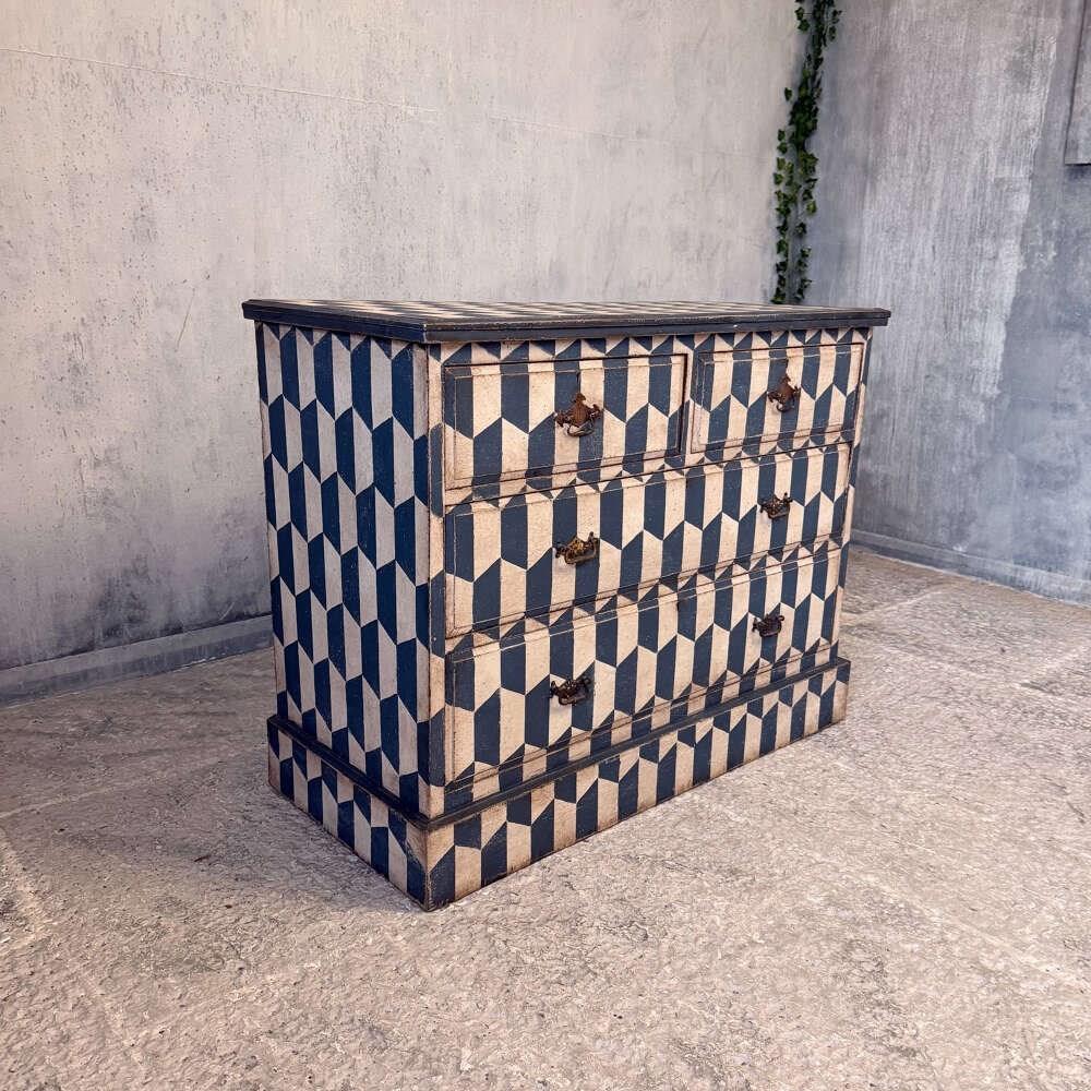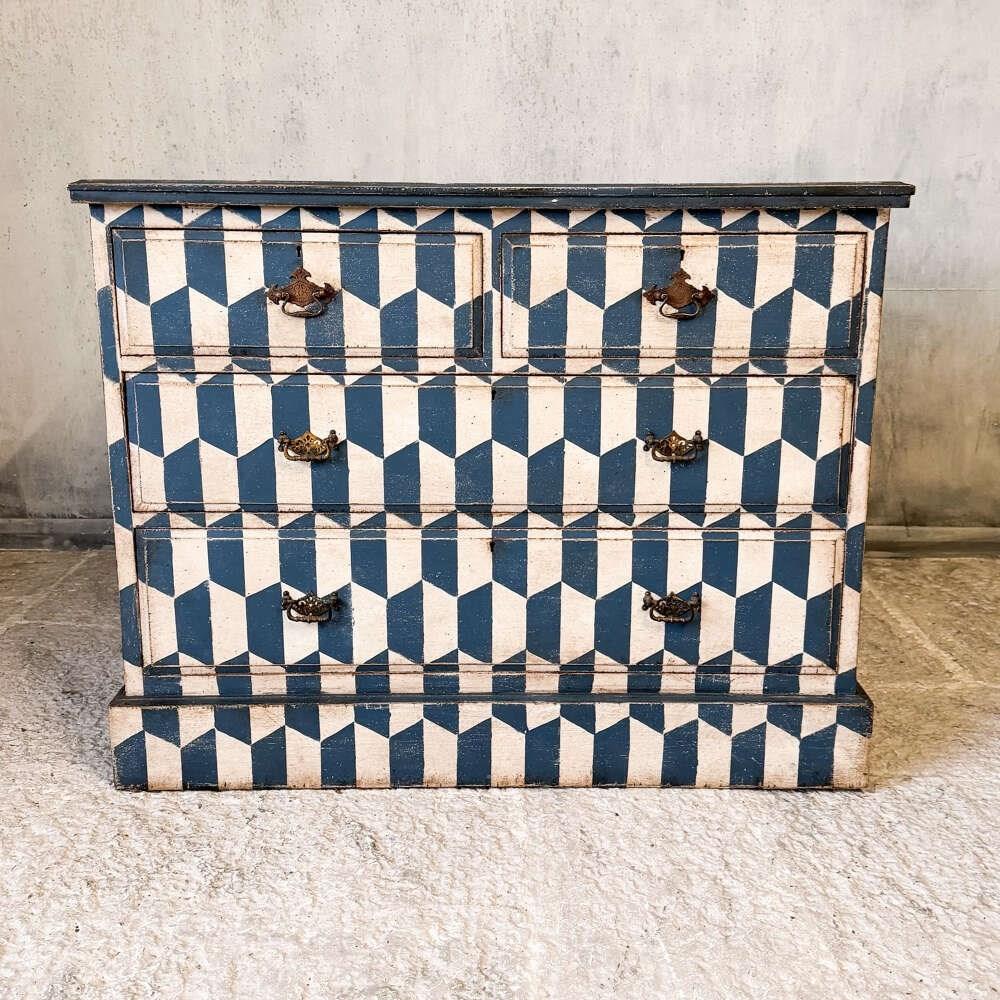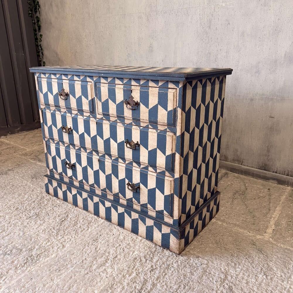English Edwardian chest of drawers, later hand painted with a bold geometric blue and white design - traditional cabinet making with period brass handles