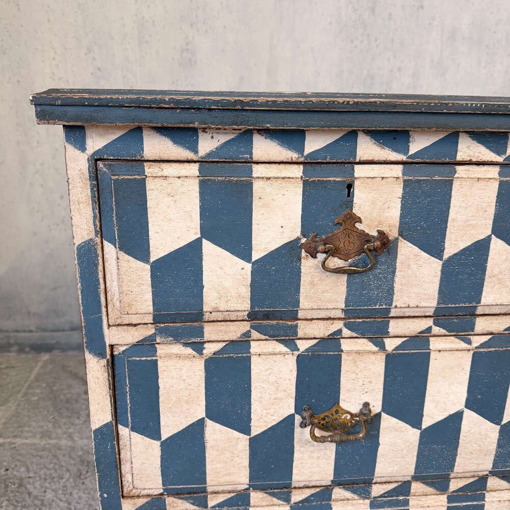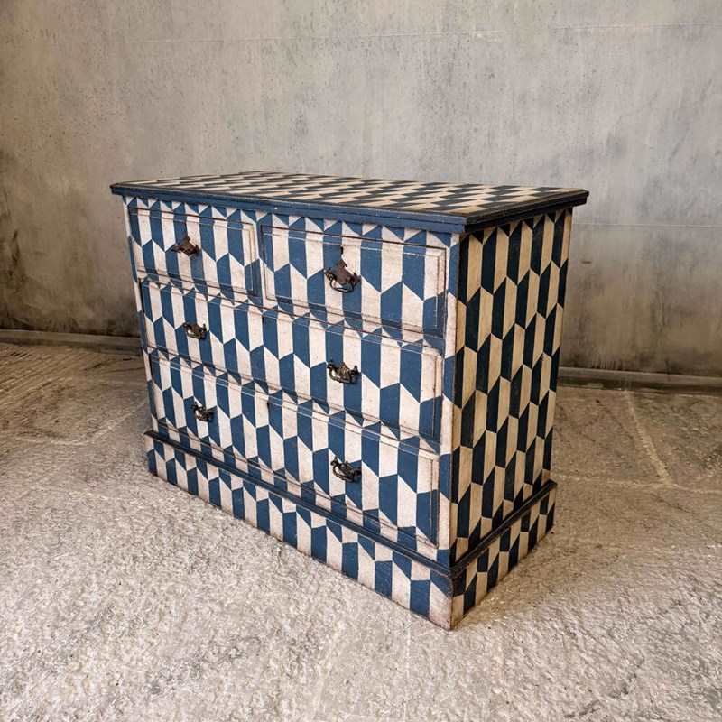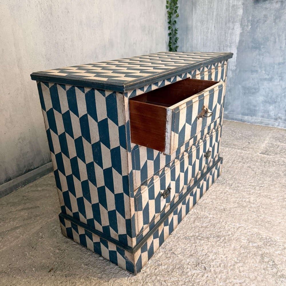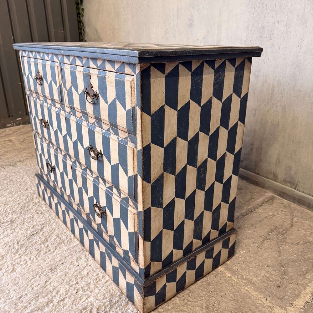 English Edwardian chest of drawers, later hand painted with a bold geometric blue and white design - traditional cabinet making with period brass handles
