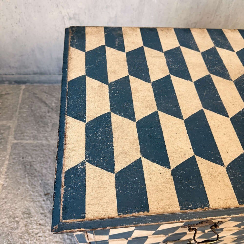 The exterior has been later hand painted in a bold geometric pattern using Specialist Distressed Mottled Chalky Antique White with Mottled Chalky Inky Blue as the contrasting colour. The finish has been applied by hand and gently distressed to create surface depth and a sense of age, while allowing the form of the chest to remain dominant.