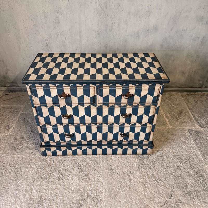 Discover the perfect fusion of historical legacy, artisanal craftsmanship, and modern sustainable design with this charming delightful Straight Fronted Chest of Drawers with a later Geometric Design Specialist Distressed Mottled Chalky Antique White with Mottled Chalky Inky Blue as the geometric contrast paint finish to the exterior. It features 2 top smaller drawers across the top with a further 2 larger sized drawers below.