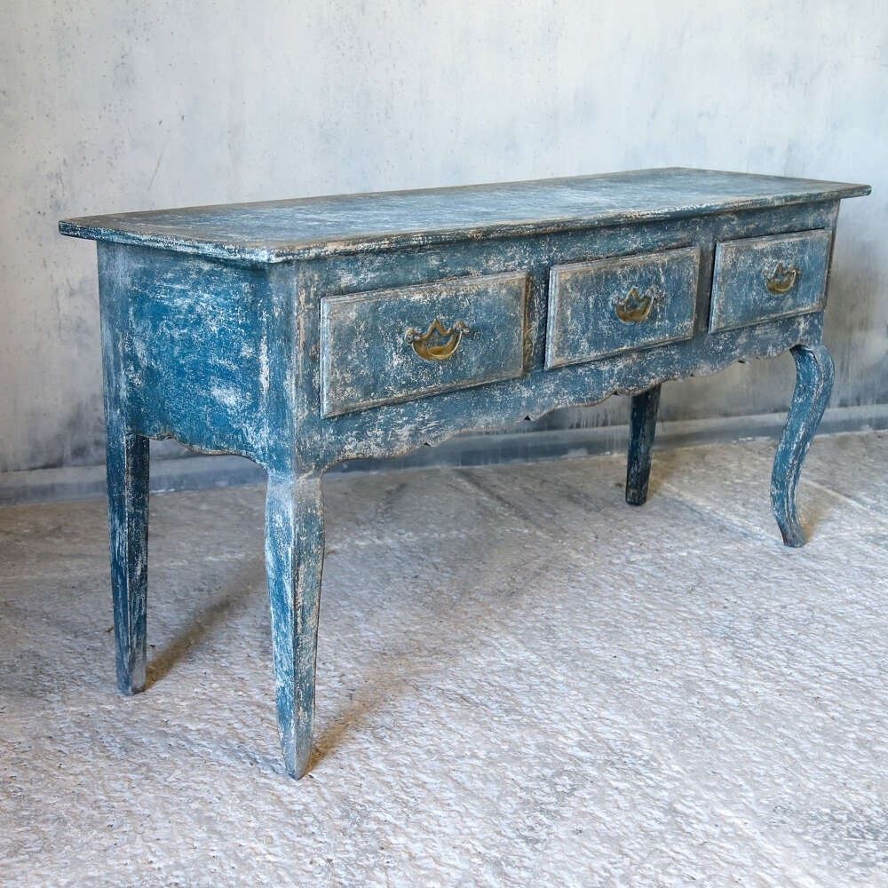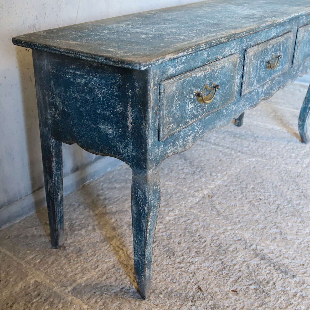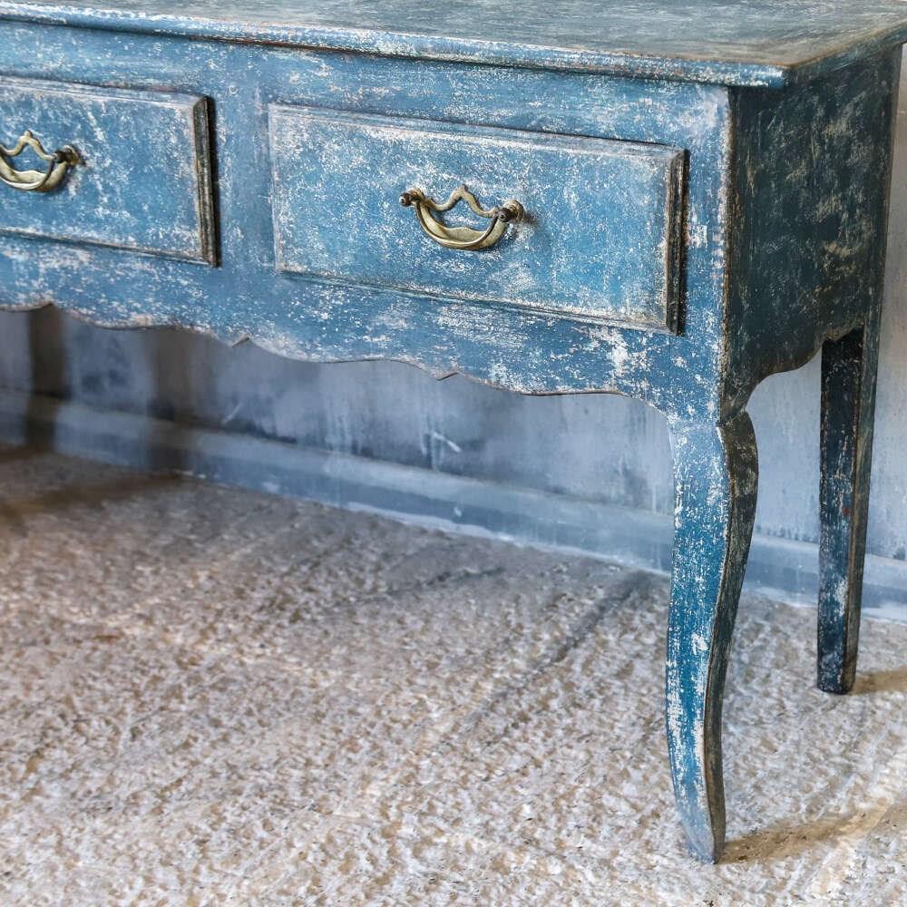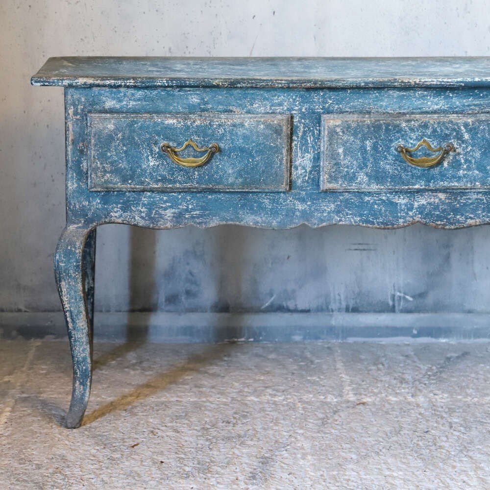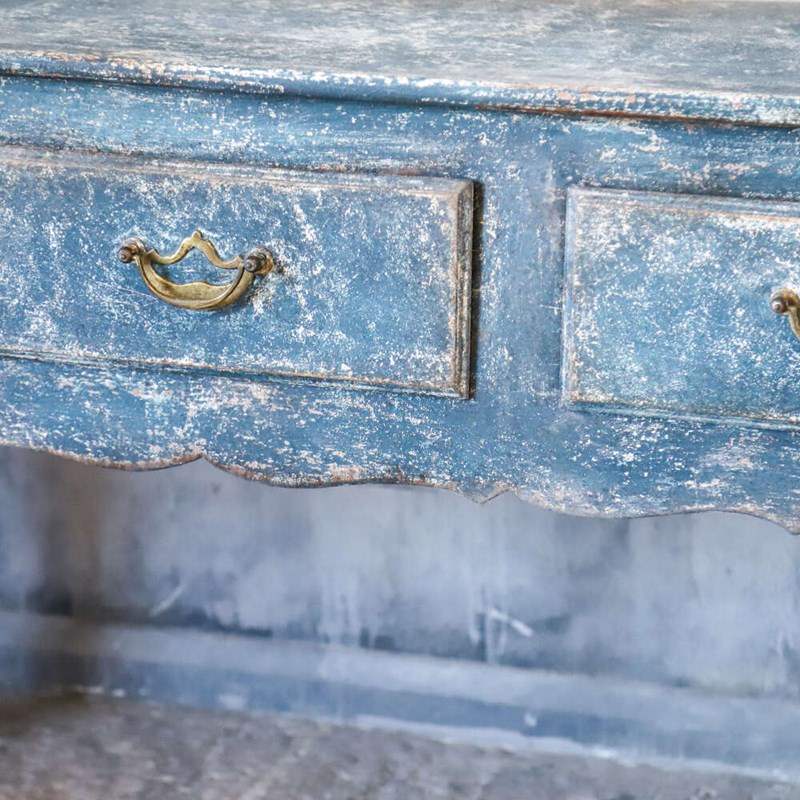Finished in a later specialist paint finish, the surface has been carefully layered to create a mottled, distressed antique chalky blue appearance. Subtle variations in tone, areas of gentle wear, and softened edges give the piece depth, texture, and an honest sense of age, while allowing the underlying form to remain calm and elegant.