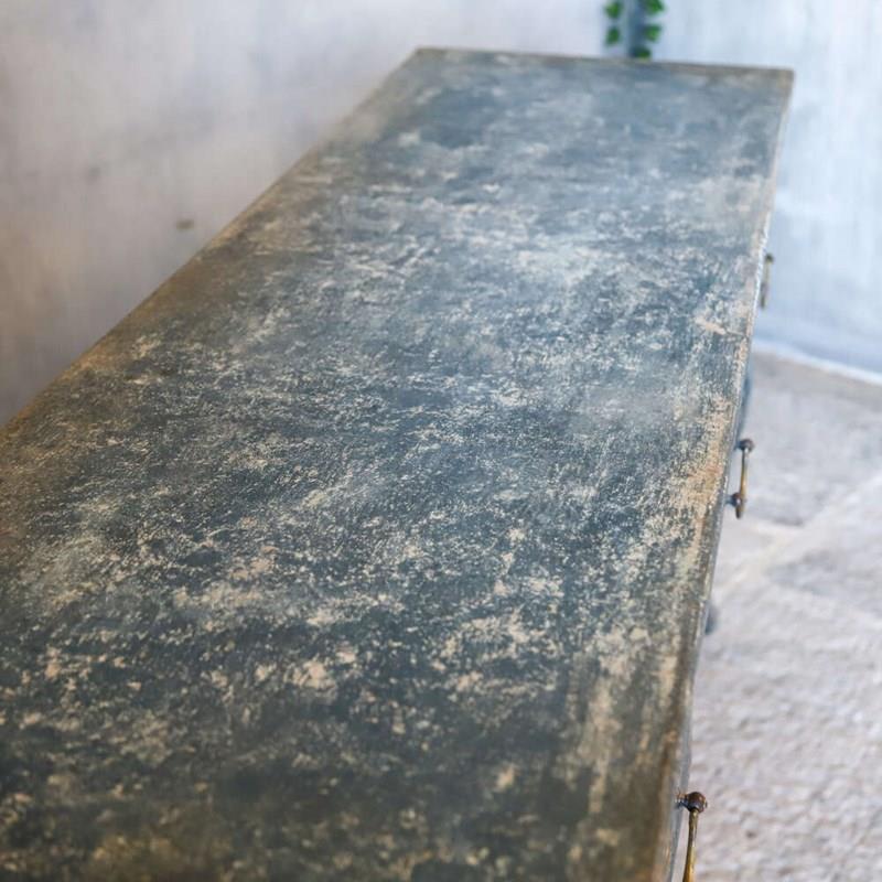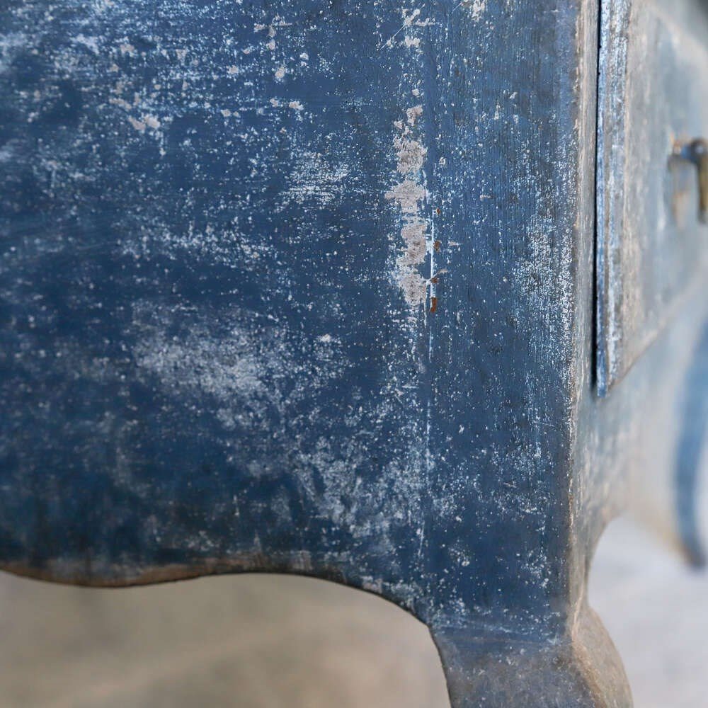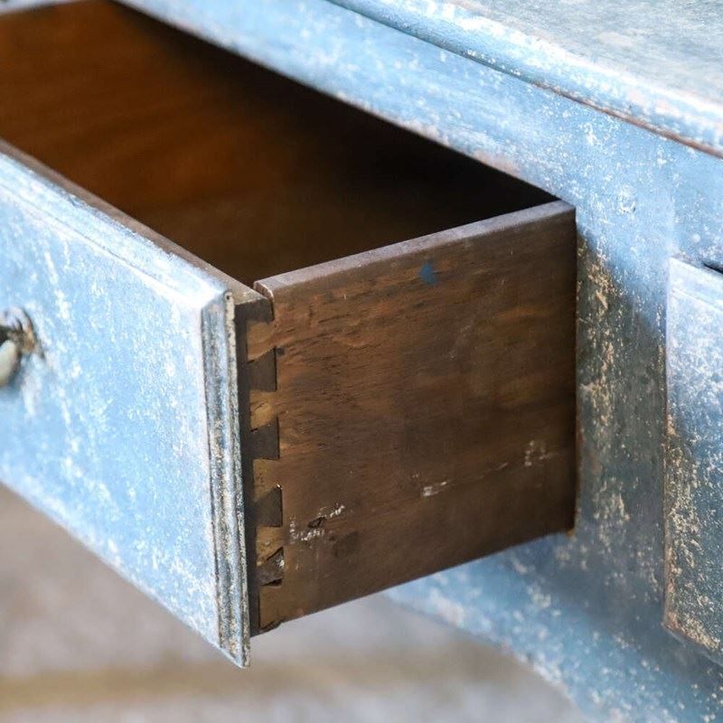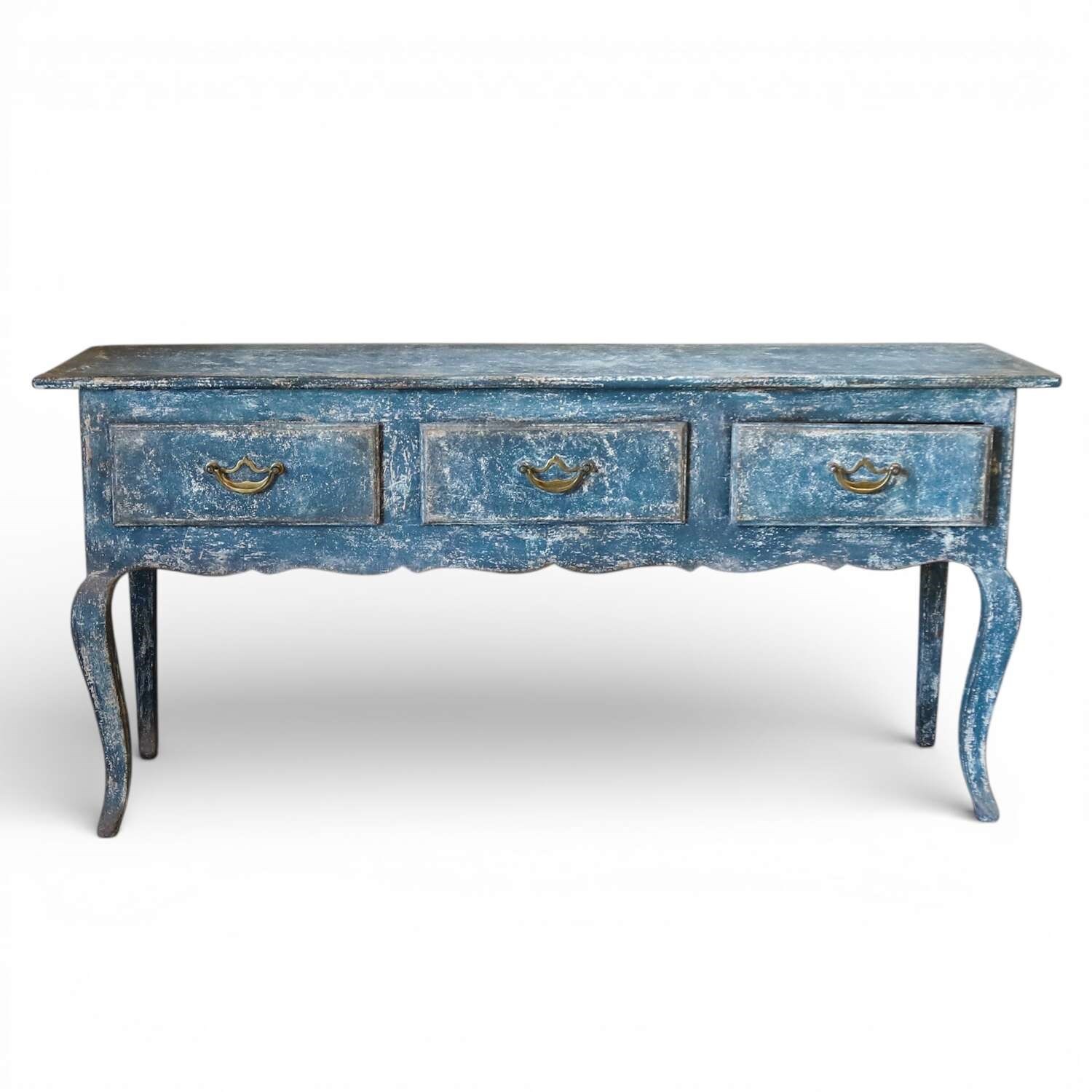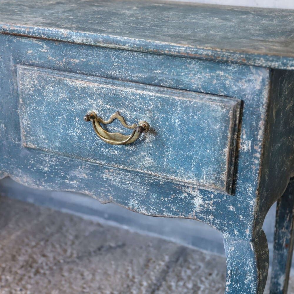 Finished in a later specialist paint finish, the surface has been carefully layered to create a mottled, distressed antique chalky blue appearance. Subtle variations in tone, areas of gentle wear, and softened edges give the piece depth, texture, and an honest sense of age, while allowing the underlying form to remain calm and elegant.