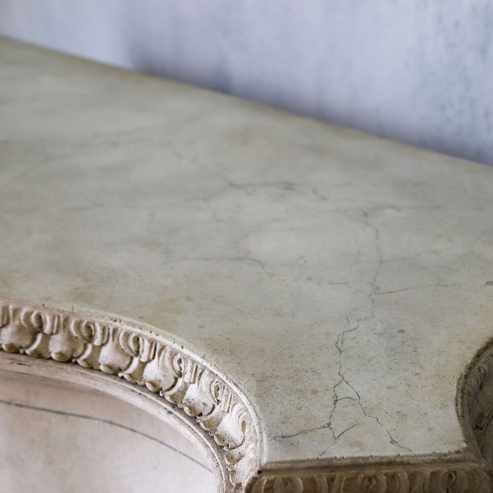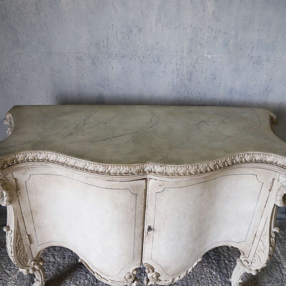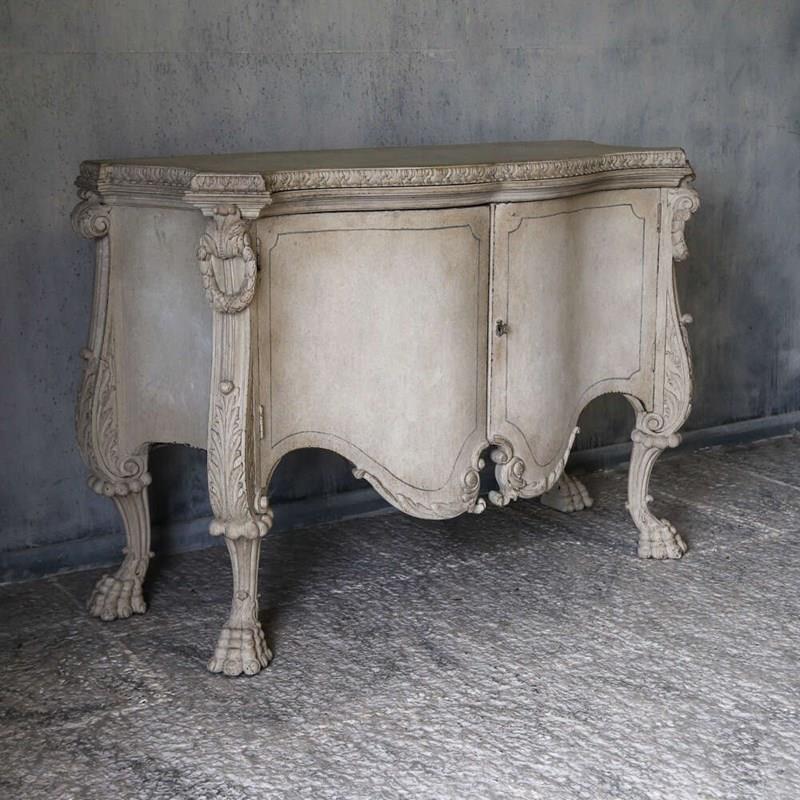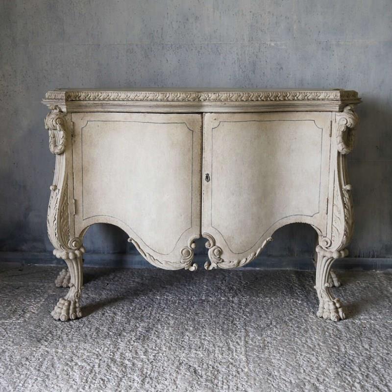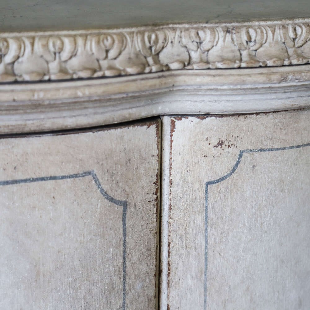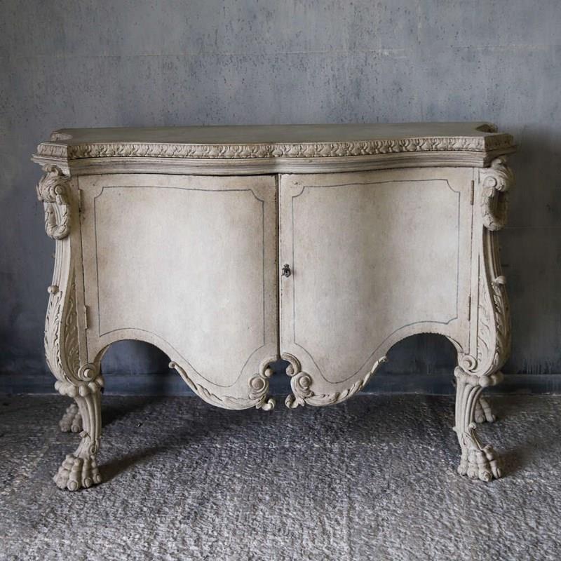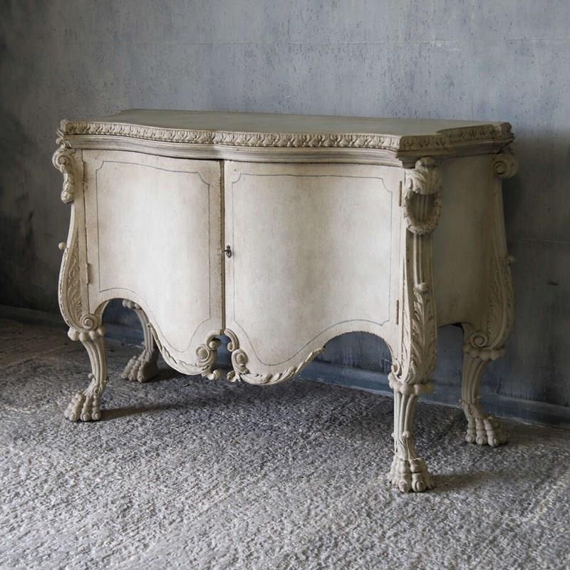 A beautifully decorative Italian serpentine‑shaped cabinet dating from around 1920, raised on wonderfully sculptural mythical‑beast feet. The piece is richly carved, with detailed work around the top moulding and elegant motifs across the doors. Later painted in a soft distressed white, it has a gentle, time‑worn look that enhances its curves and carvings, while the hand‑painted distressed marble top adds depth and sophistication.