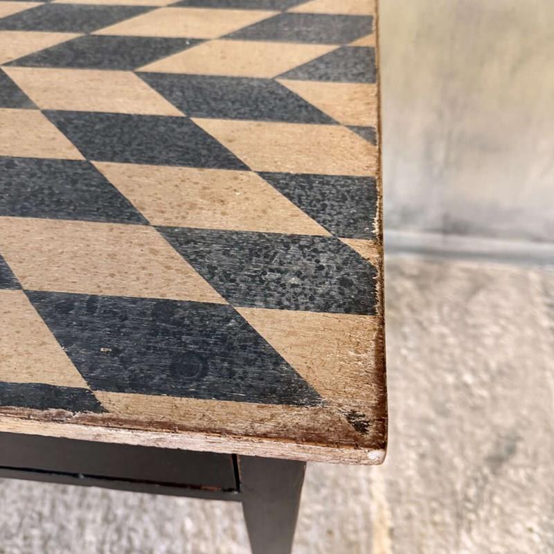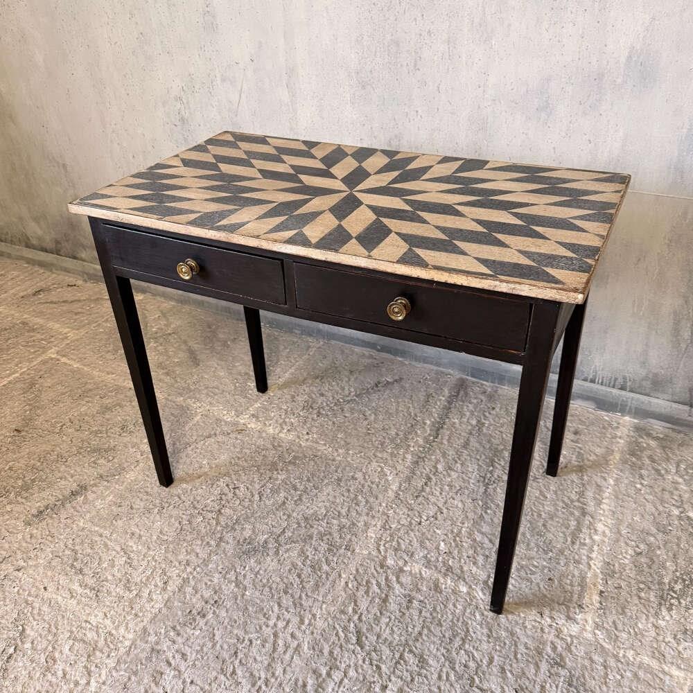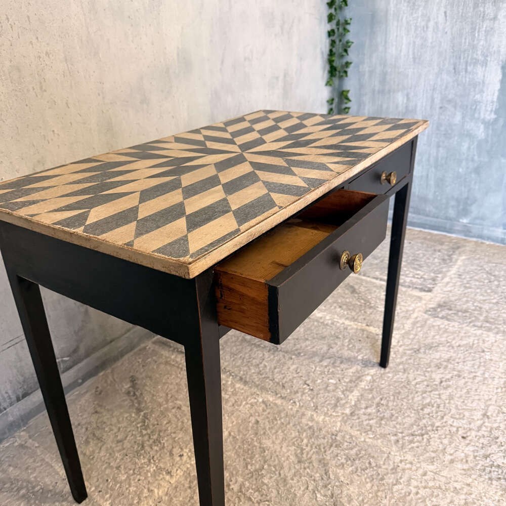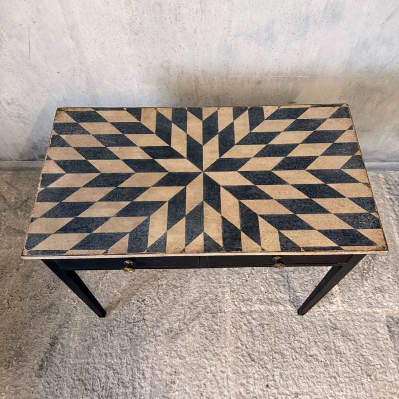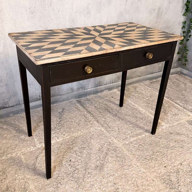 The table has been professionally restored and finished in our workshops using individually hand-mixed specialist paints. The hand-drawn geometric design to the top is carefully calculated for balance and proportion, executed in Mottled Chalky Antique White with Inky Black contrast. The base is finished in a complementary Inky Black. The layered paintwork and gentle edge wear create an authentic patina designed to reflect natural use rather than artificial distress.