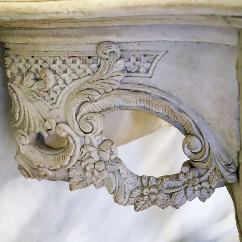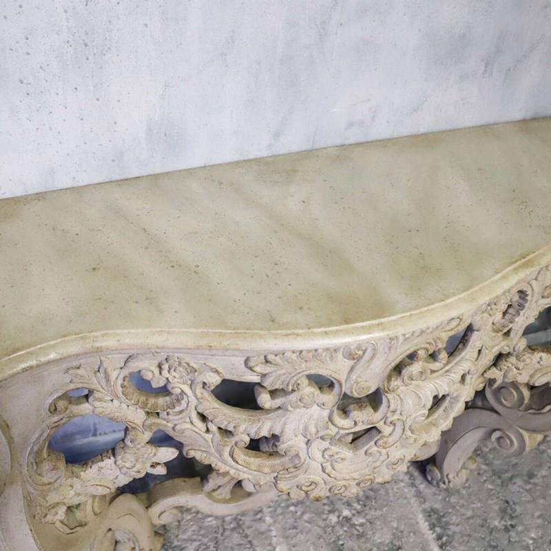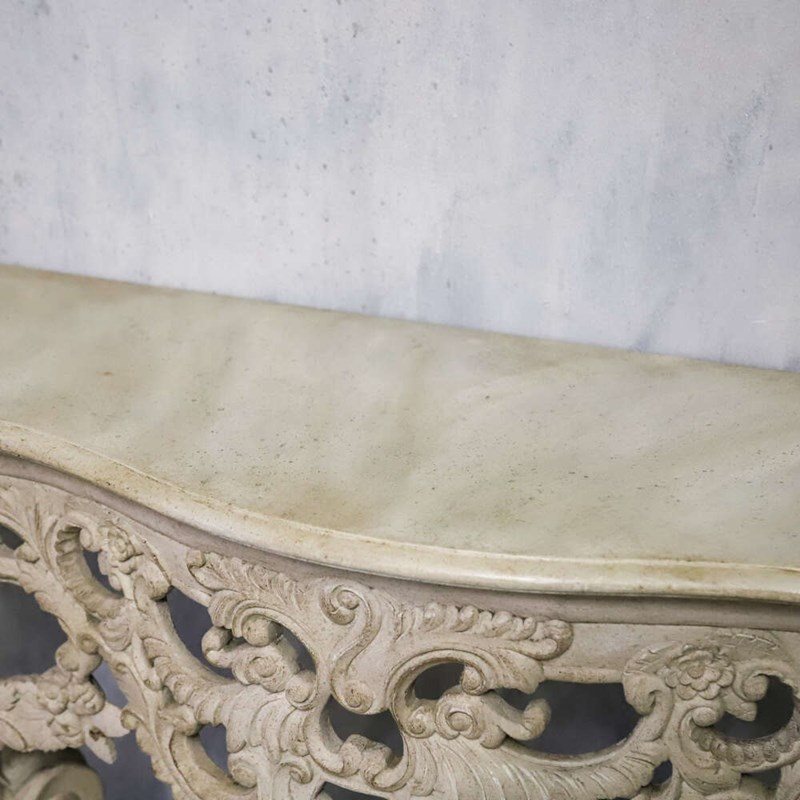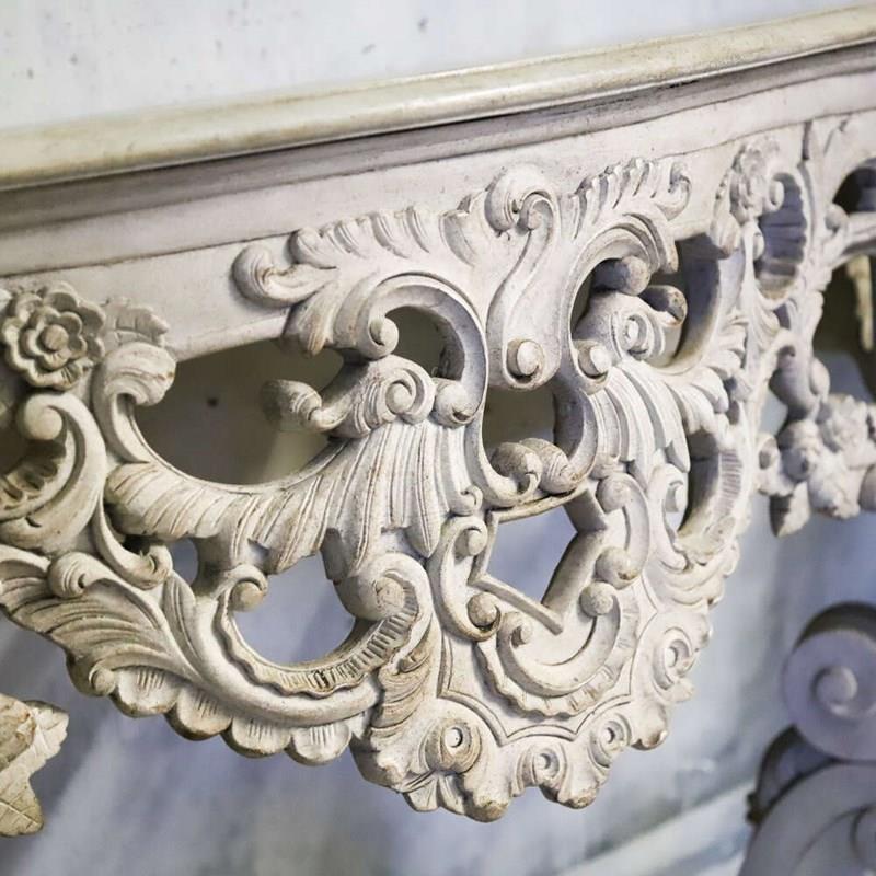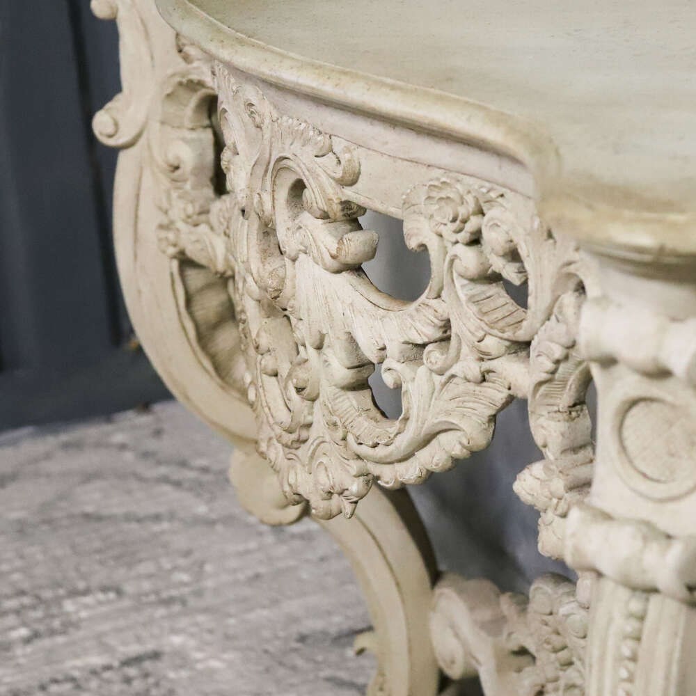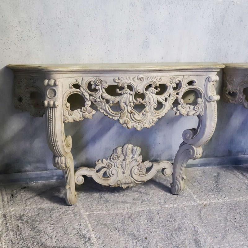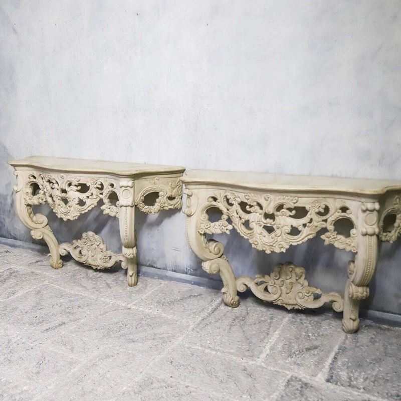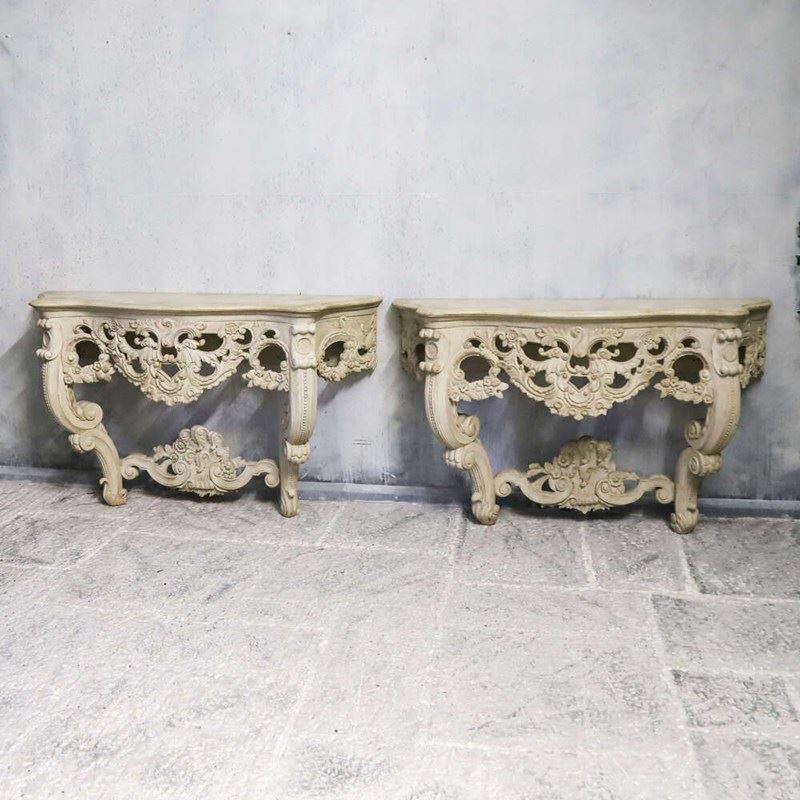 Each table features a shaped top above an intricately pierced frieze, alive with flowing scrollwork, floral motifs and foliate ornament. The carving continues down through the cabriole legs and into the lower stretcher, where a bold central cartouche provides a strong visual anchor. The depth and confidence of the carving throughout is of notably high quality, with crisp detail retained beneath layers of historic paint.