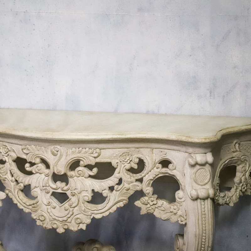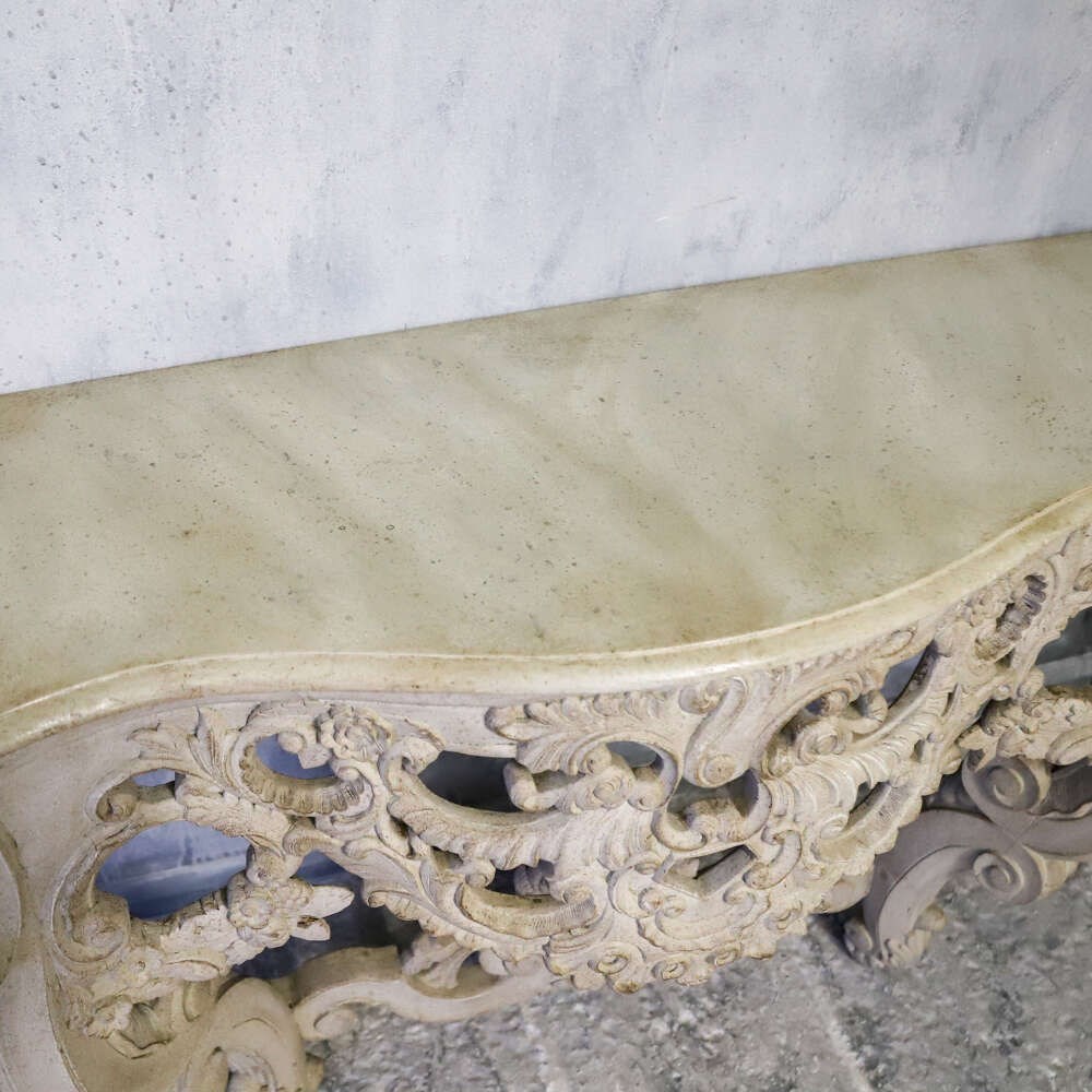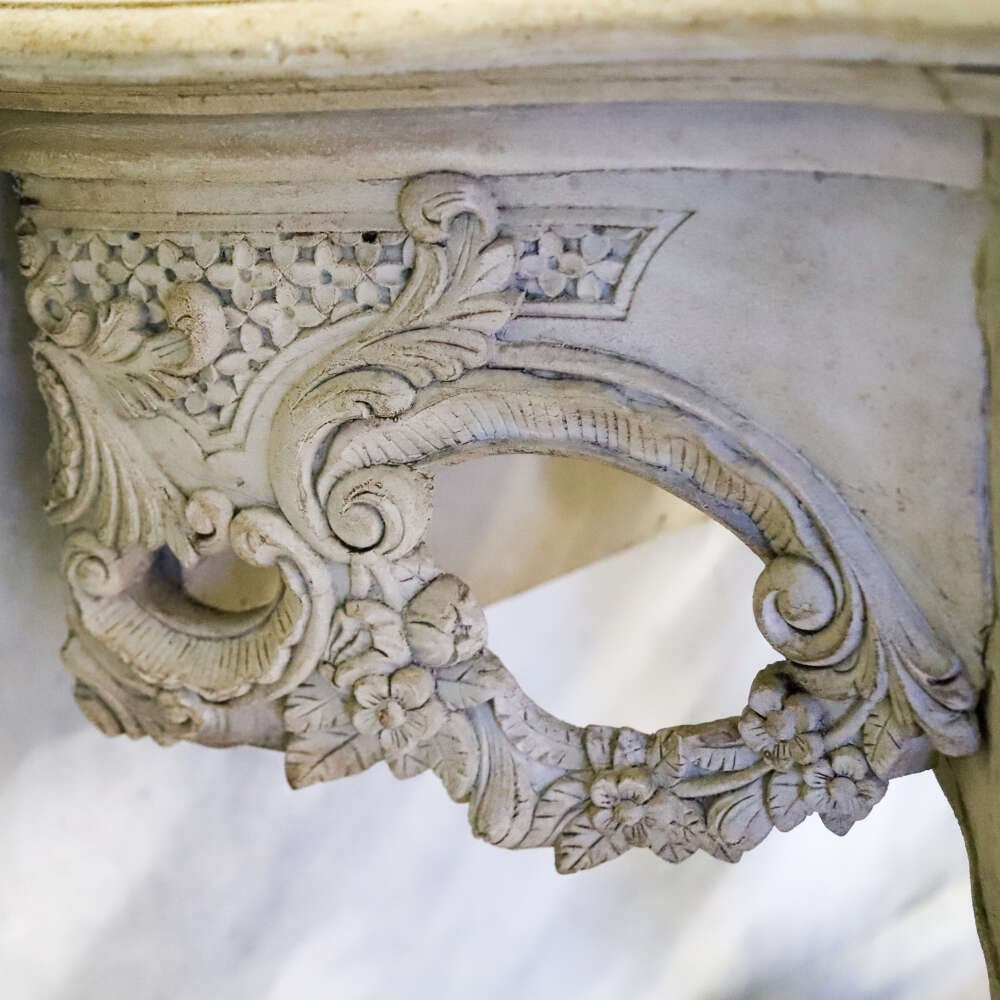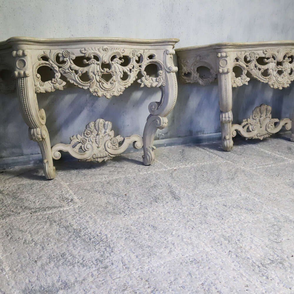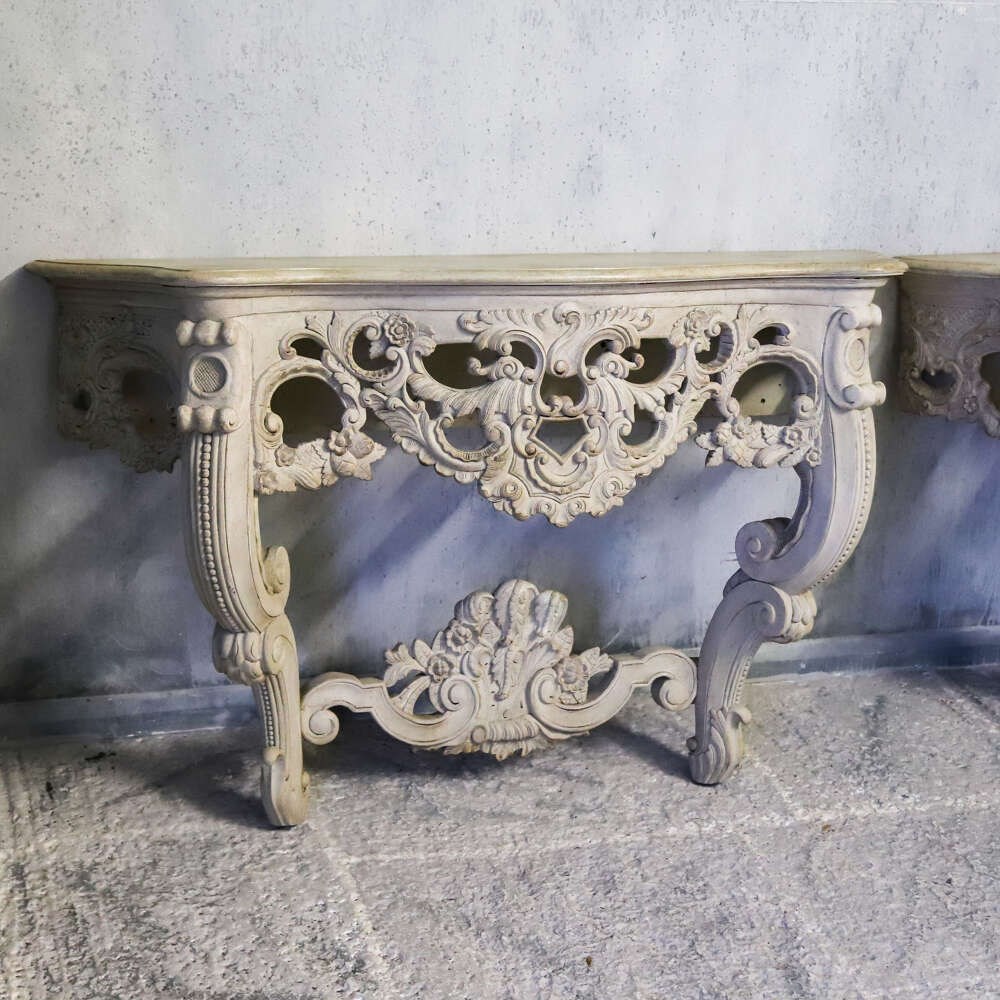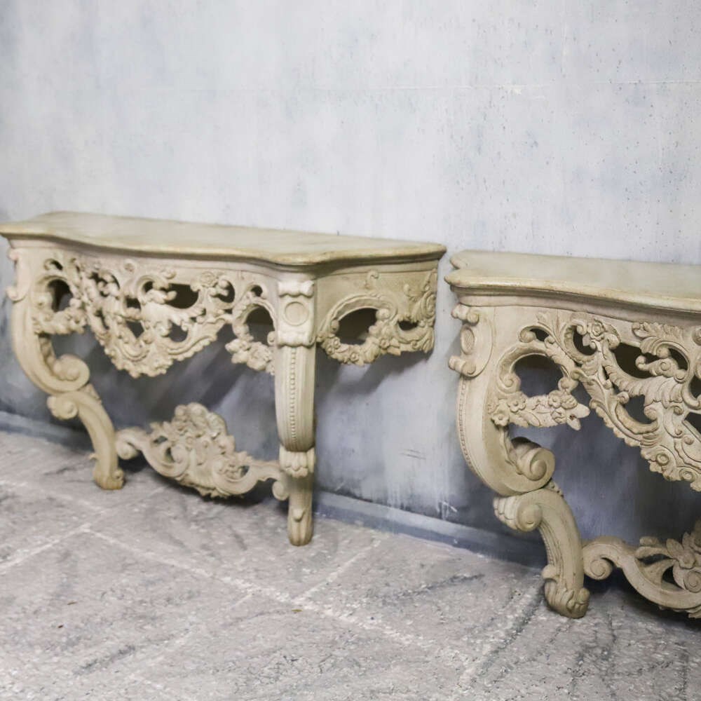 A beautifully decorative pair of French wall console tables, dating to the 1930s, and distinguished by their exceptionally rich hand-carved detail. Elegant in proportion yet confidently sculptural, these consoles exemplify the enduring appeal of French decorative craftsmanship from the early 20th century.