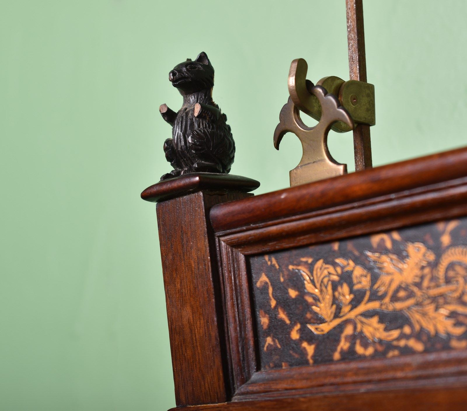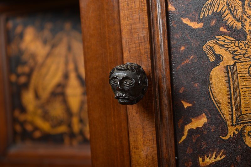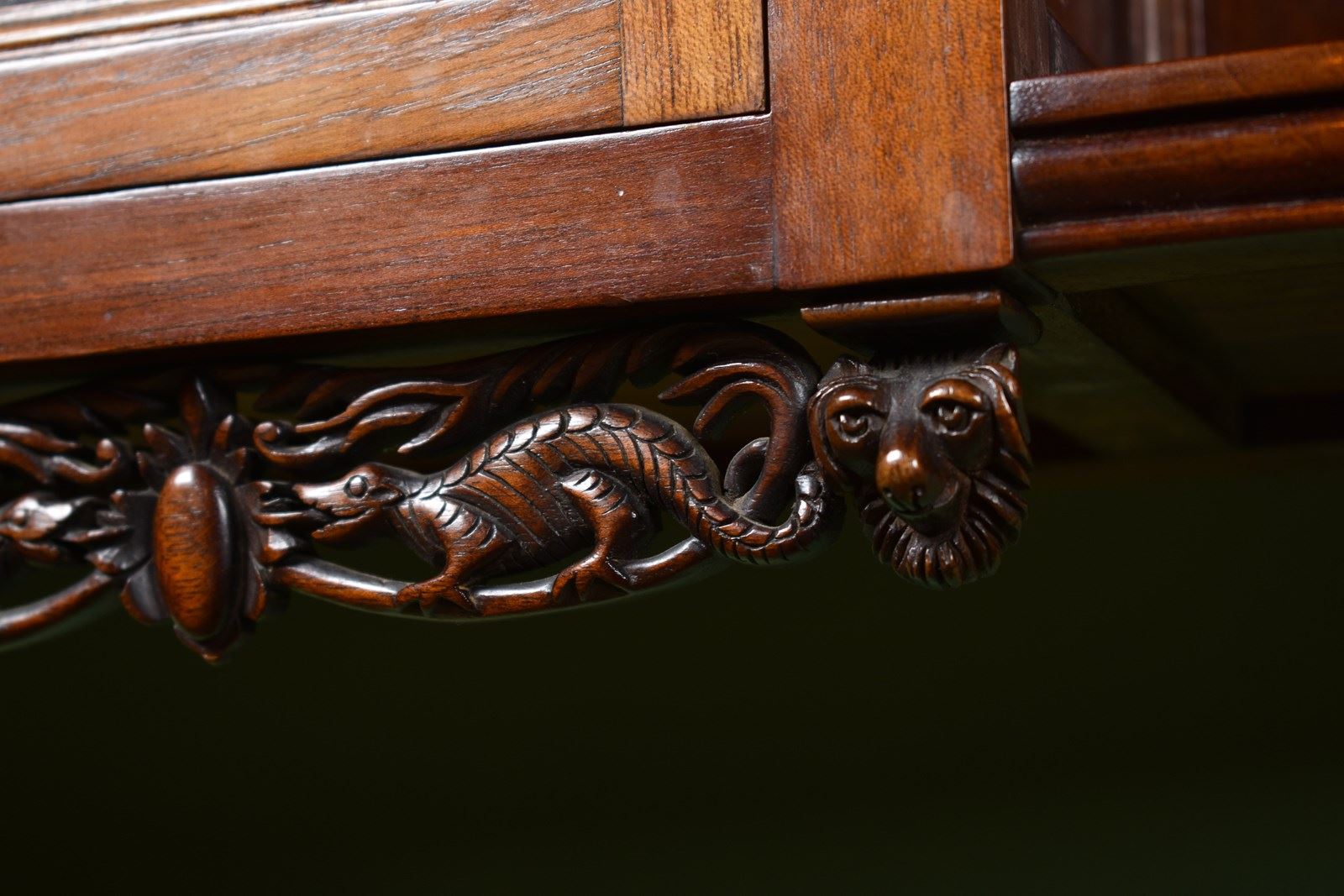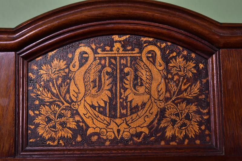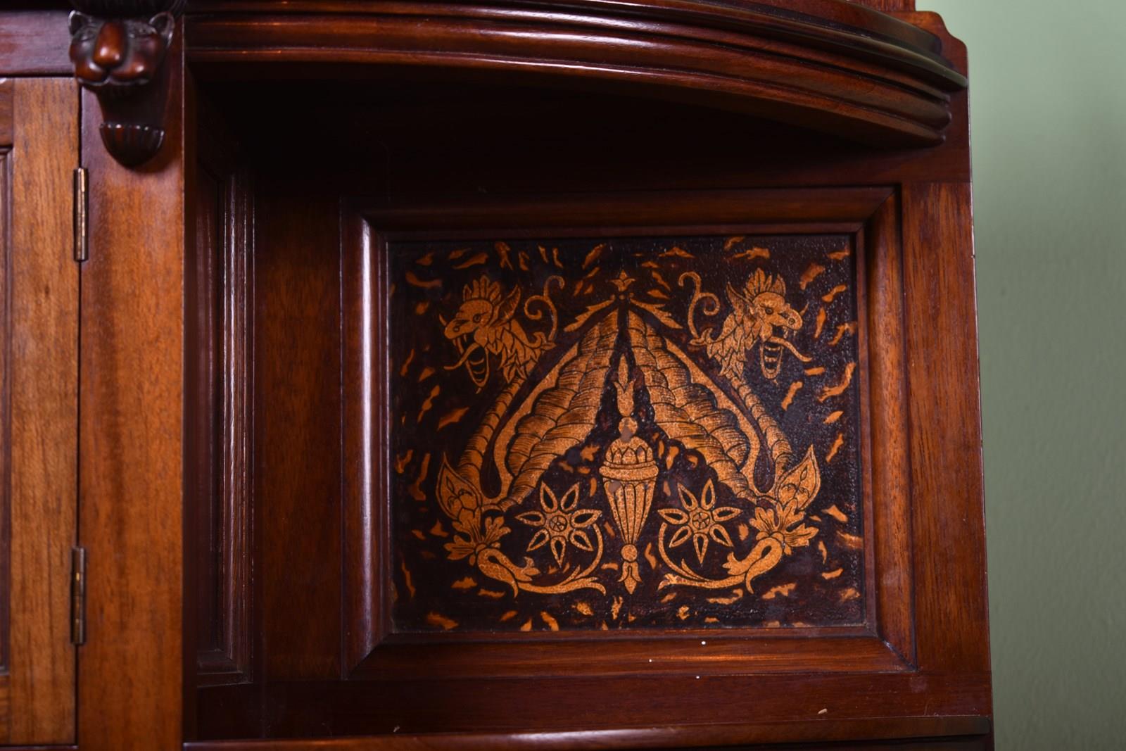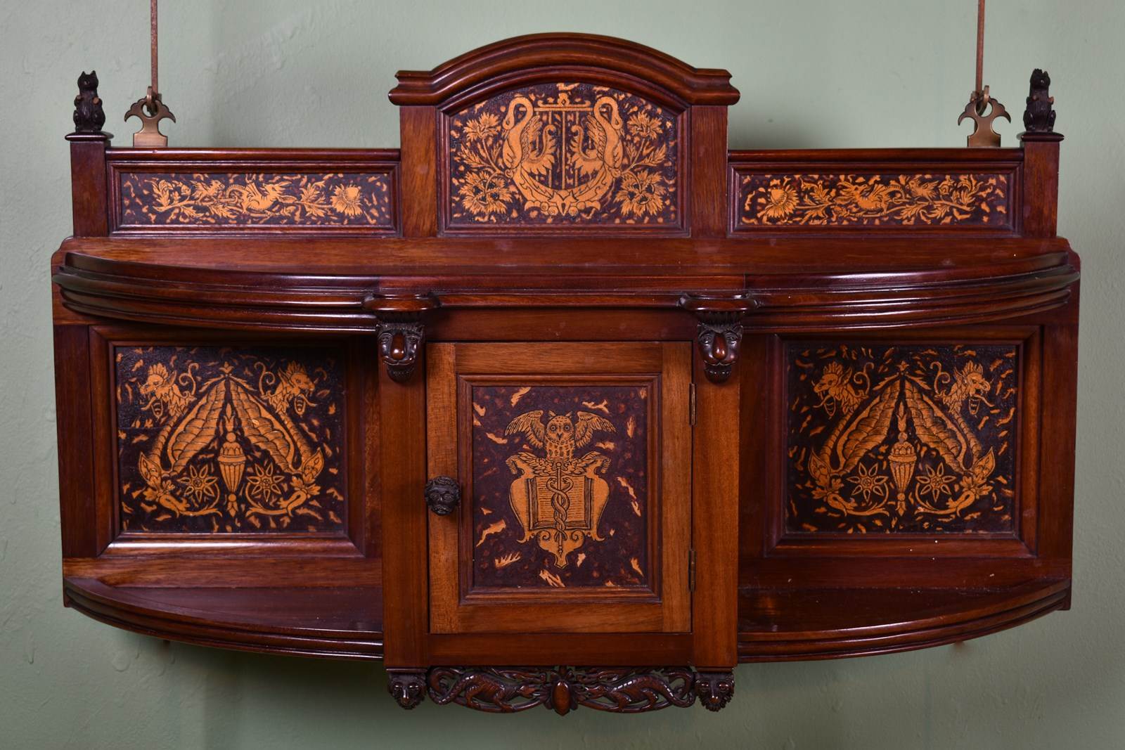 An unusual mahogany hanging shelf, with delicately painted panels and finely carved details.
