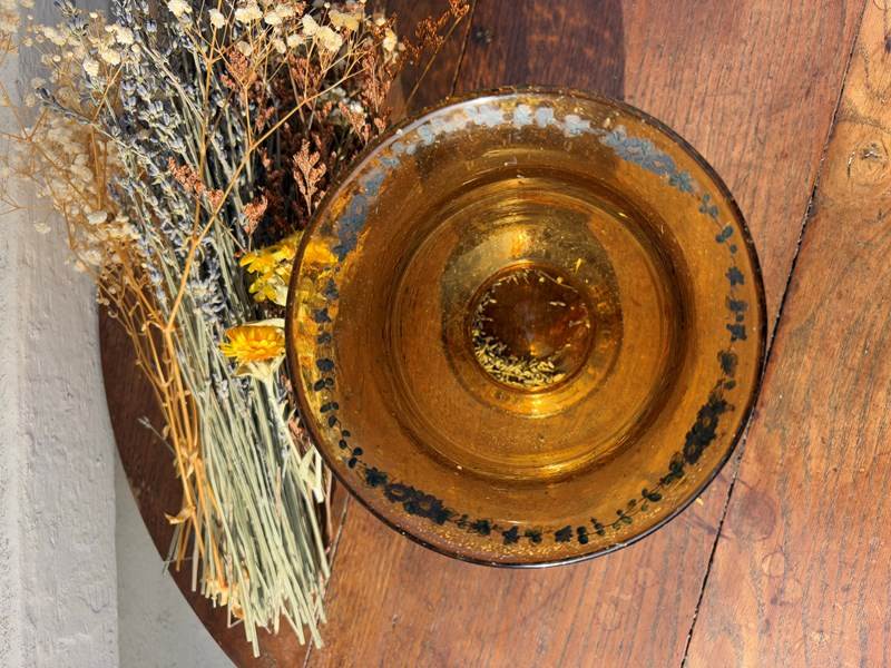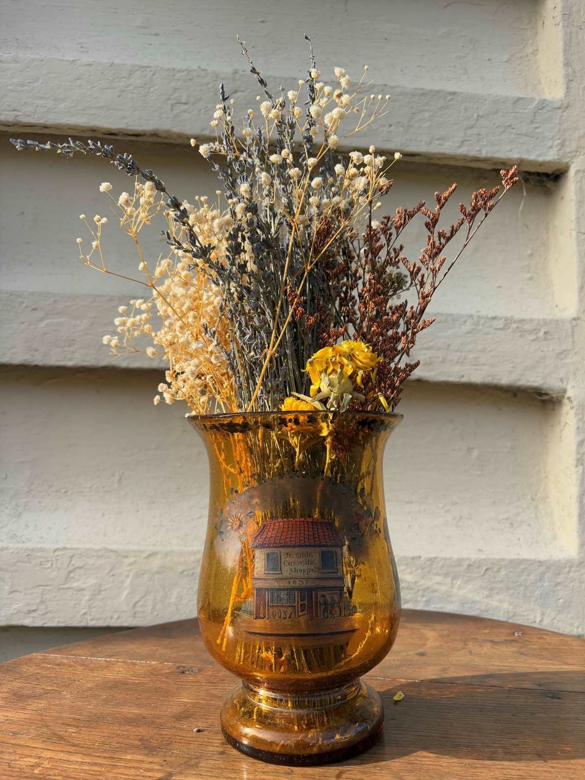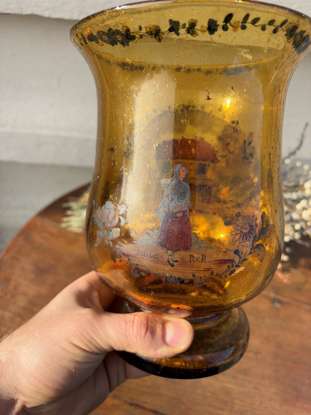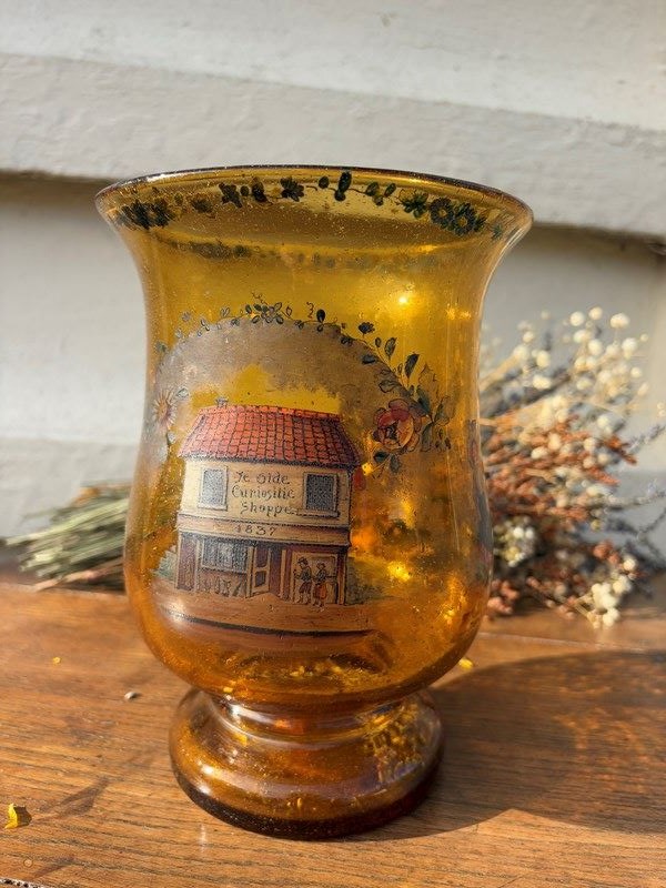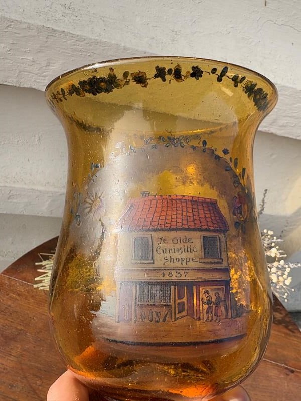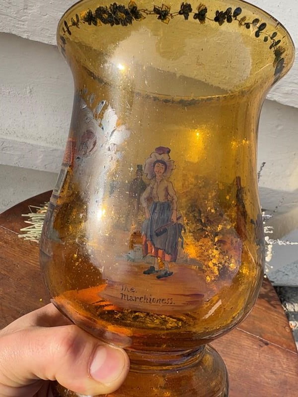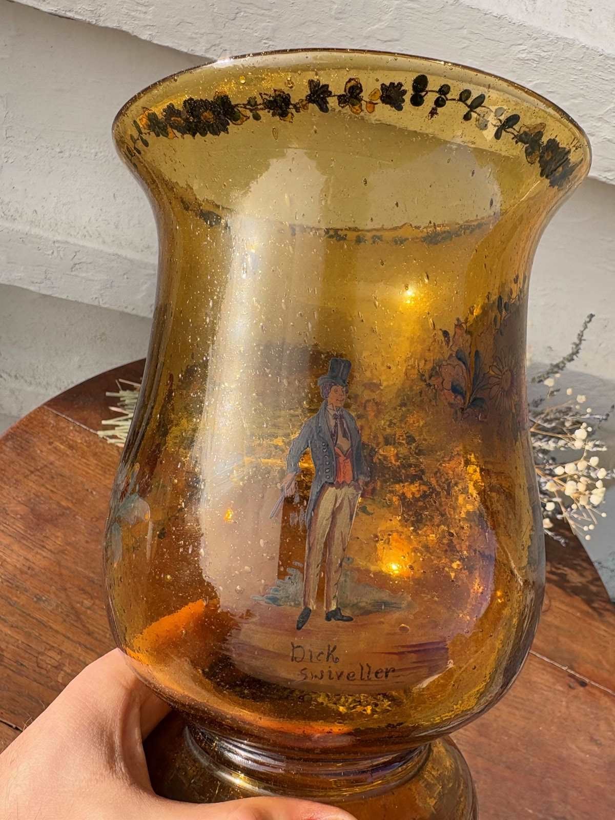 A charming turn of the century celery pot, with folky scenes of an antiques shop and characterful figures.