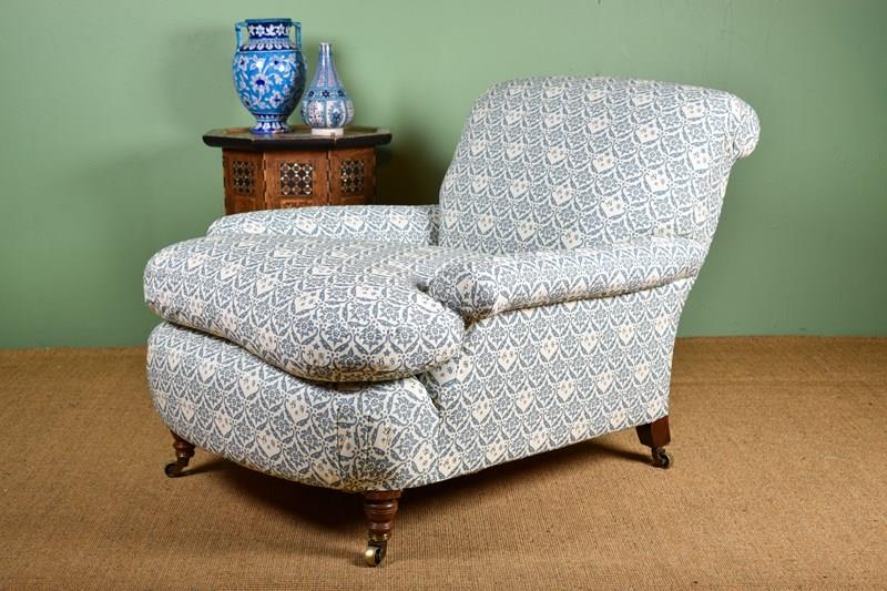 Traditionally upholstered in their iconic light blue/grey monogram fabric, with a generous feather down cushion for added comfort.