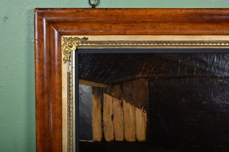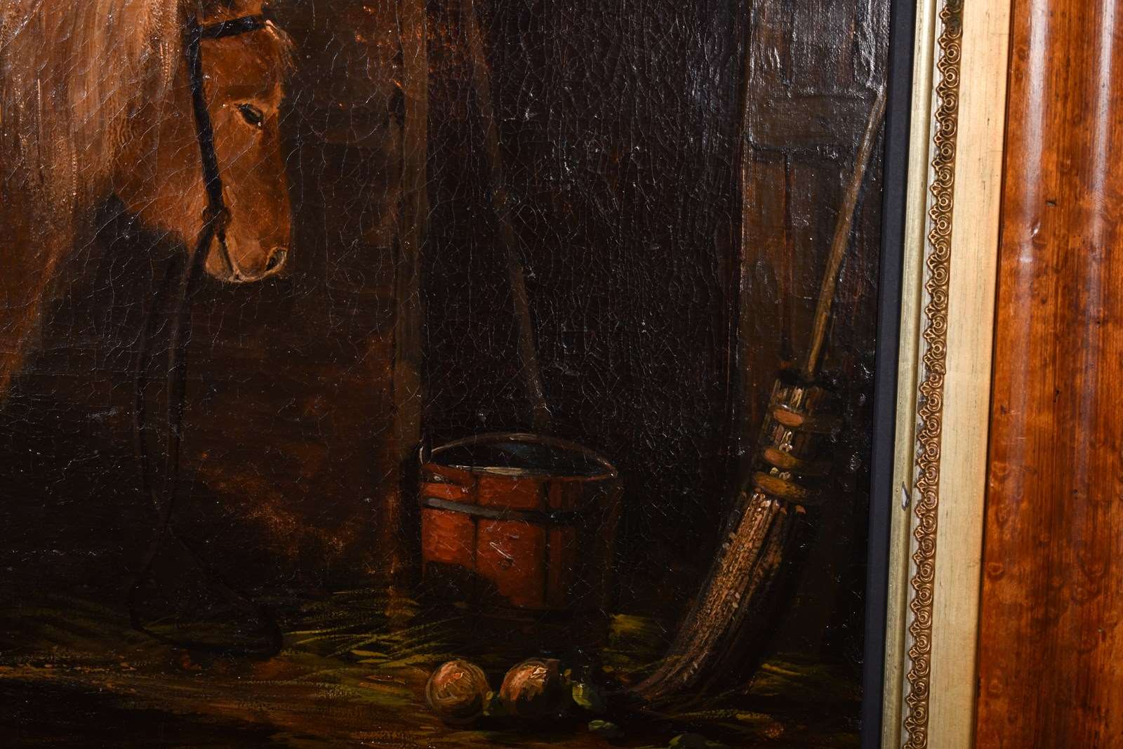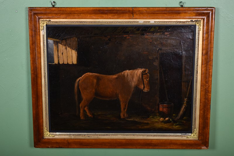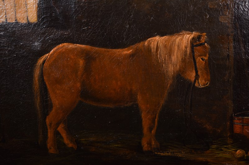 A charming and folky oil on canvas painting of a shetland pony in its stable.