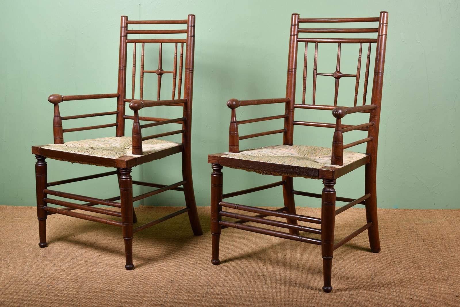 A lovely pair of walnut Ford Madox Brown armchairs, designed for Morris & Co. Circa 1875.
