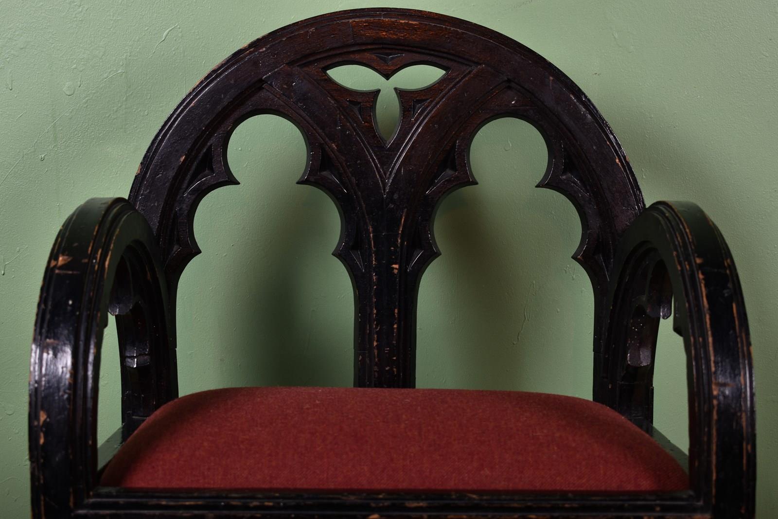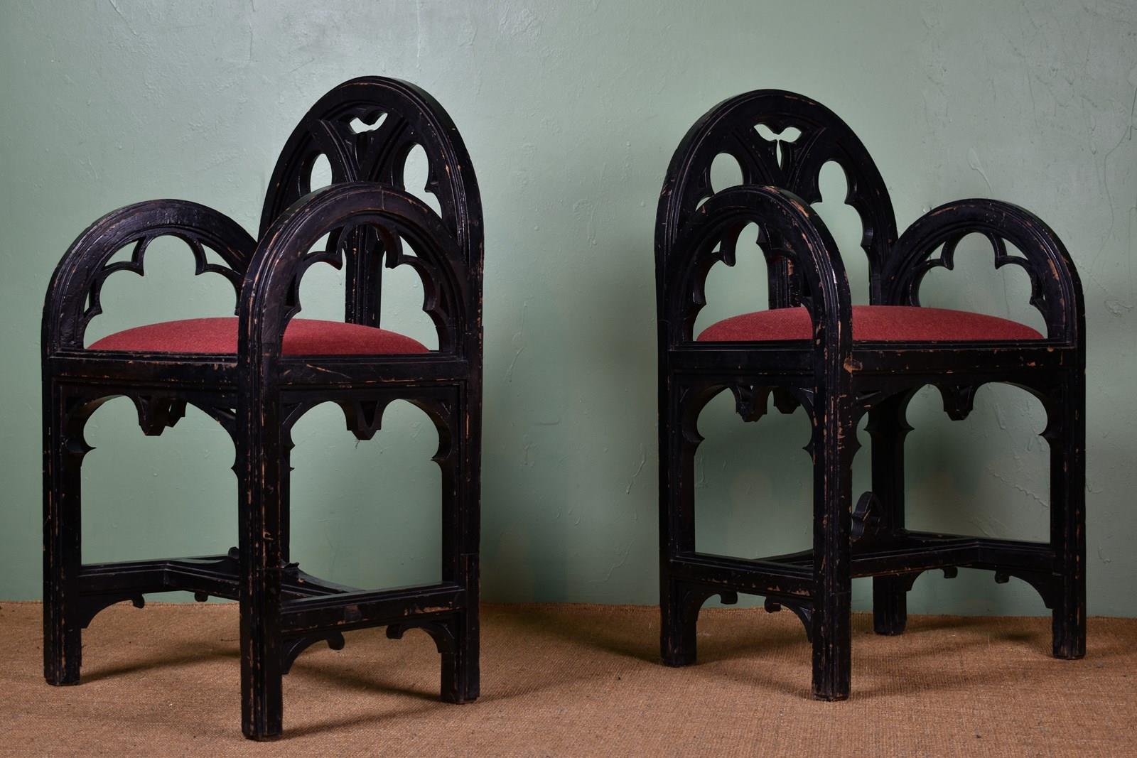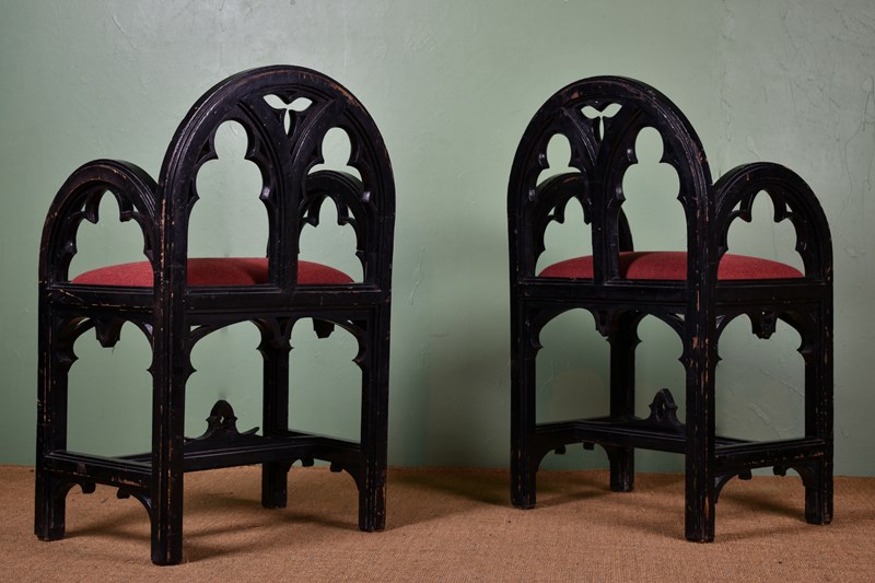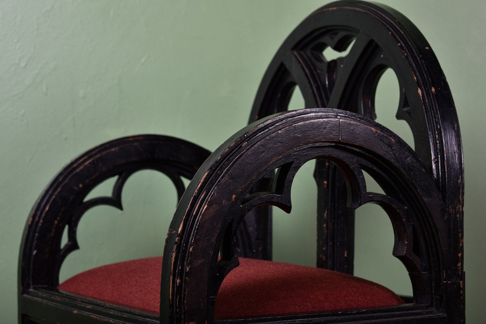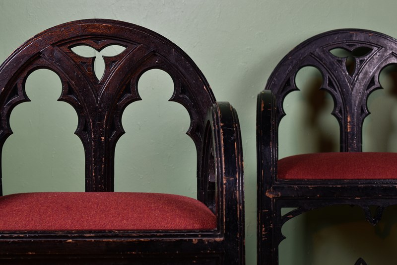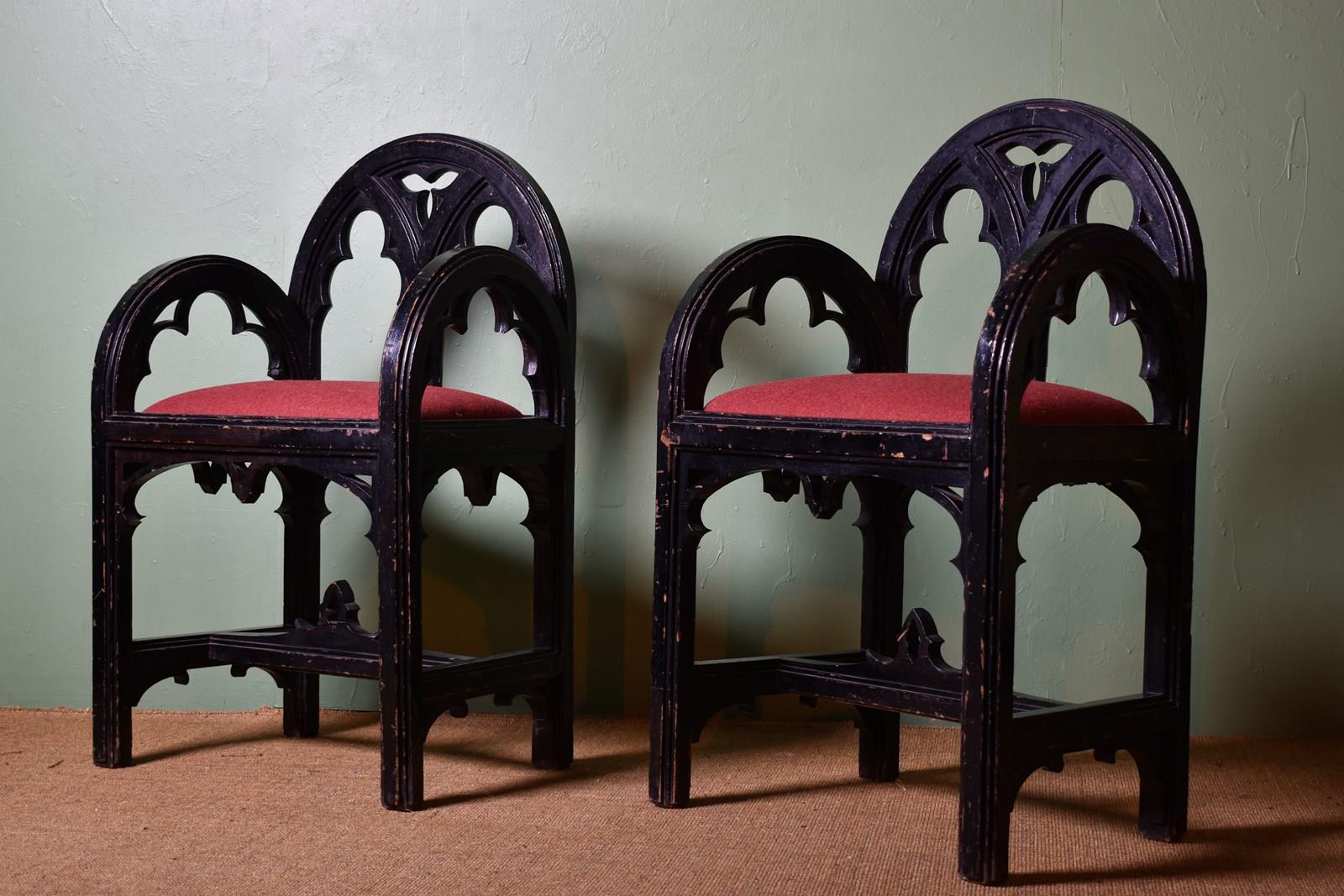 A dramatic and sculptural original pair of gothic revival armchairs.