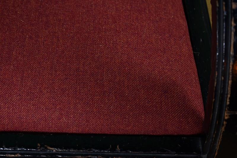 The drop in seat pads retain their original wool stuffed seats. Finished in a warm red Harris wool fabric, an extremely close match to the original remnants found on the chairs.