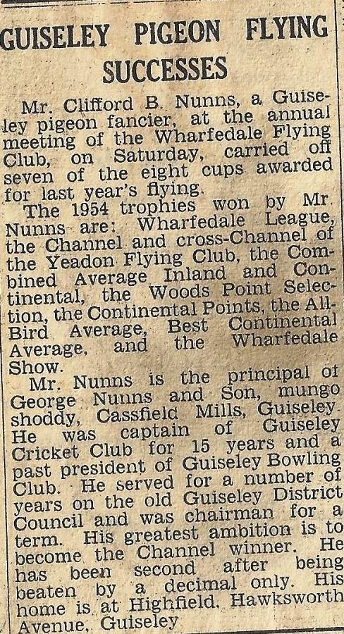 Mr Nunns was involved with many local homing societies around Bradford and Guiseley, including becoming president of the Yorkshire Flying Club.