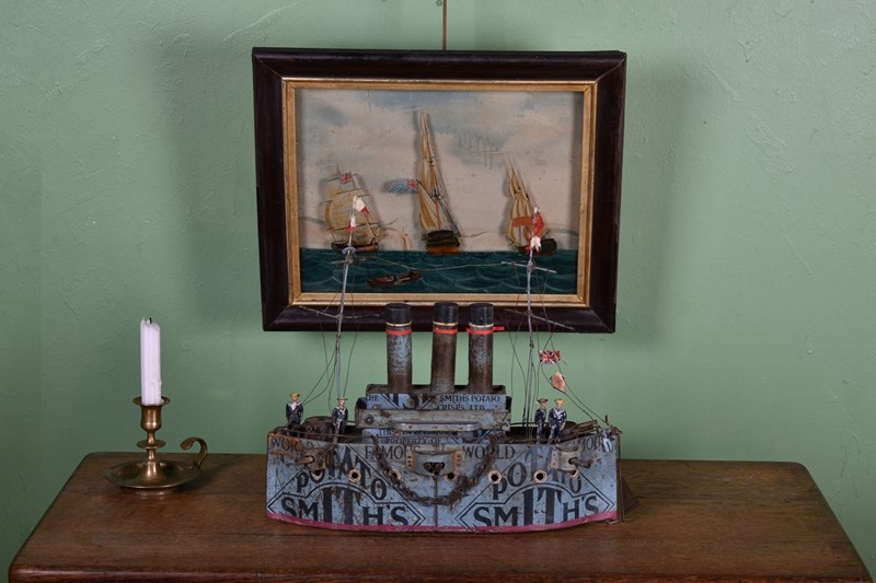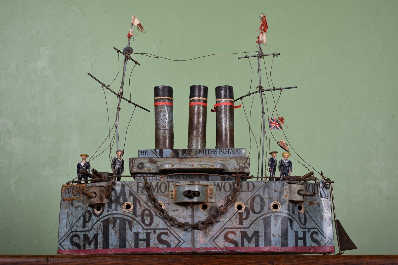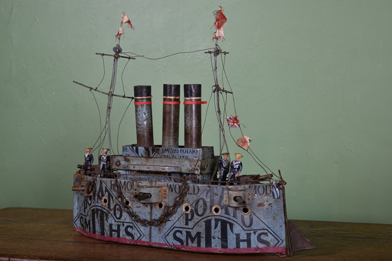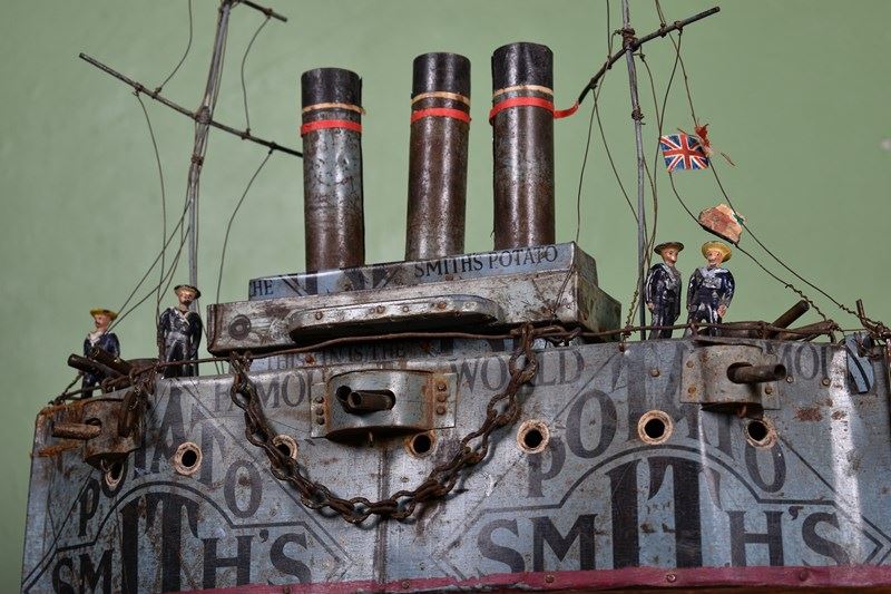 A Rare British Folk Art First World War Tin Model Of A War Ship.