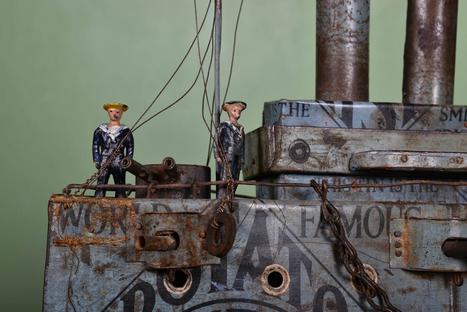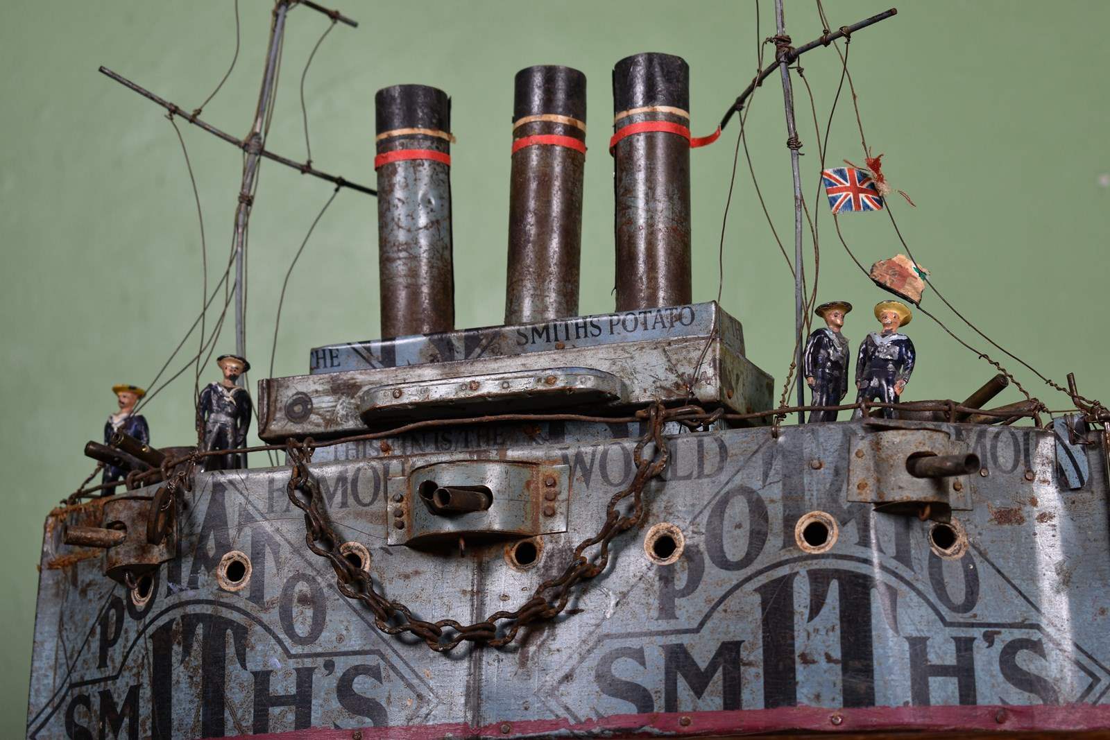 The hull and superstructure with original grey and black Smith’s Crisp’s tin lithographed exterior, three painted tinplate funnels, eight hinged guns on sides, two rotating gun turrets with two barrels to deck, working rudder, two masts with rigging and flags, standing on the deck are four British lead sailors in straw hats.