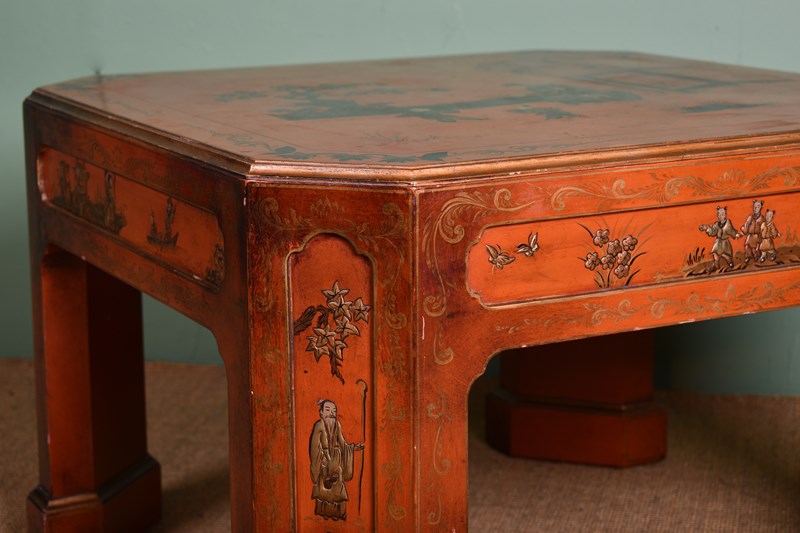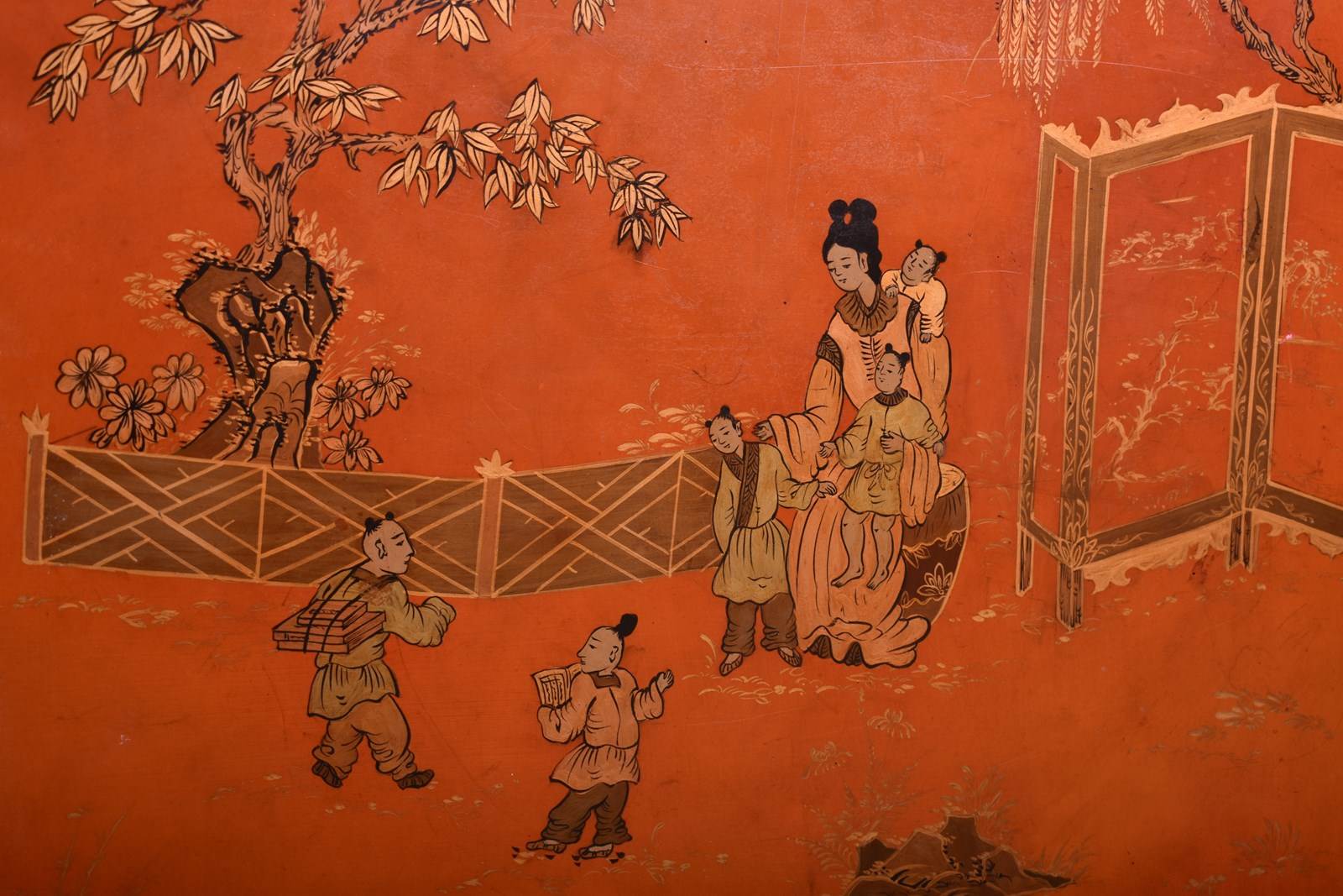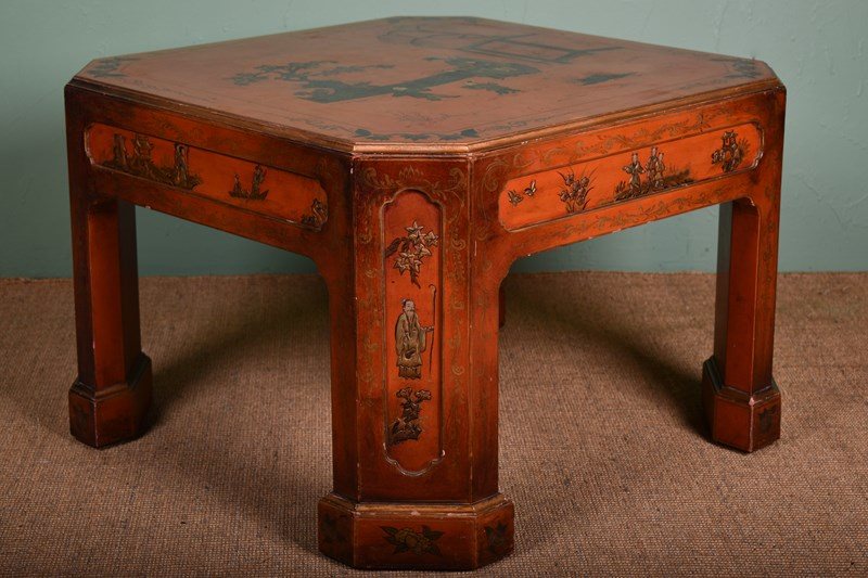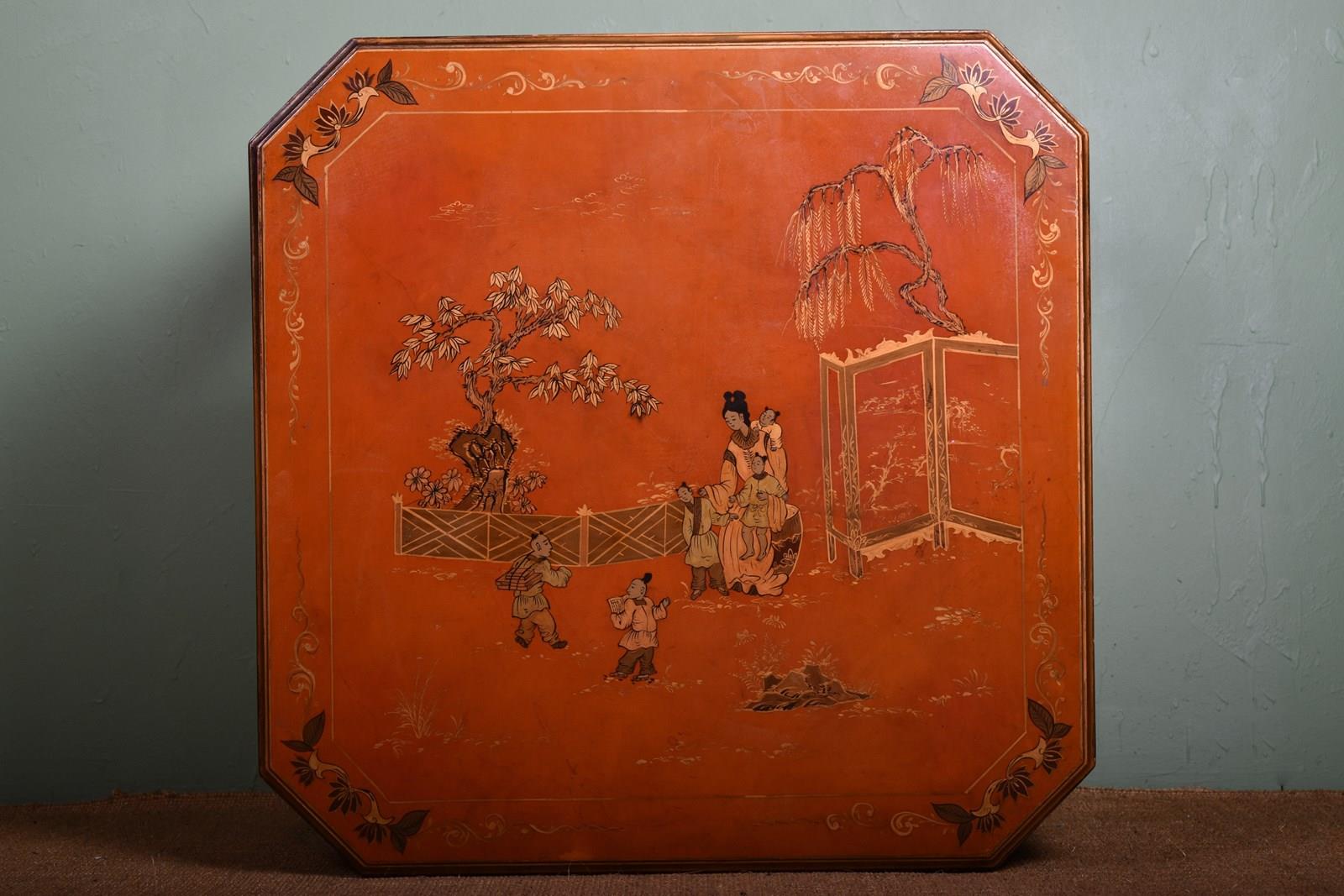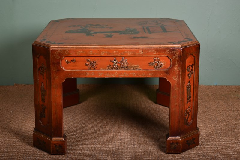A highly decorative red lacquer and parcel-gilt occasional table, profusely decorated with chinoiserie scenes and figures.