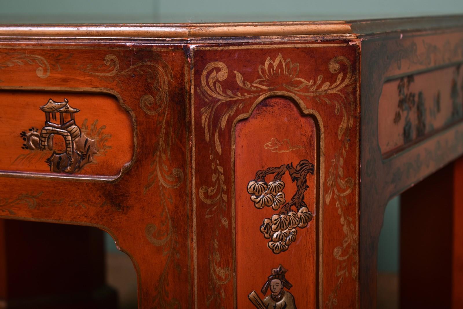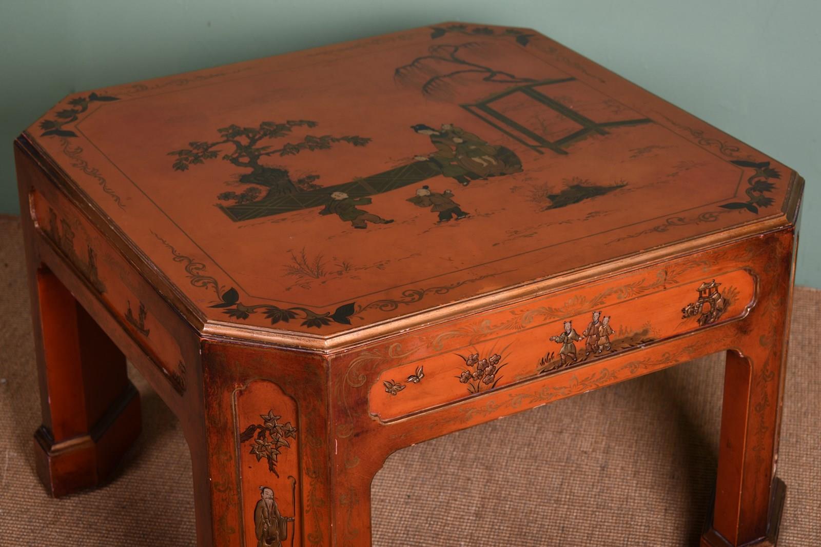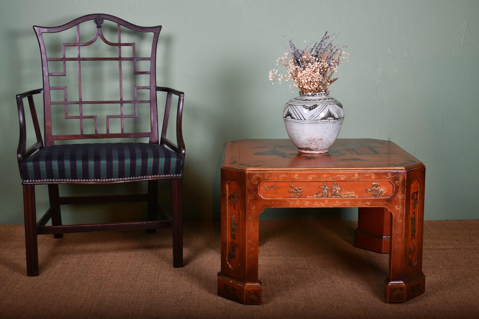 A highly decorative red lacquer and parcel-gilt occasional table, profusely decorated with chinoiserie scenes and figures.