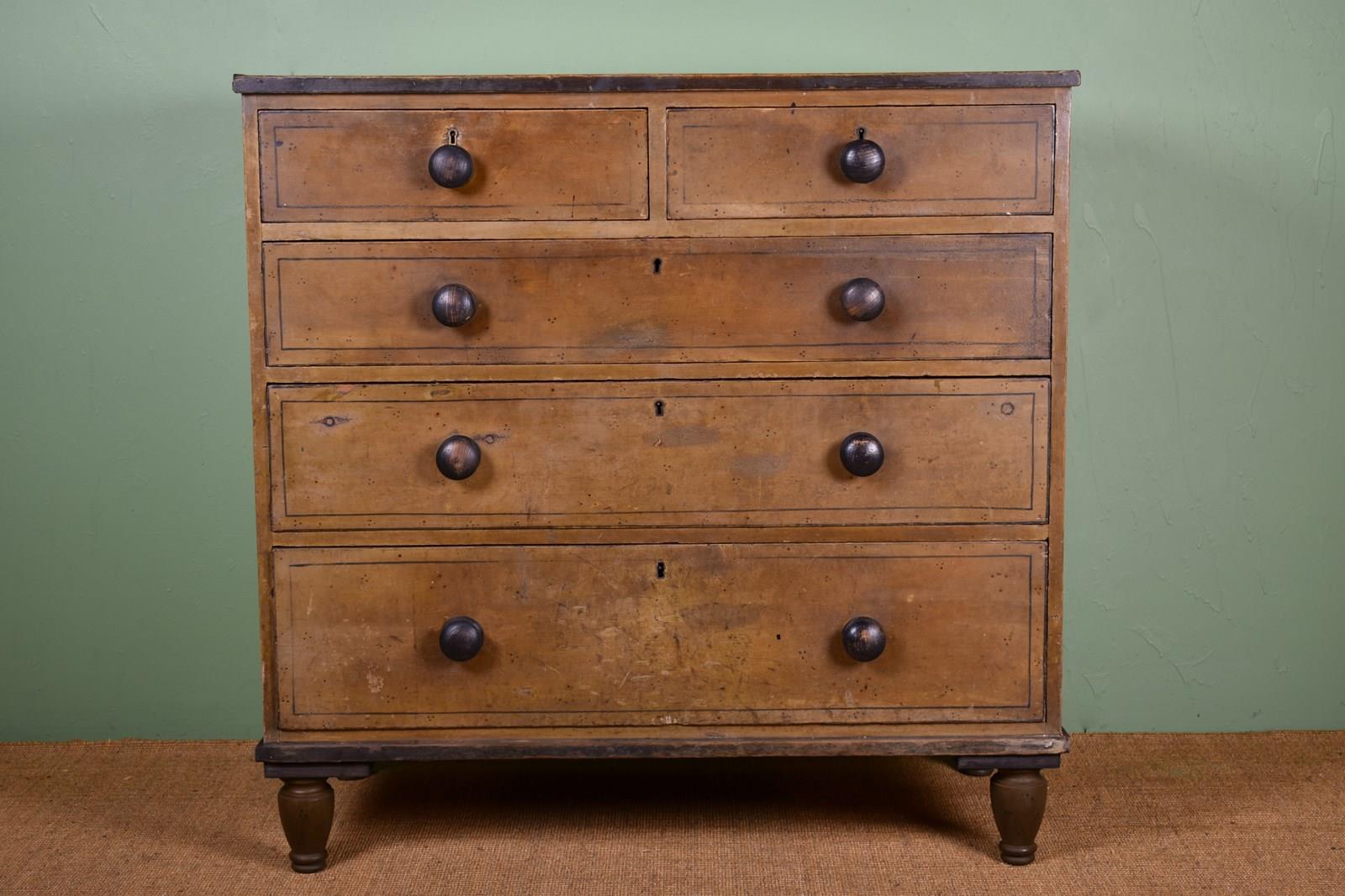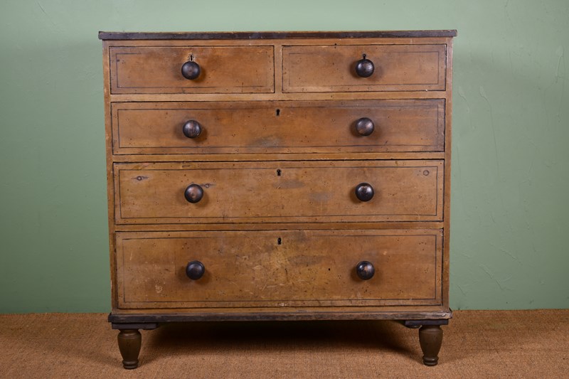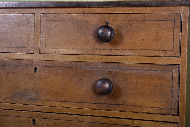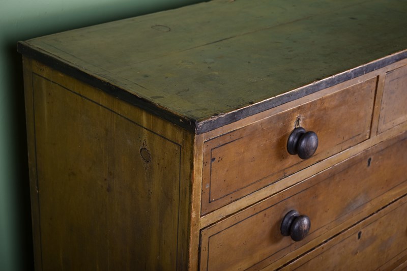 In its original greeny brown faux-bamboo paint work, the top also showcases bluey tones to the paintwork. A really eye-catching chest of drawers.