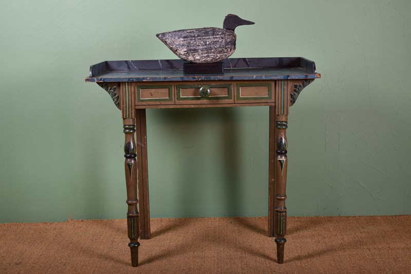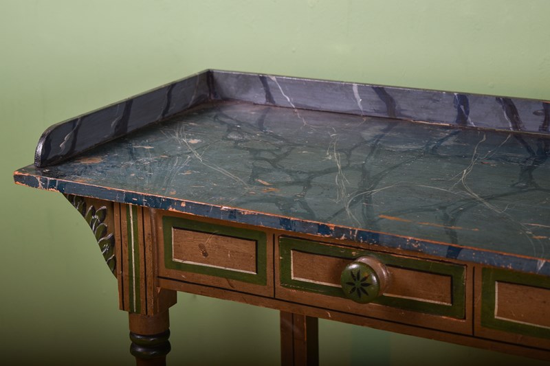 A wonderfully decorative Regency period side table, with stunning faux marble top and gallery.
