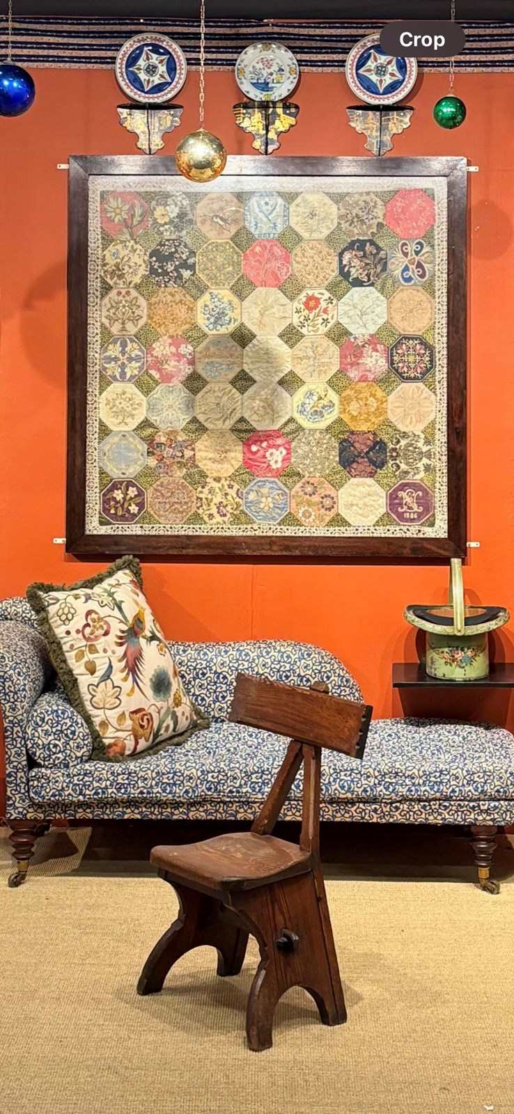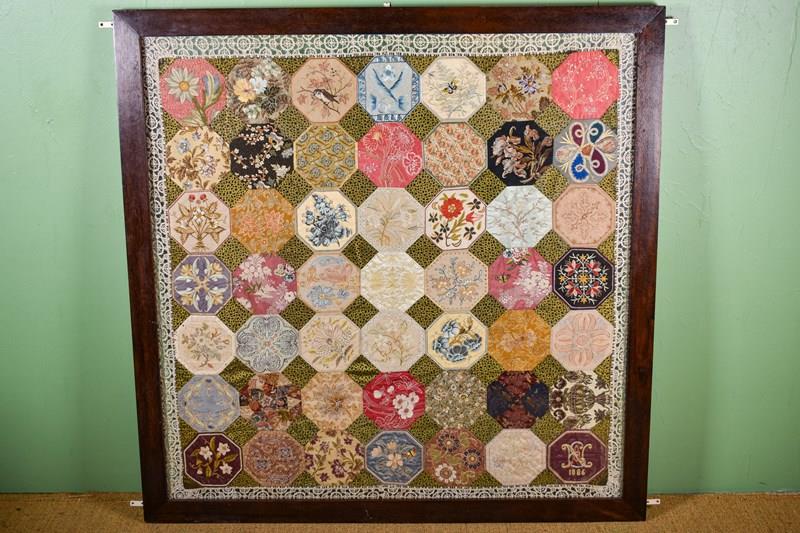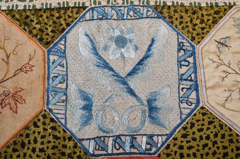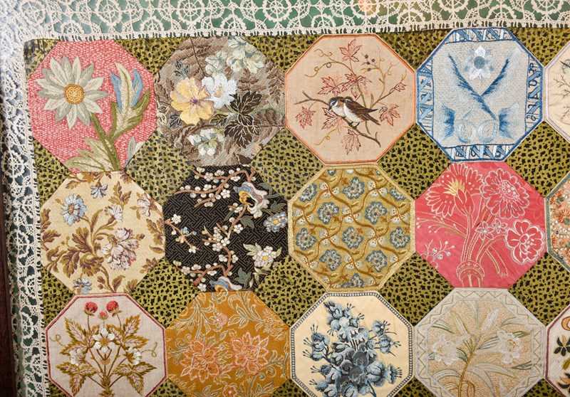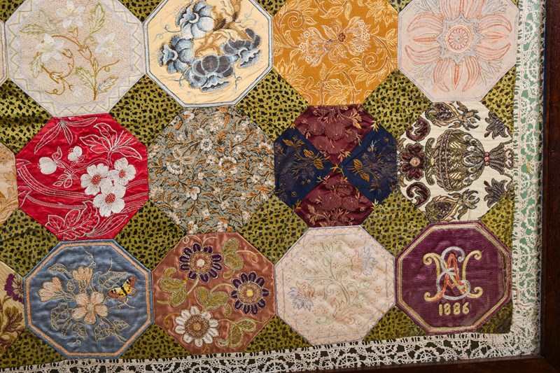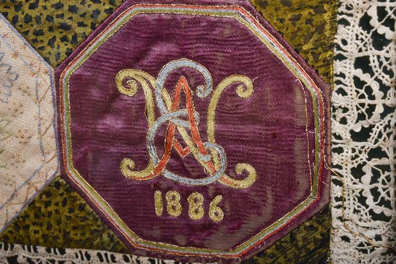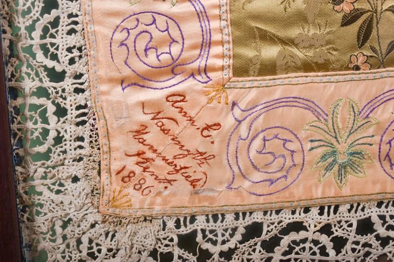 Ann signed this patchwork in 1886 when she was aged 69 years old, she again signed it to the reverse 'Hammerfield' which relates to a large house in Sevenoaks, Kent where she lived with her husband James Nasmyth from the year 1857. Upon purchasing they employed well known architect George Devey to extend the house (see personal website for more images).
