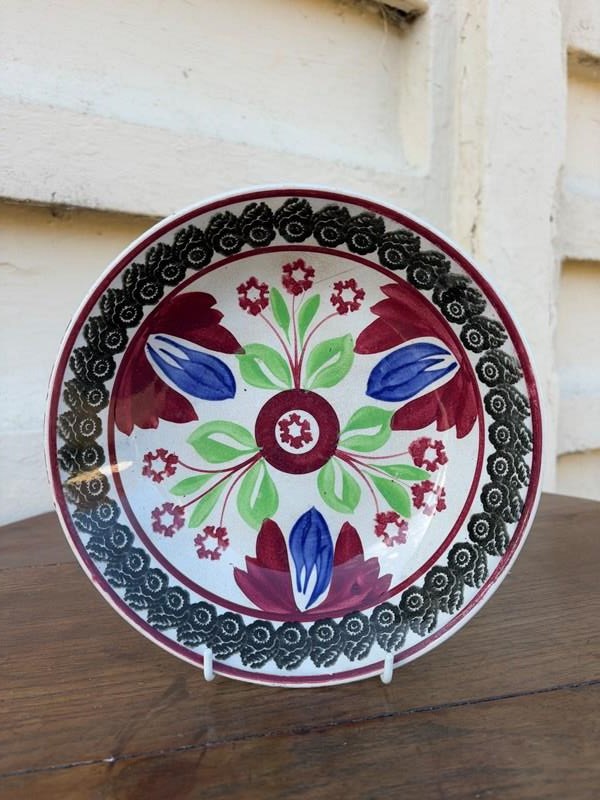 With hair line crack. Black and cranberry tones, foliage and line work.