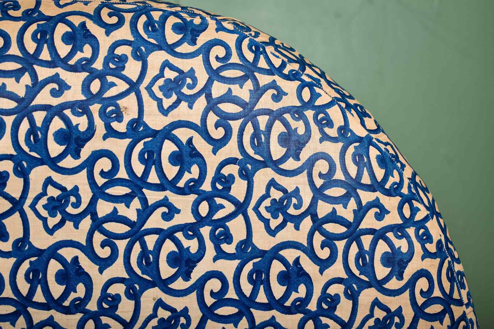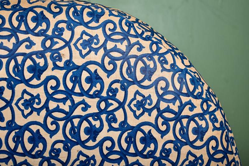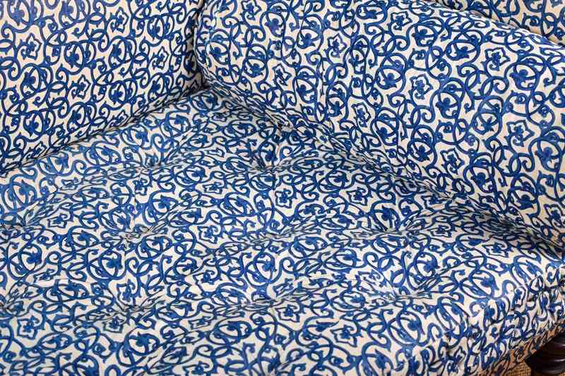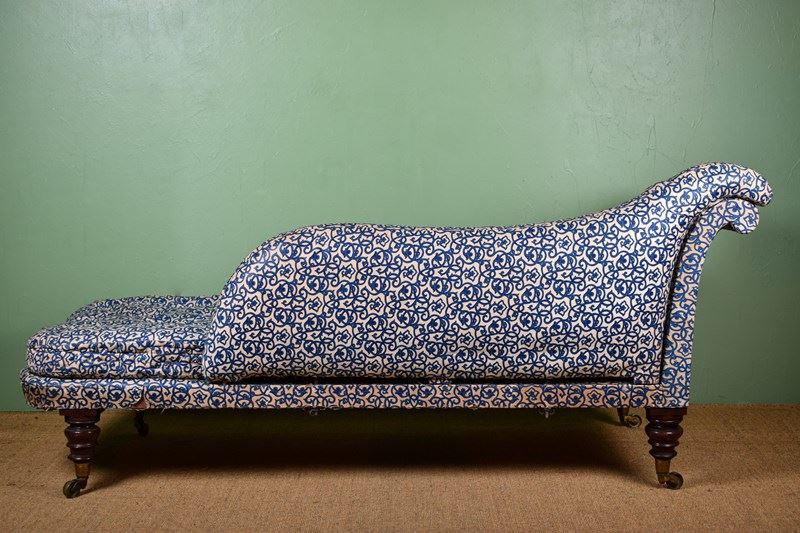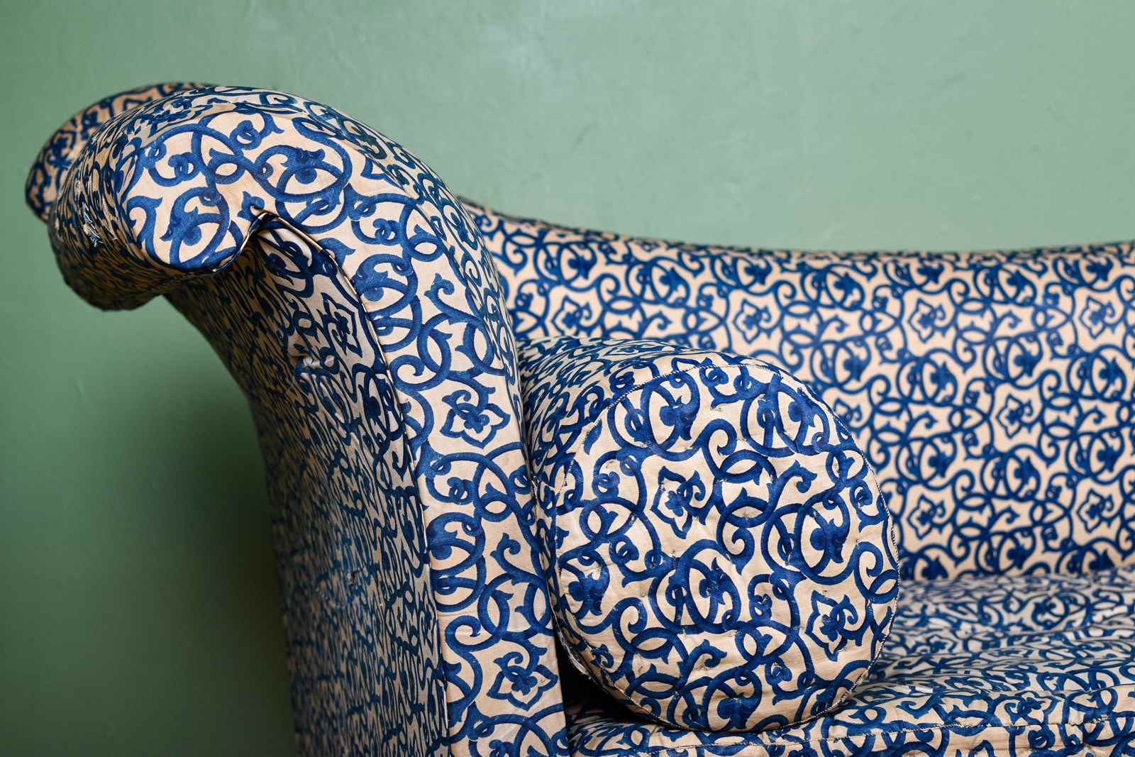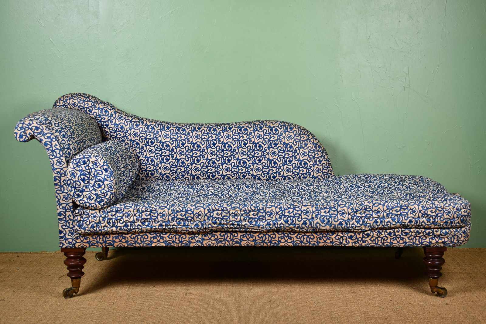 The original fabric or 'ticking' on this chaise is quite astonishing and incredibly rare to still be so vibrant and complete, once acting as a calico or underlay and now stealing all the limelight.