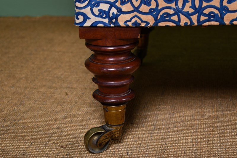 Beautiful contrasting turned mahogany show wood with original brass cups and castors.