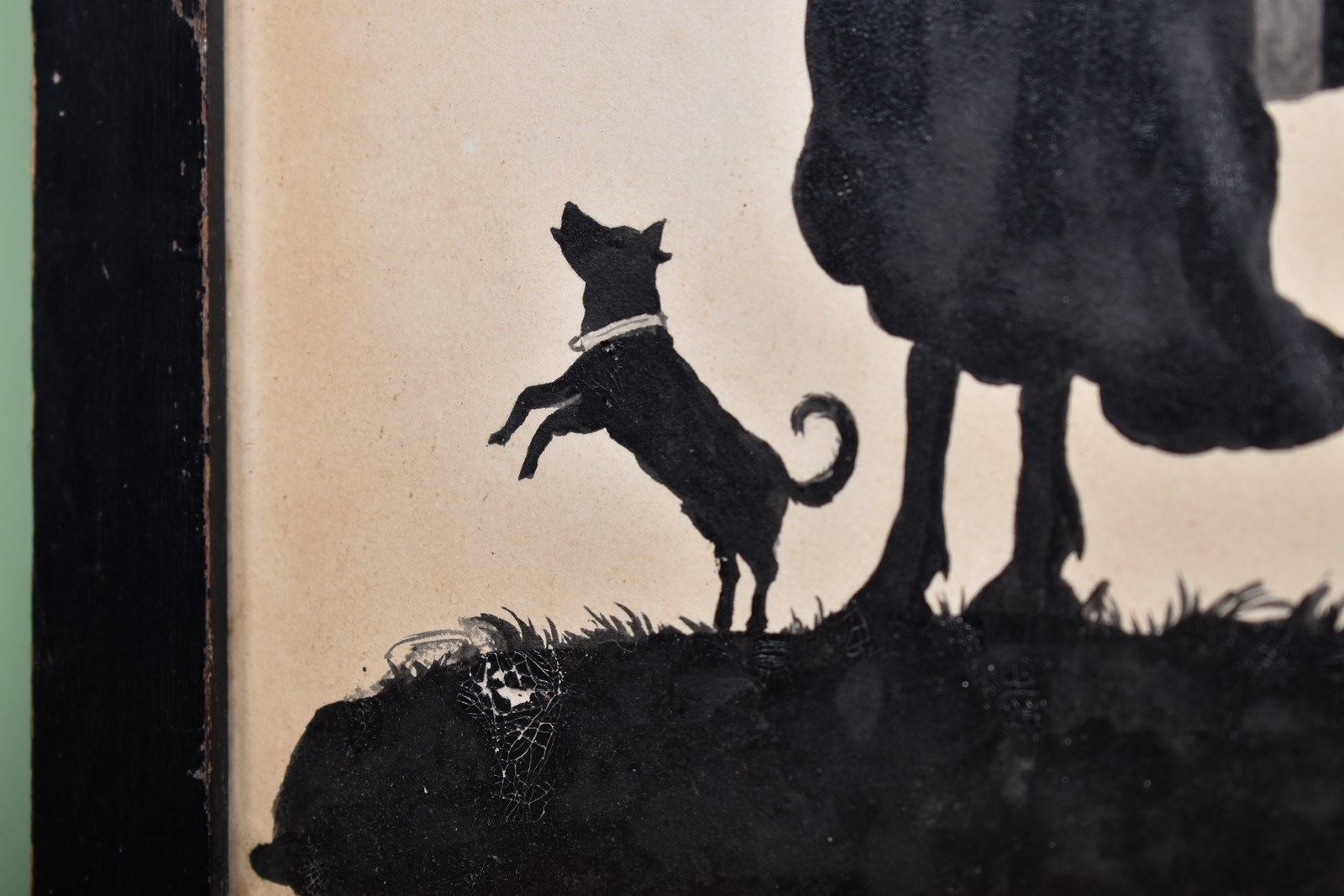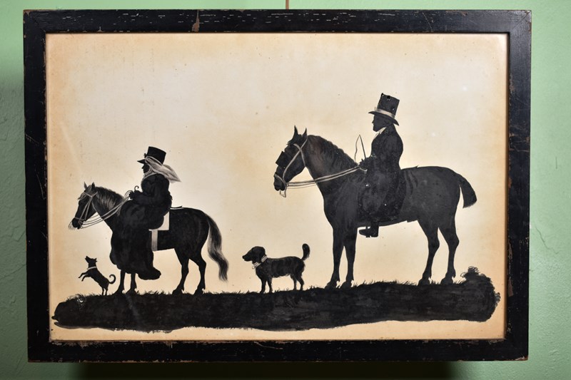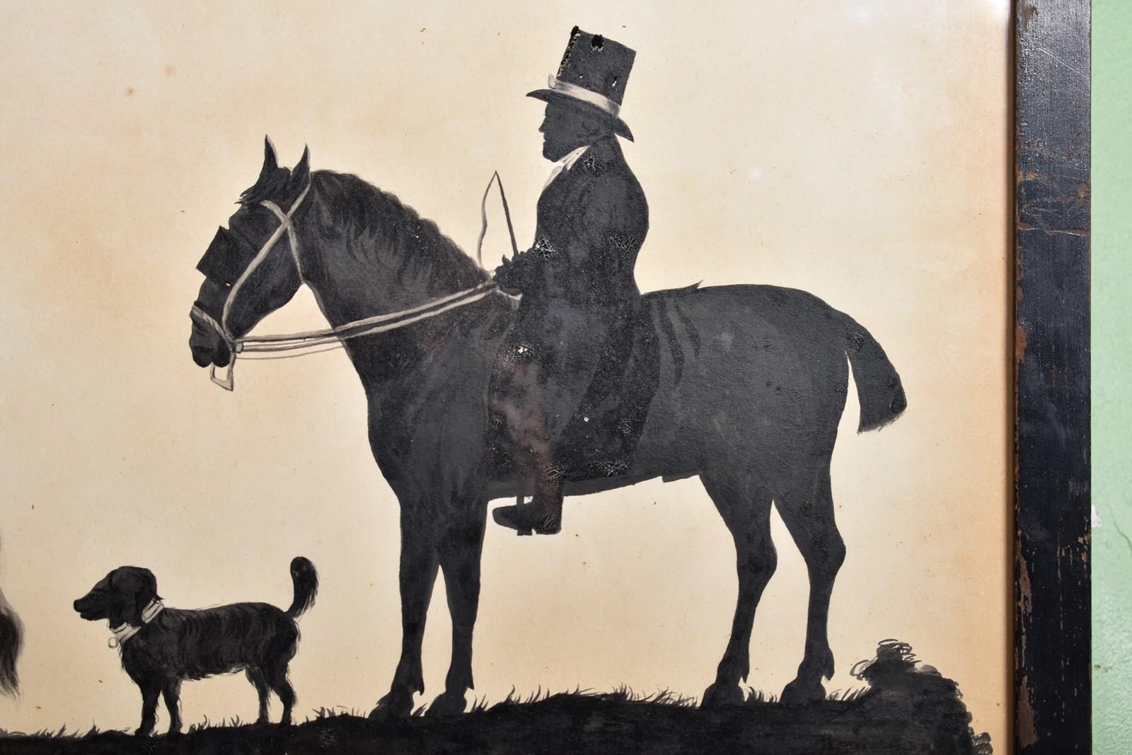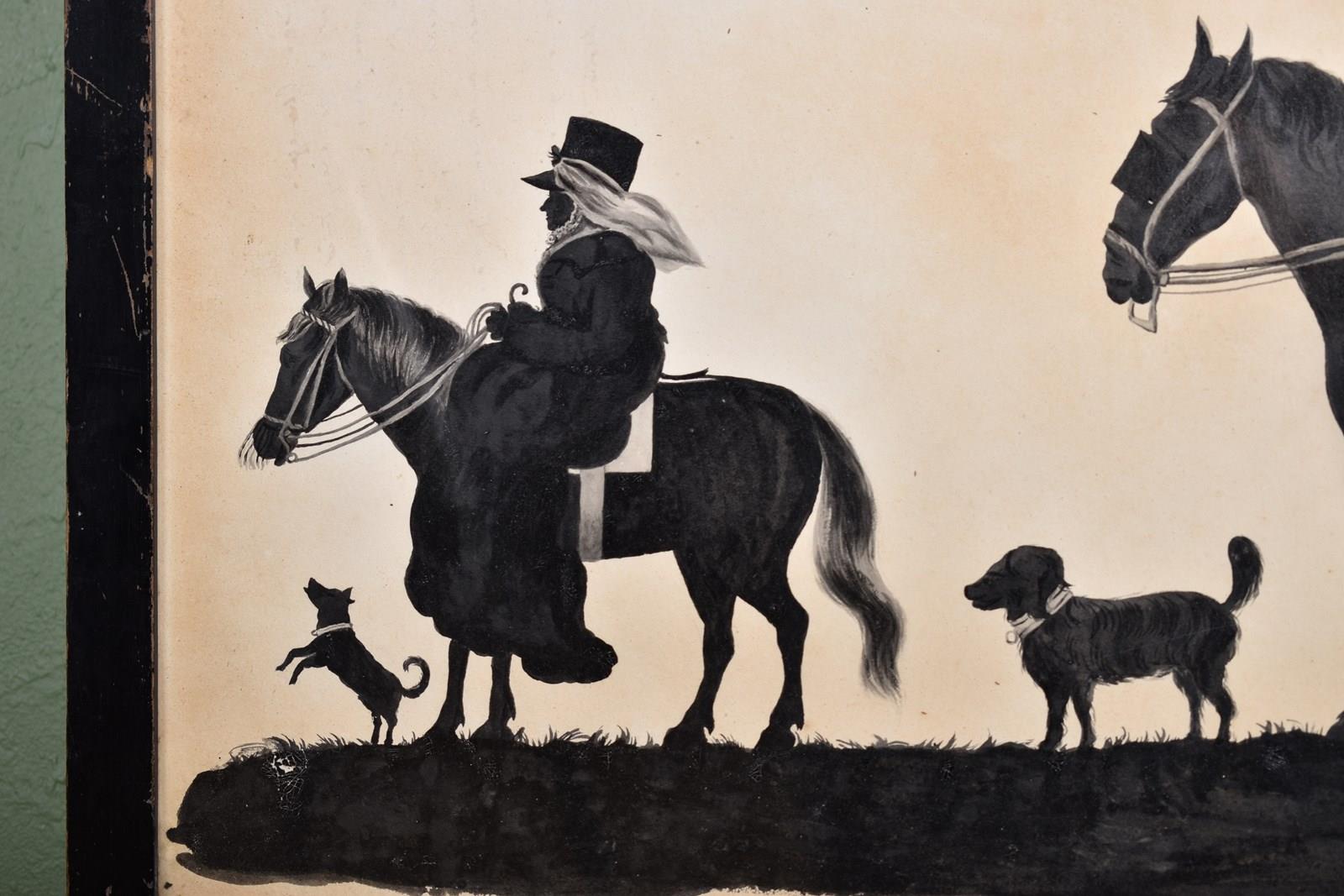 A charming and interesting watercolour silhouette of Mary Winter on horseback with her coachman and two dogs.