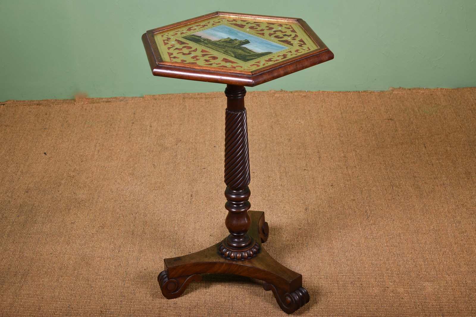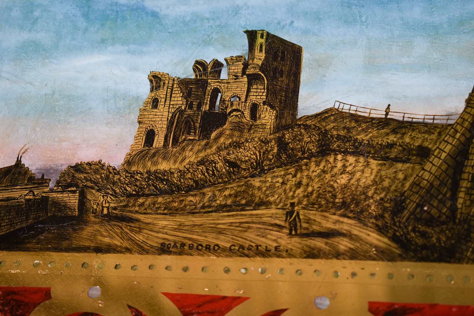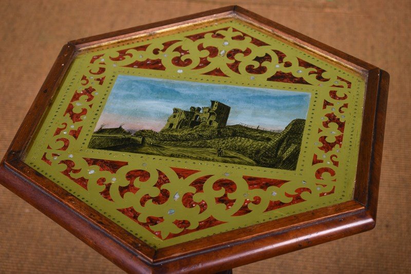 Highly unusual and decorative original reverse painted table top, featuring Scarborough castle and faux-marble detailing.