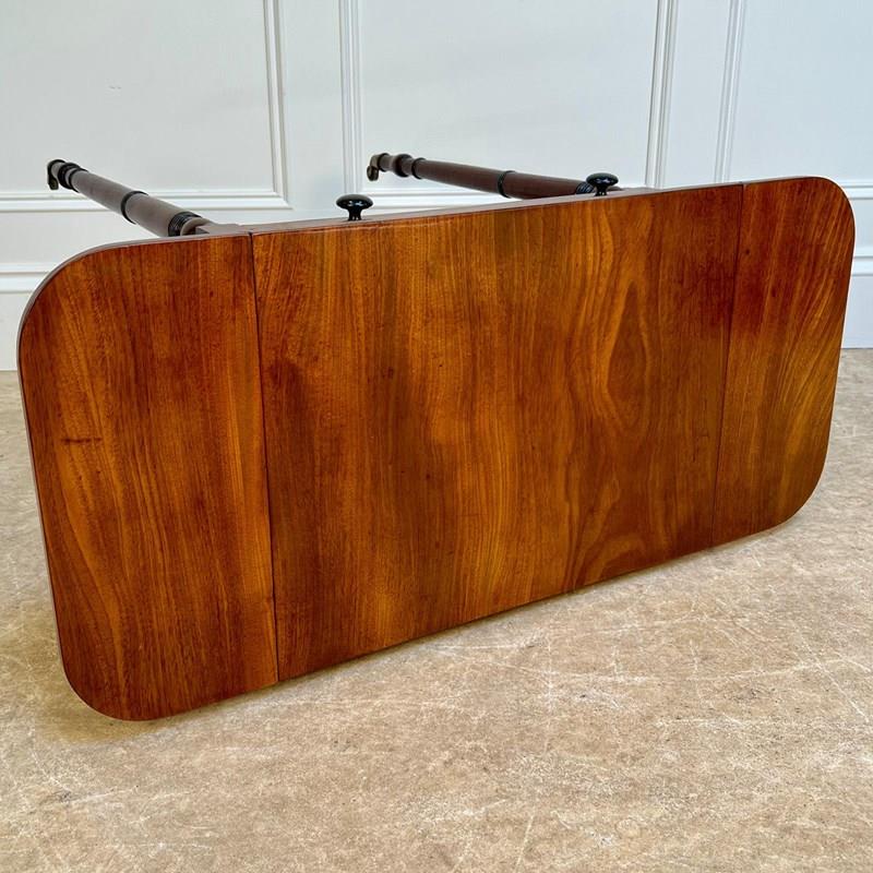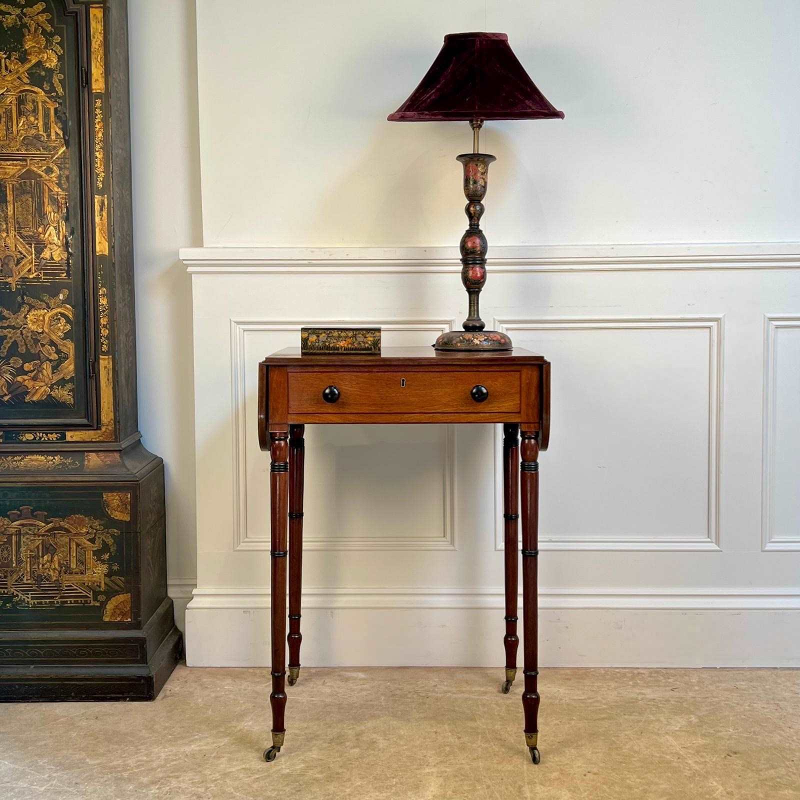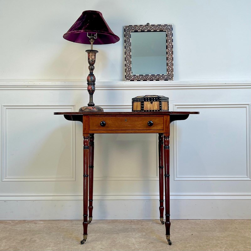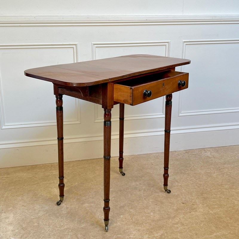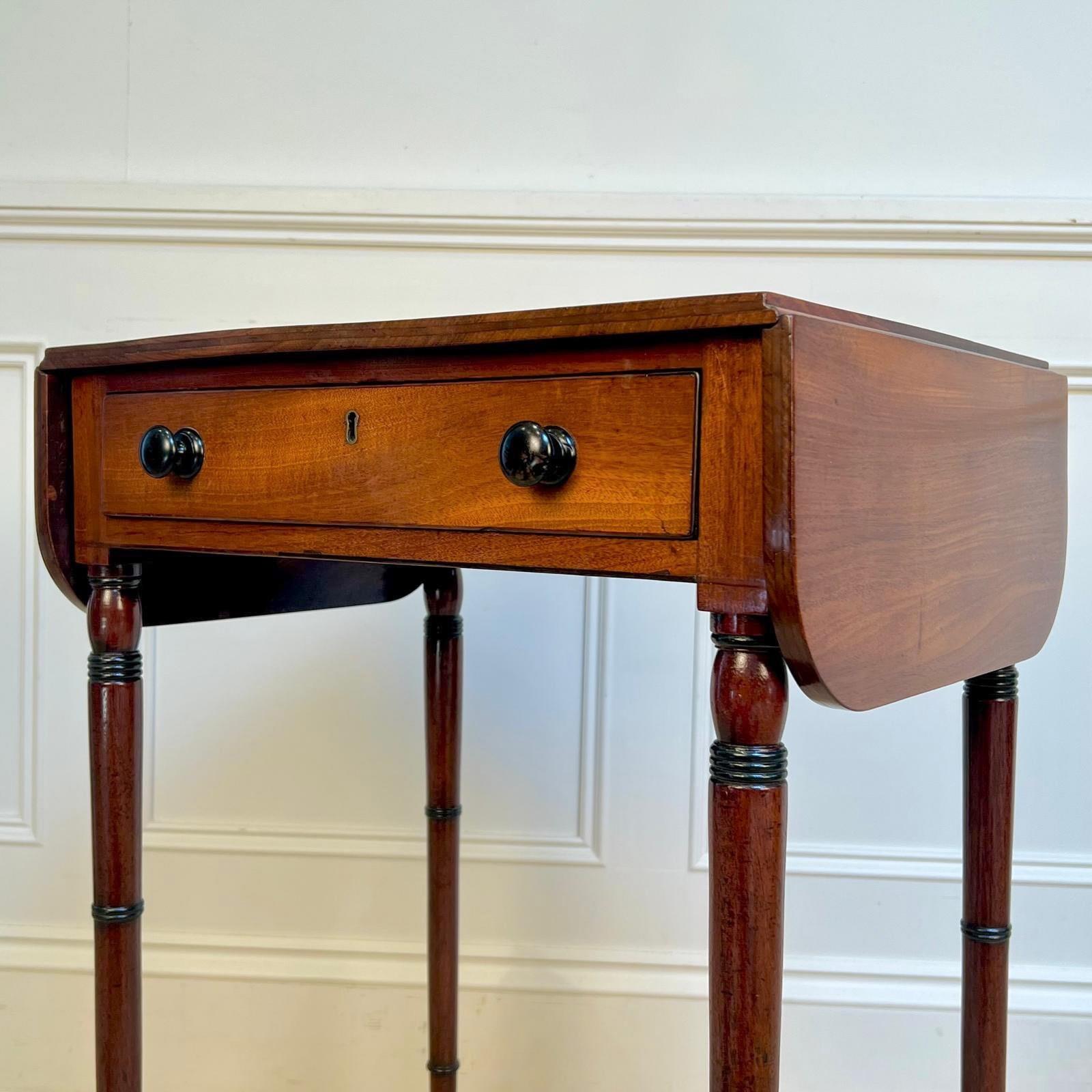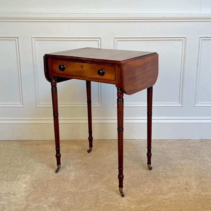 A small and perfectly proportioned George III mahogany pembroke / sofa table. Having a single working drawer and a dummy drawer to the reverse, retaining the original ebonised knob handles and raised on slender ring turned legs with ebonised detailing. Retaining the original gilt brass lacquered castors. Lovely condition and good colour throughout. English, Circa 1815
