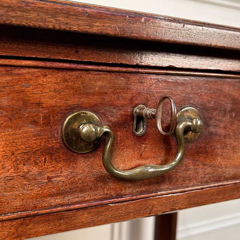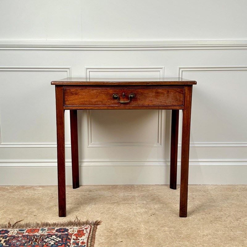 A wonderful small 18th century solid mahogany side table. Having a moulded top with a single oak lined drawer of which retains the original handle, lock and escutcheon. Raised on gently chamfered legs with a superb original finish and colour. English, Circa 1780.