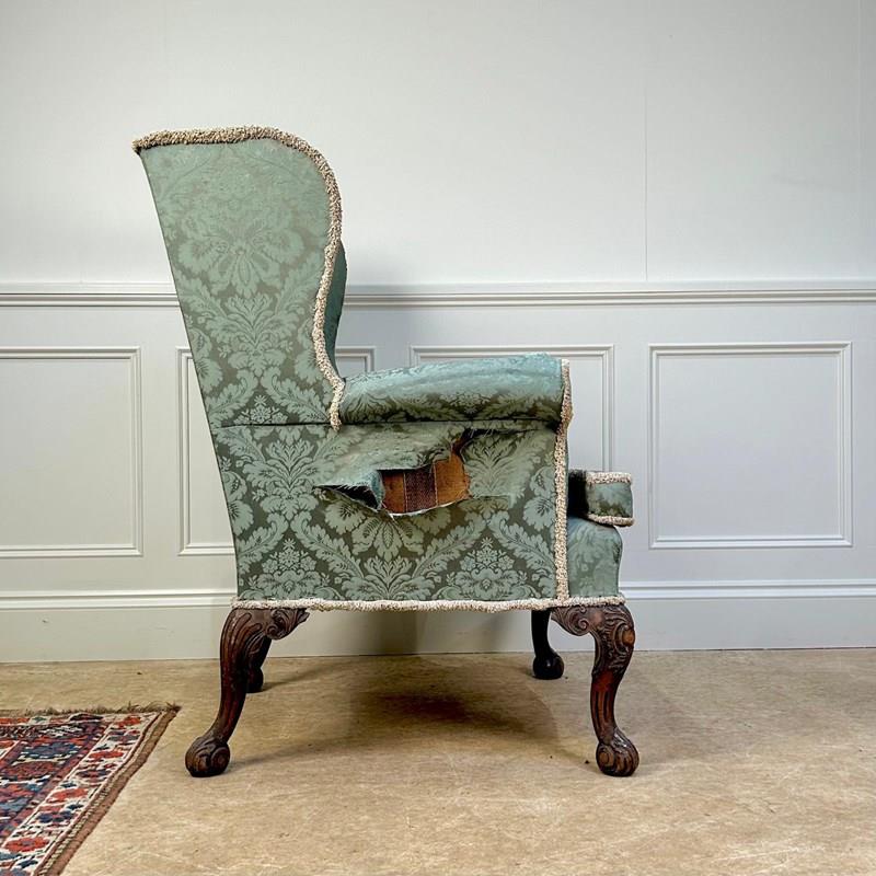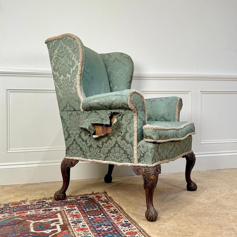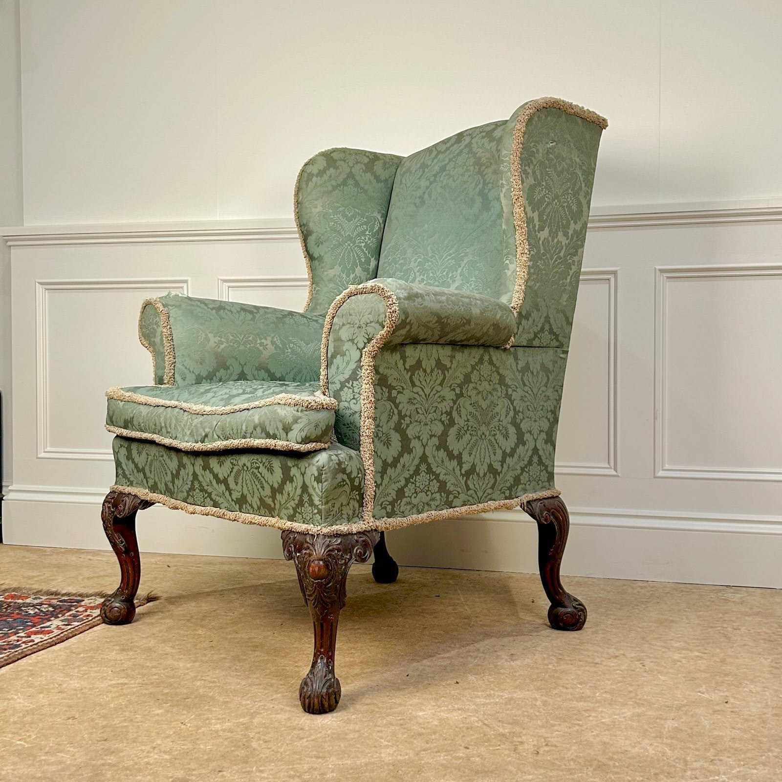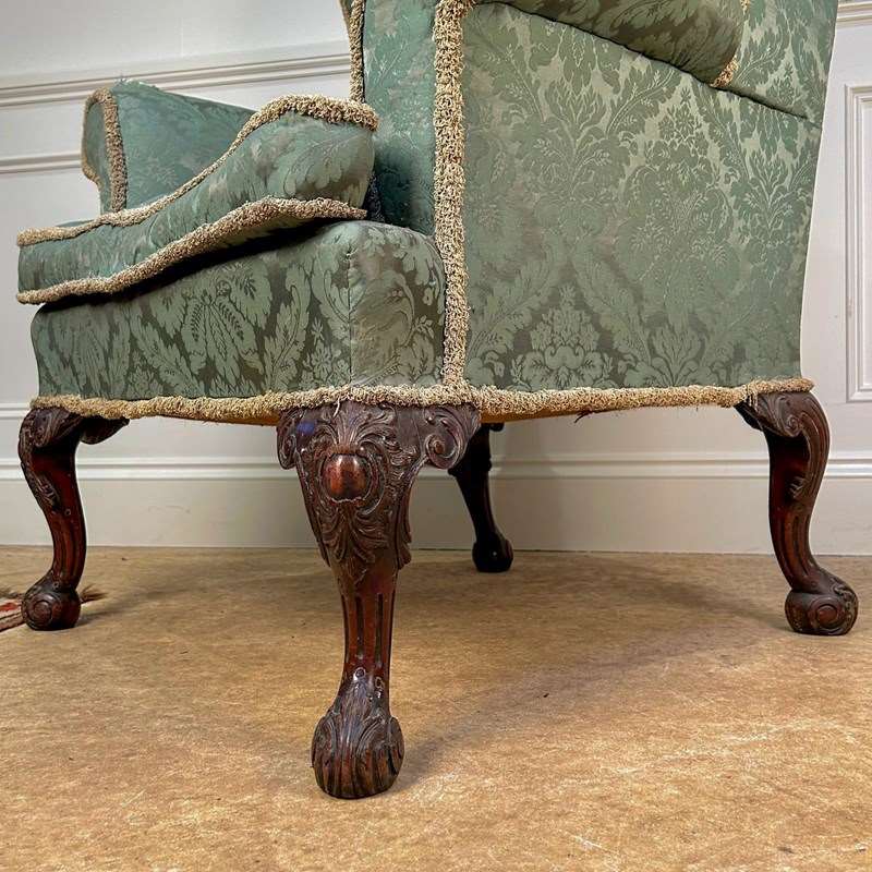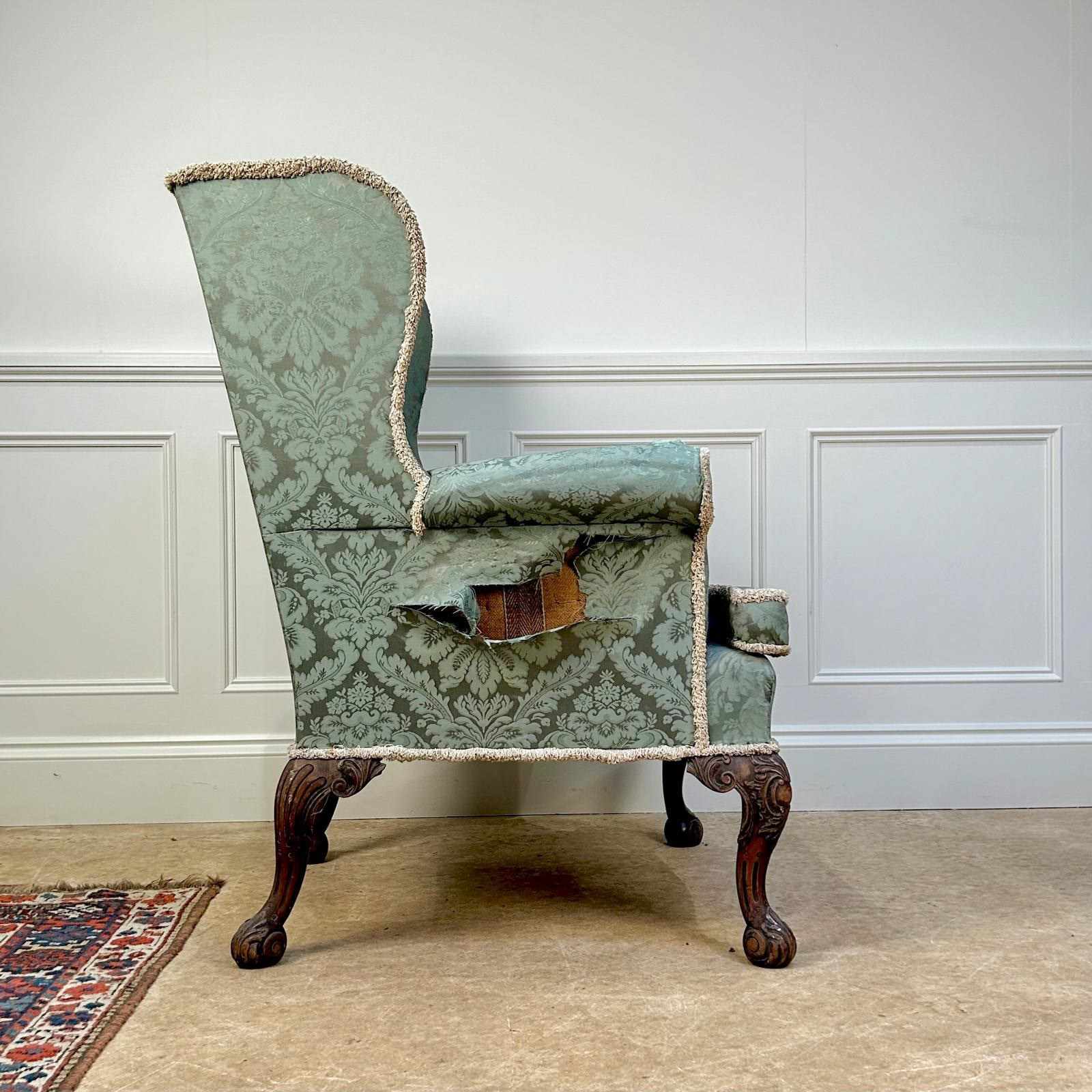 A wonderful 19th century mahogany chair in the George II style with super proportions. Having cabriole legs to both front and back with carved decoration that terminates in scrolled ball feet. Retaining the original horsehair and feather cushion with a lovely untouched finish to the mahogany legs. For upholstery, English, Circa 1860.