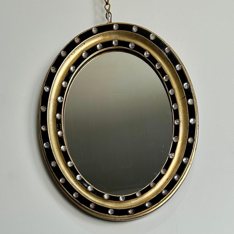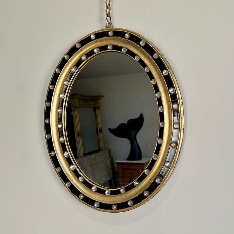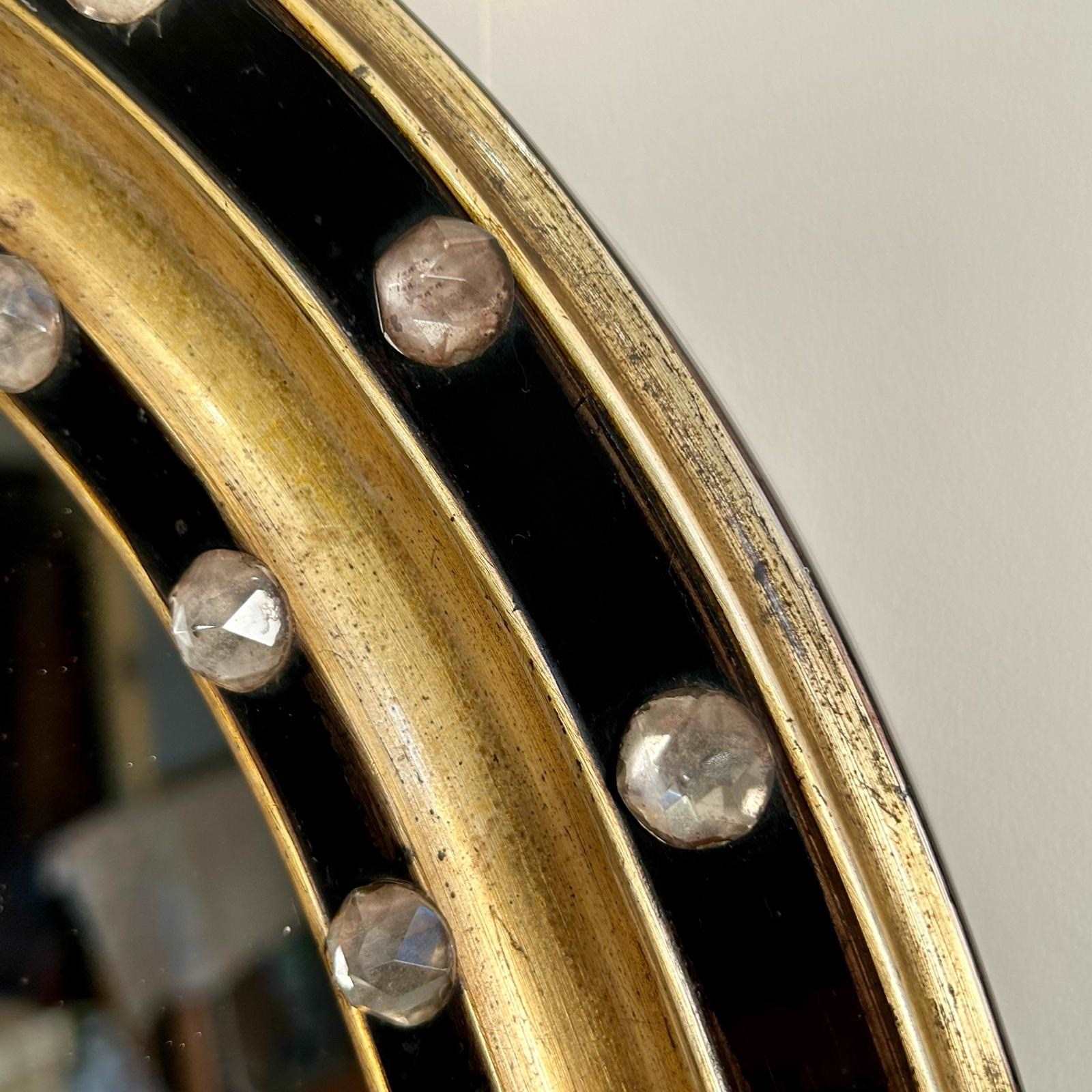 An early 19th century Irish oval mirror, having a moulded water gilded frame and ebonised surround. The frame decorated with original domed and cut glass cabochons. Retaining the original mirror plate with light foxing. Original finish throughout. Irish, Circa 1820.
