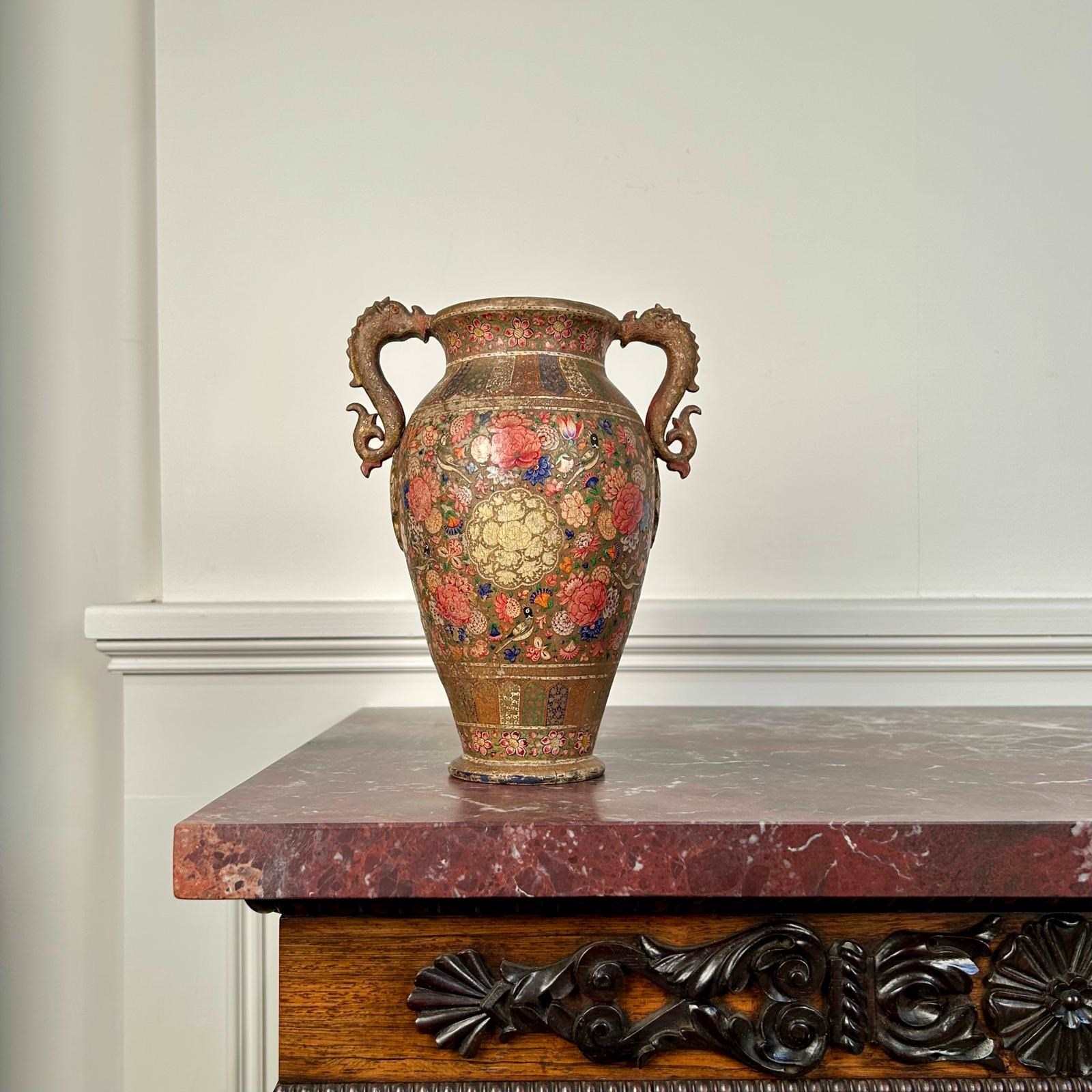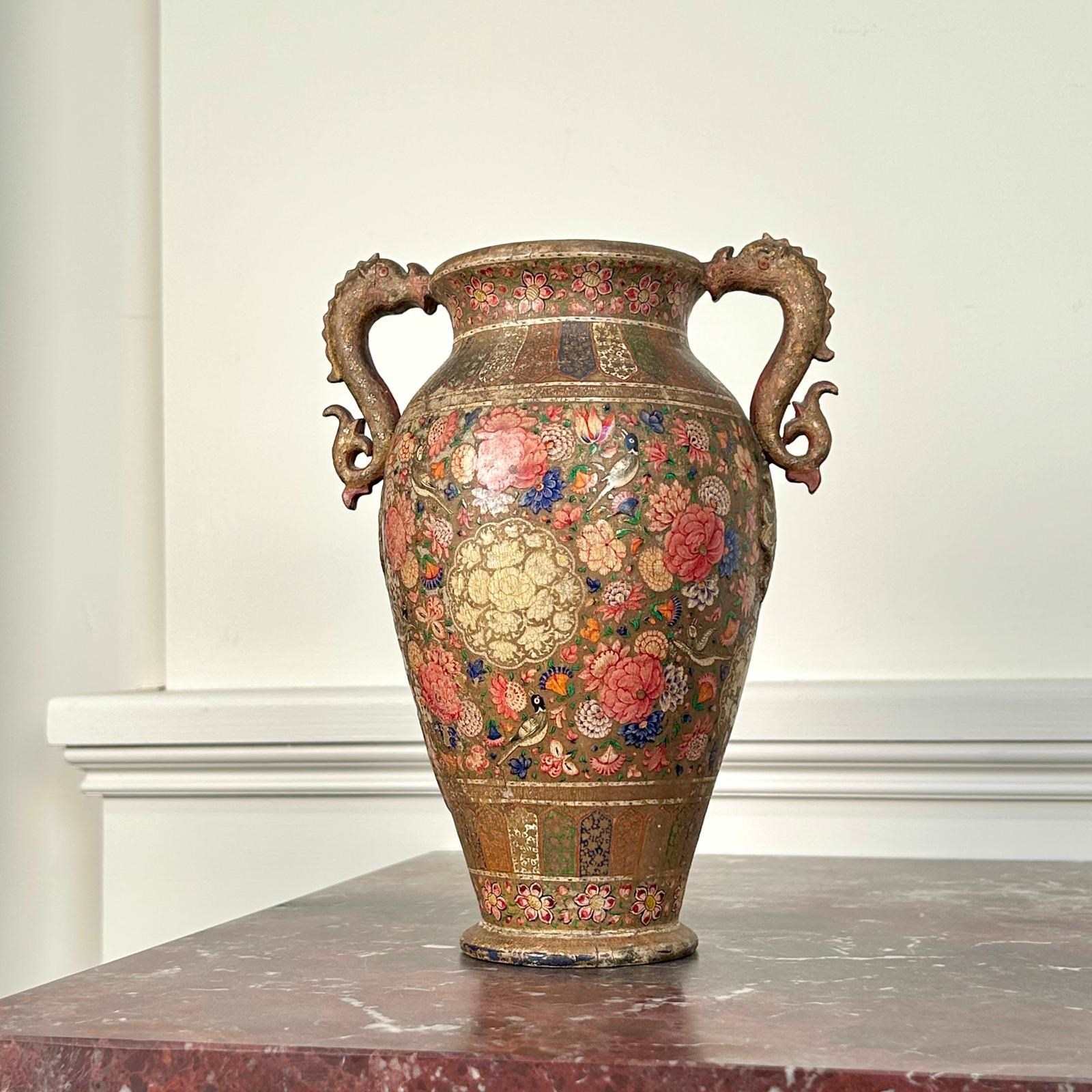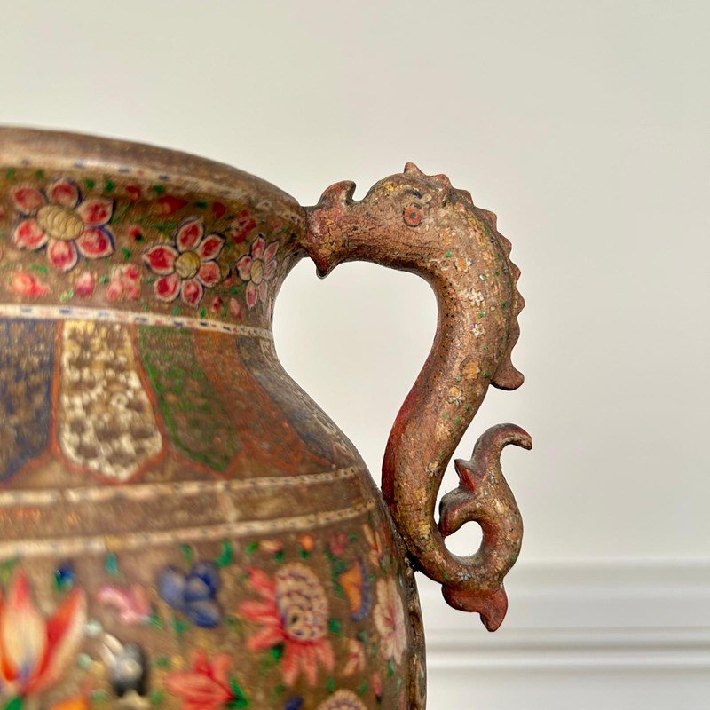 A beautiful late 19th century Kashmiri vase with lovely Seahorse handles. Retaining the original hand painted decoration depicting flowers and birds. Indian, Circa 1890.