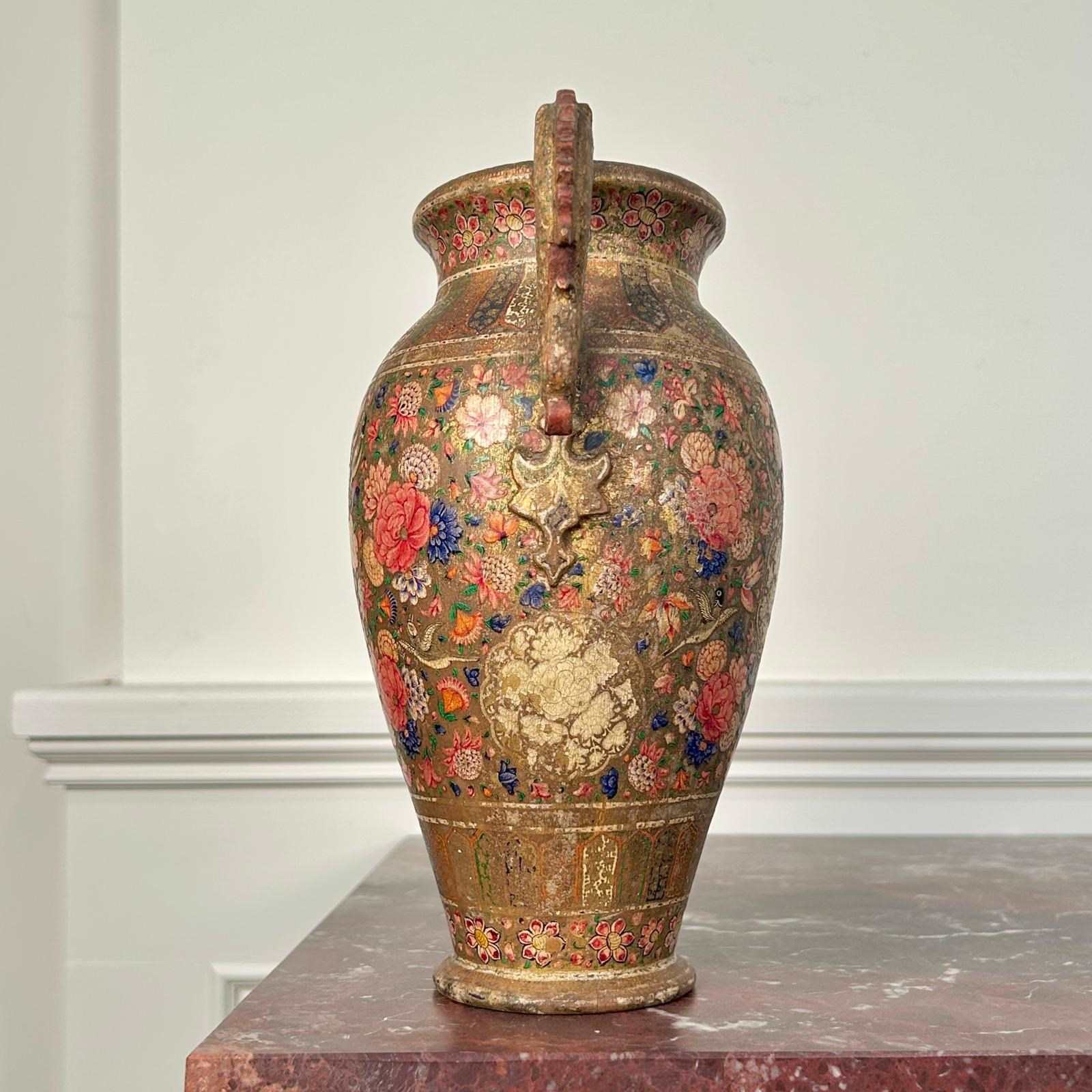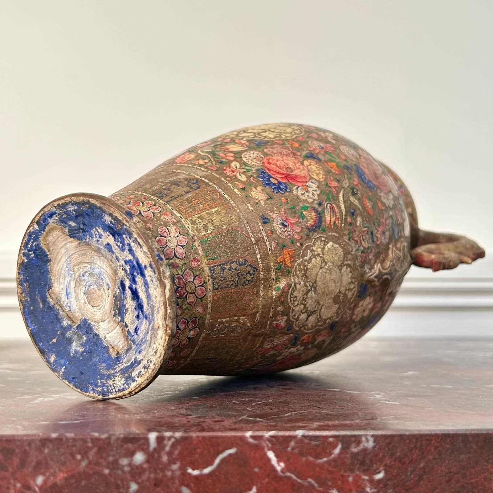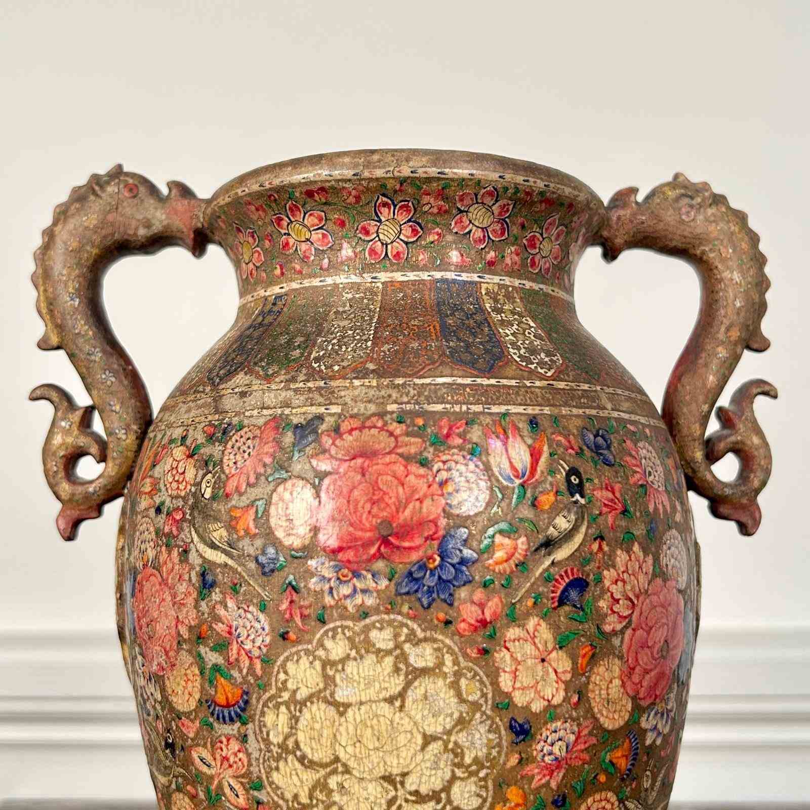 A beautiful late 19th century Kashmiri vase with lovely Seahorse handles. Retaining the original hand painted decoration depicting flowers and birds. Indian, Circa 1890.