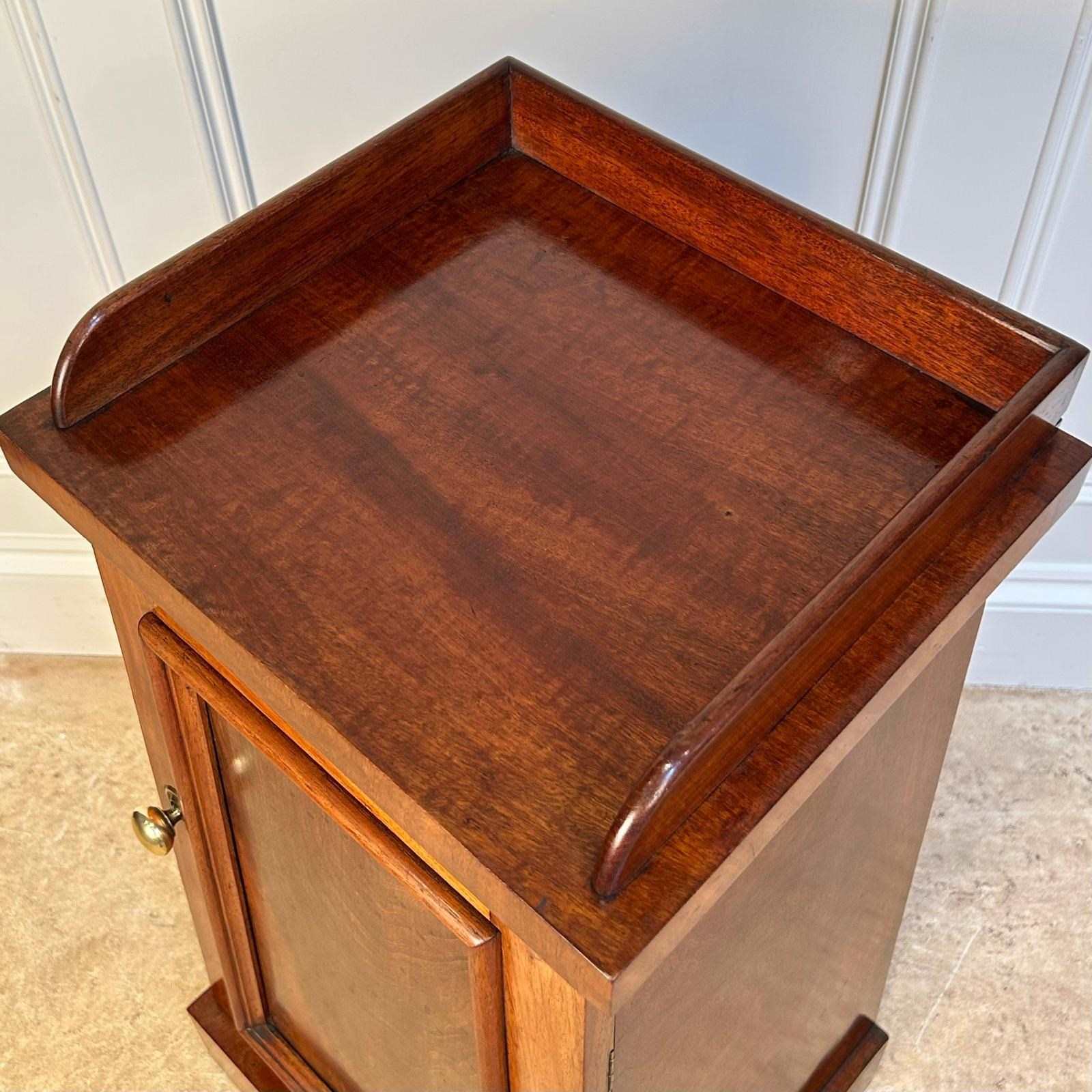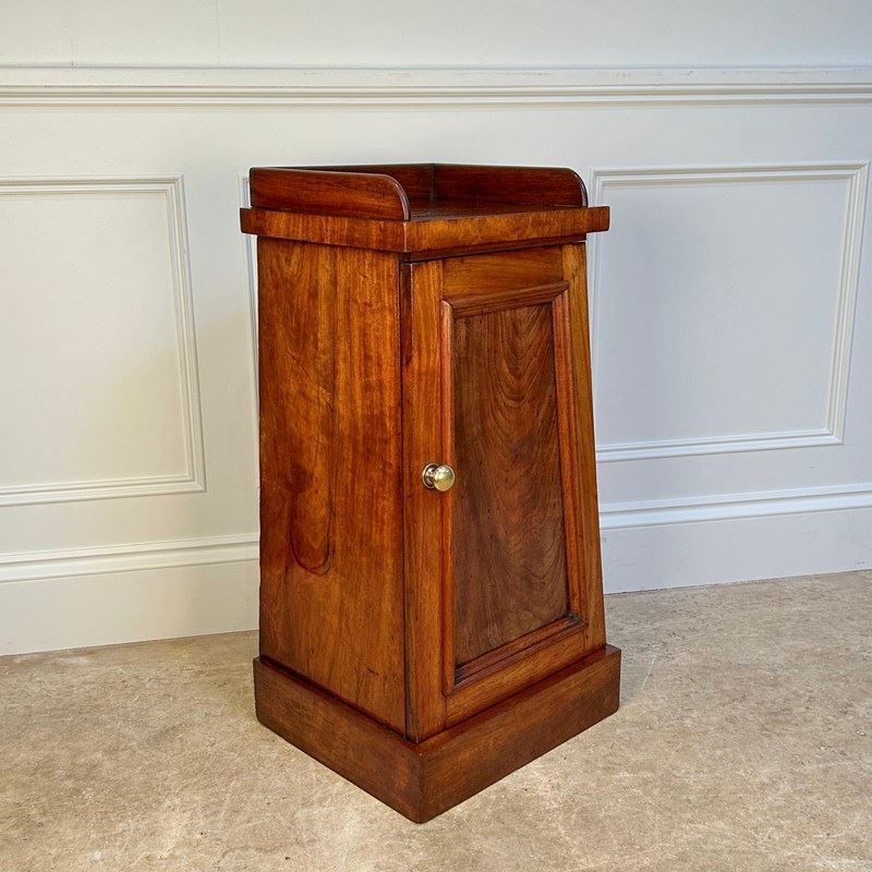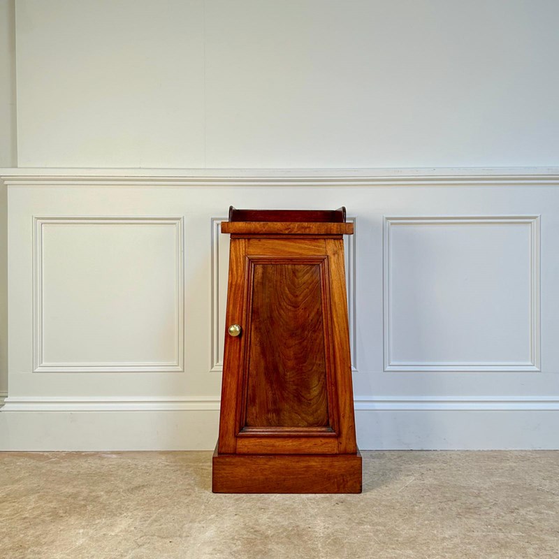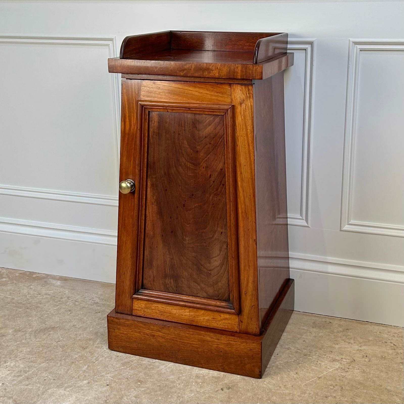 A 19th century obeliscal bedside cabinet in mahogany. Having a galleried top with tapering form and raised on the plinth base. The panelled door opens to reveal a single shelf interior. Lovely original condition and colour throughout. In the manner of Gillows, English, Circa 1830.