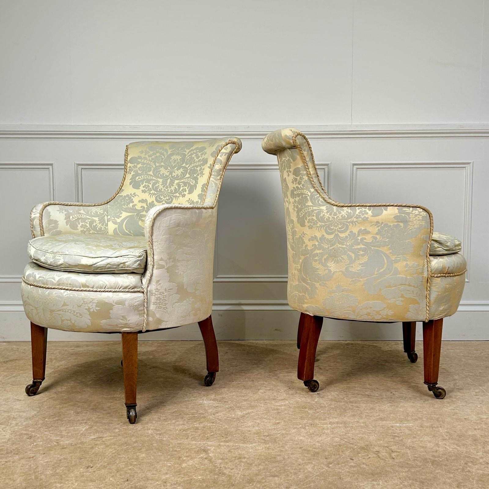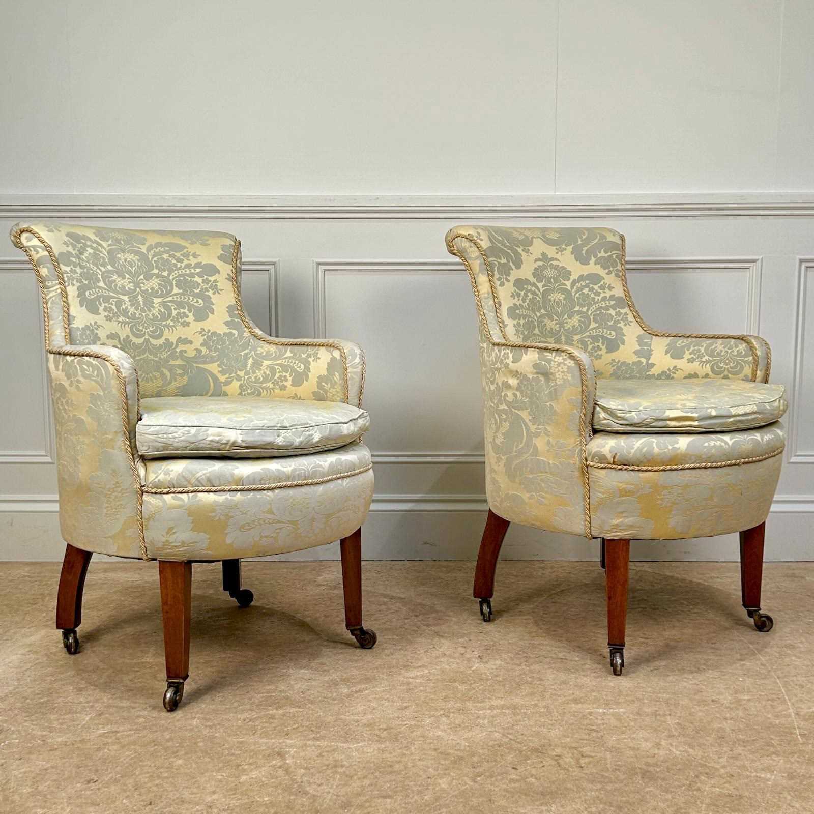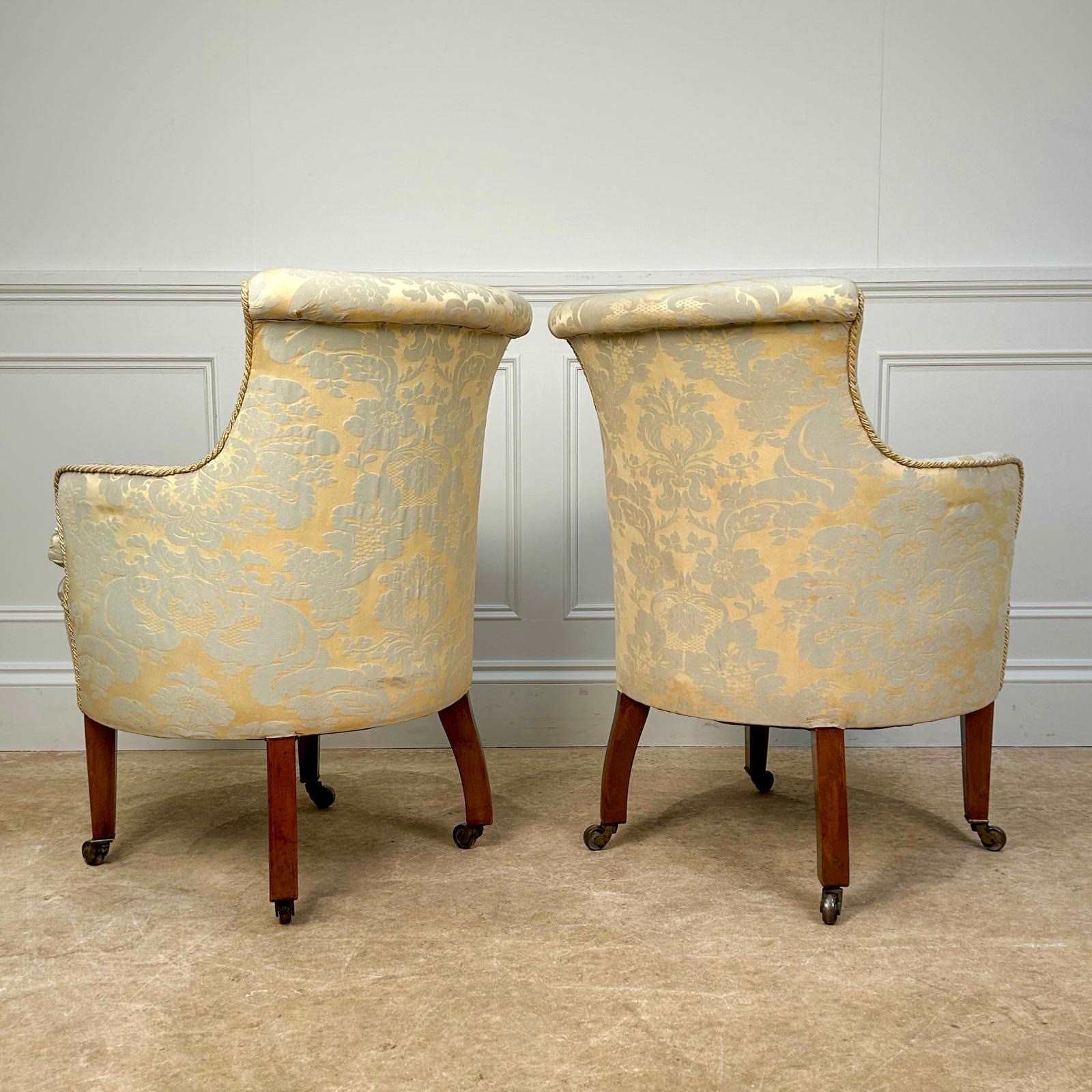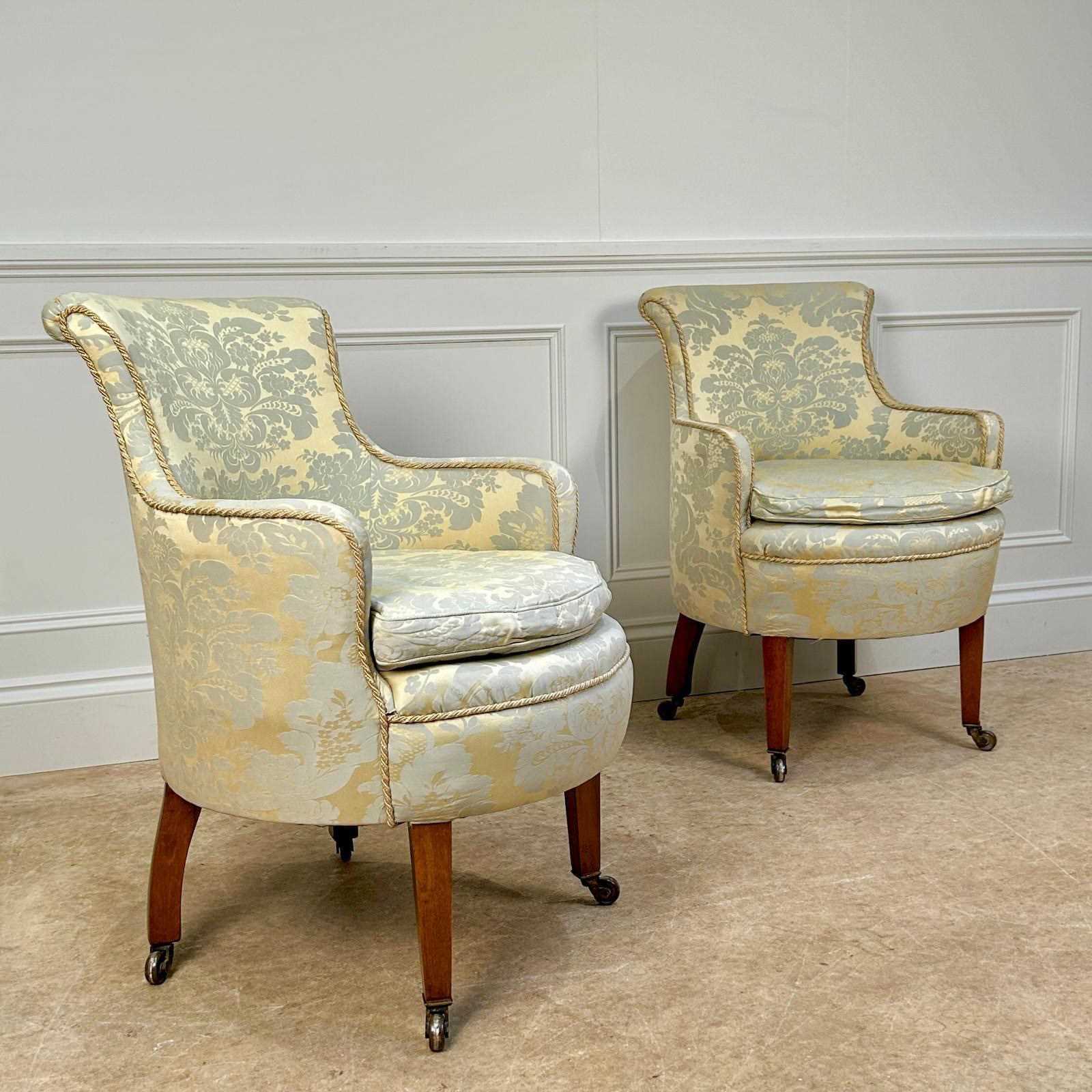 A rare pair of late 19th century upholstered armchairs by Harrods. Having a scrolled back with a sprung seat and feather cushion. Raised on tapering mahogany front legs with splayed back legs. Retaining the original stamped brass castors. Lovely strong frames and in super original condition throughout, retaining the original horsehair and for re-upholstery. English, Circa 1895.